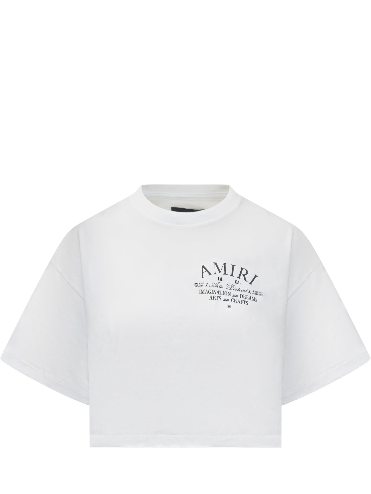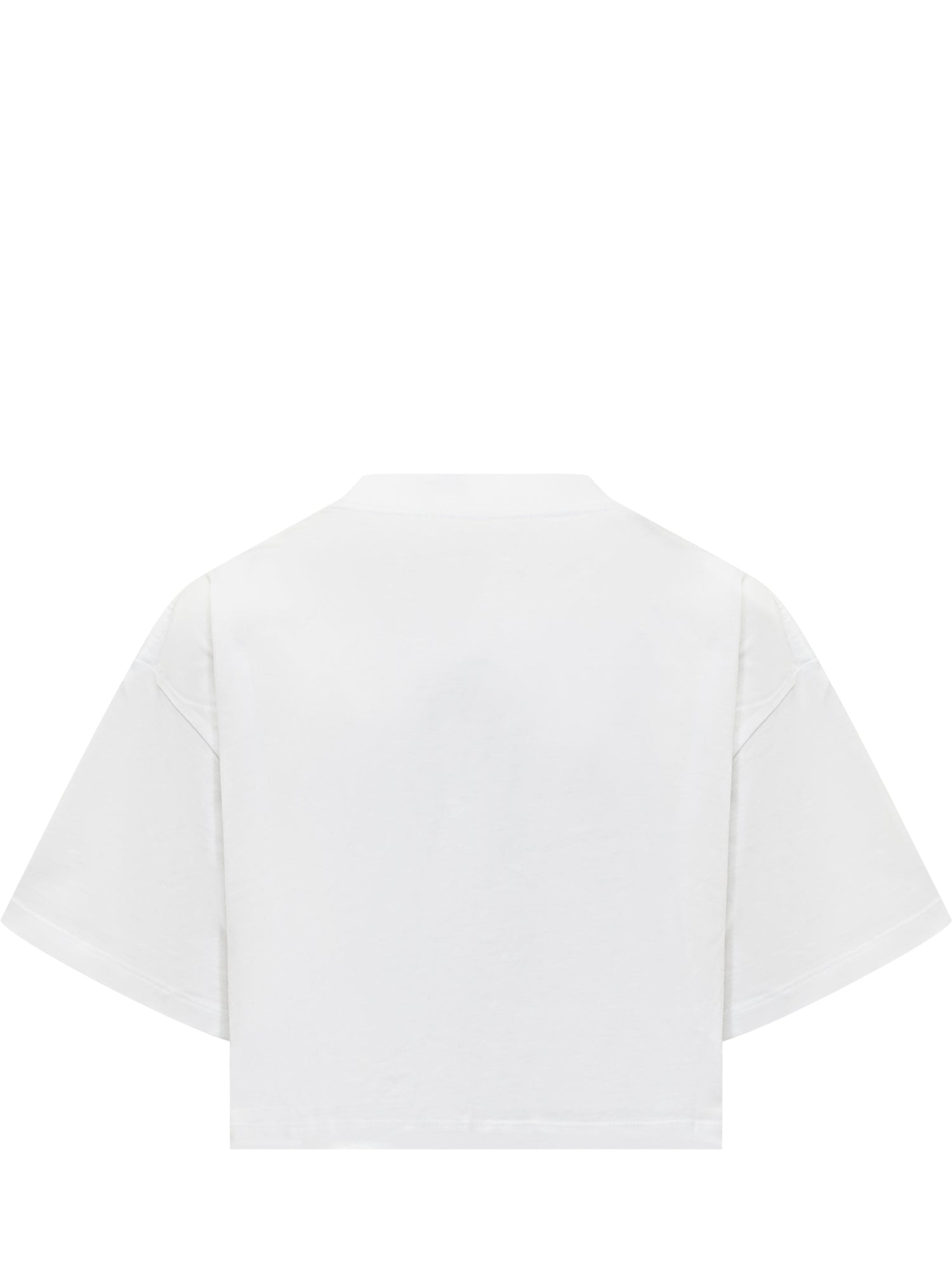 T-shirt crop in cotone con linea ampia e stampa frontale a contrasto. Un modello essenziale che aggiunge un tocco moderno e versatile ai look quotidiani.