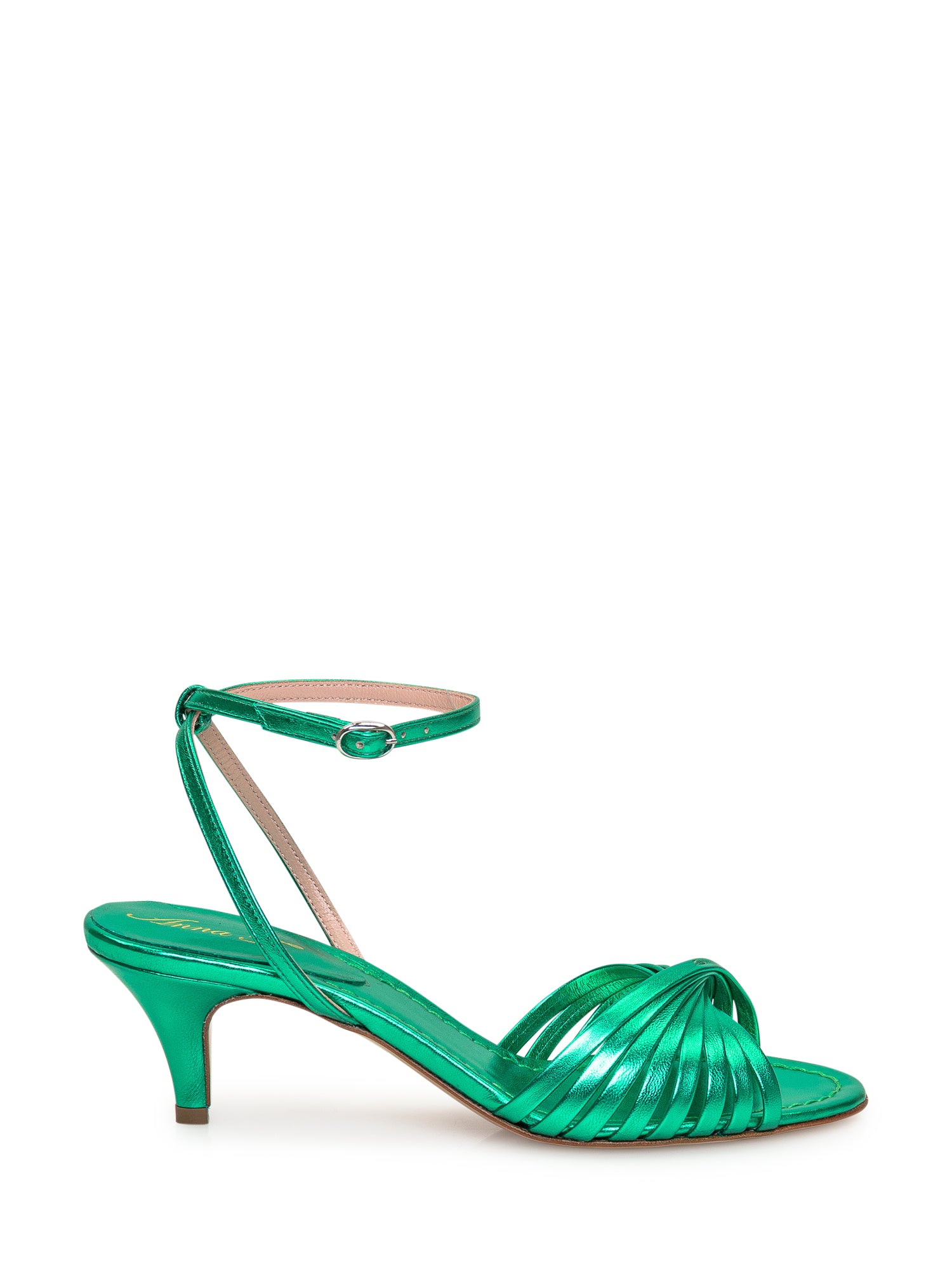 Sandalo verde con tacco. Cinturino alla caviglia. Intrecciato sul davanti.