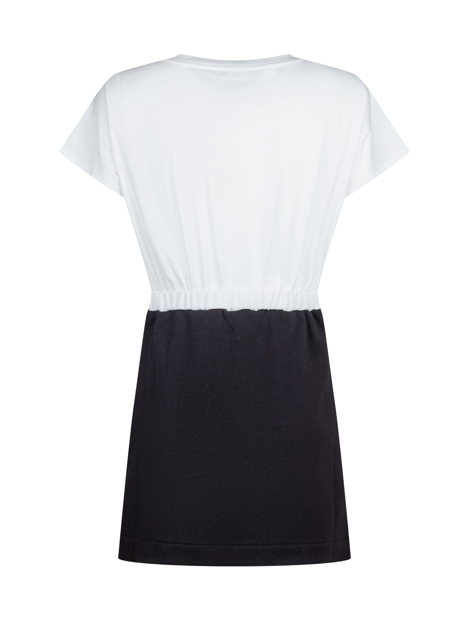 Abito in cotone bianco e nero. Maniche corte. Girocollo. Vita elasticizzata sul retro.