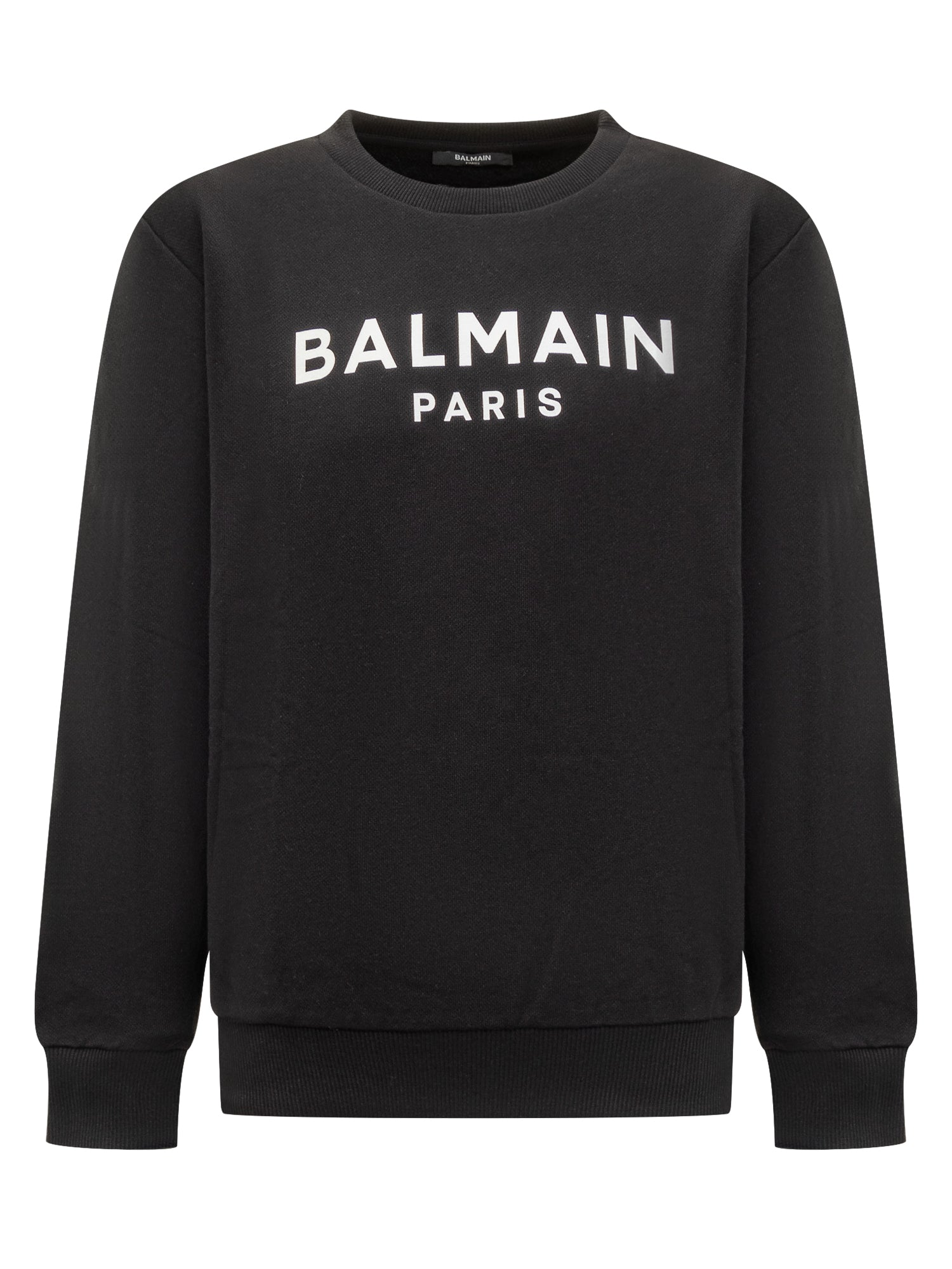 Felpa nera da bambino firmata Balmain, con il classico logo stampato in bianco sul petto.