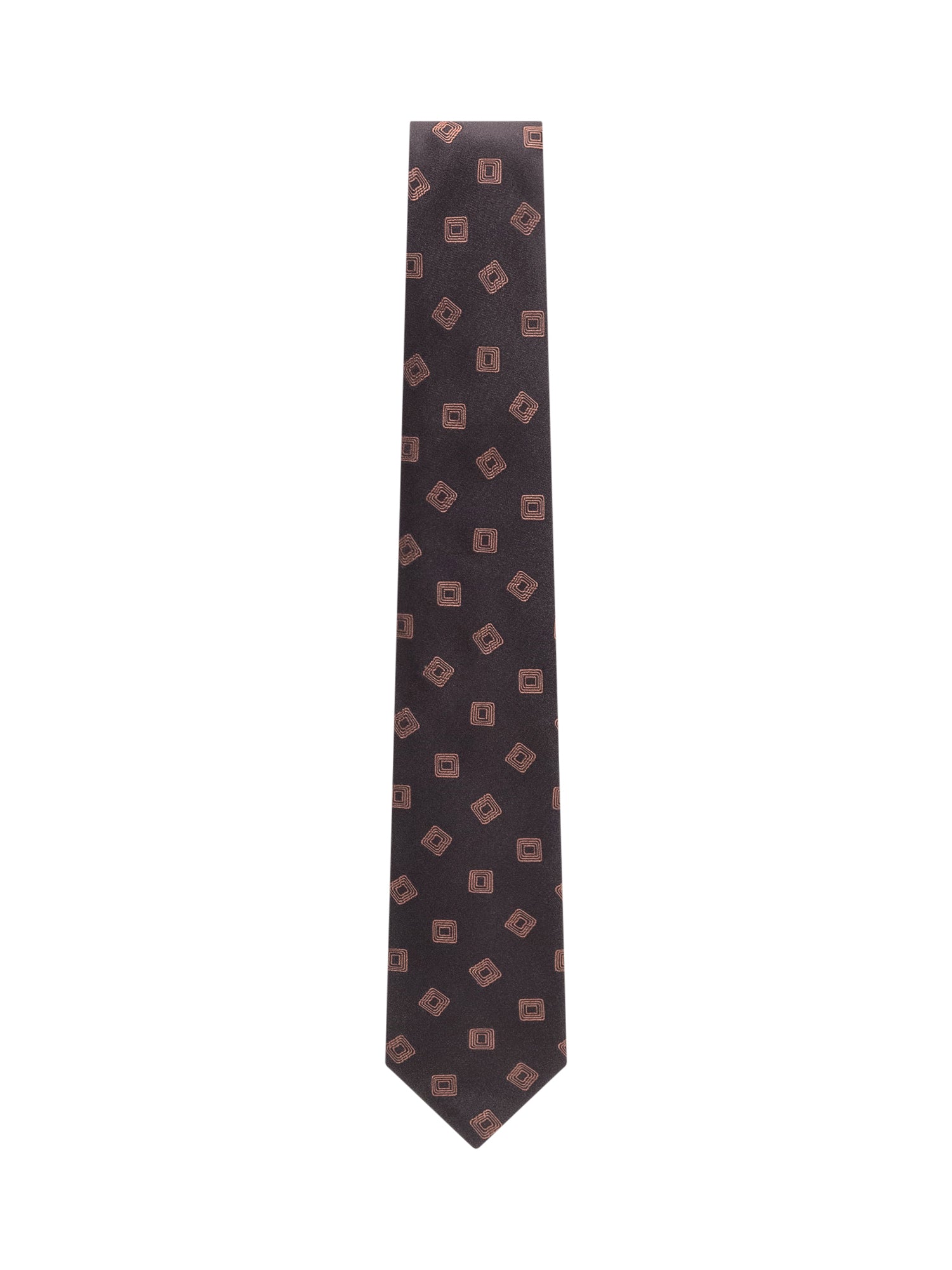 Cravatta marrone Barbanapoli in seta con fantasia a quadri concentrici rosa.