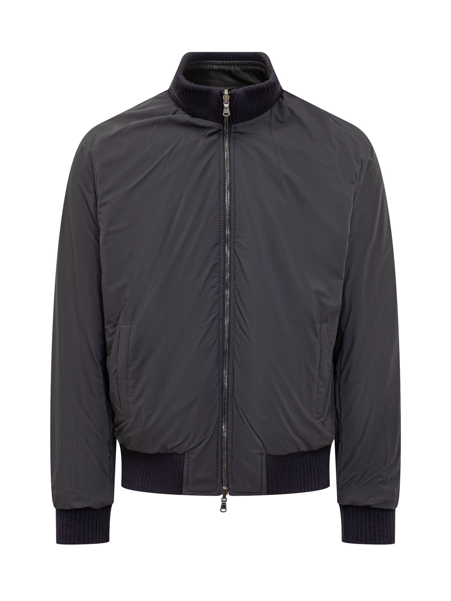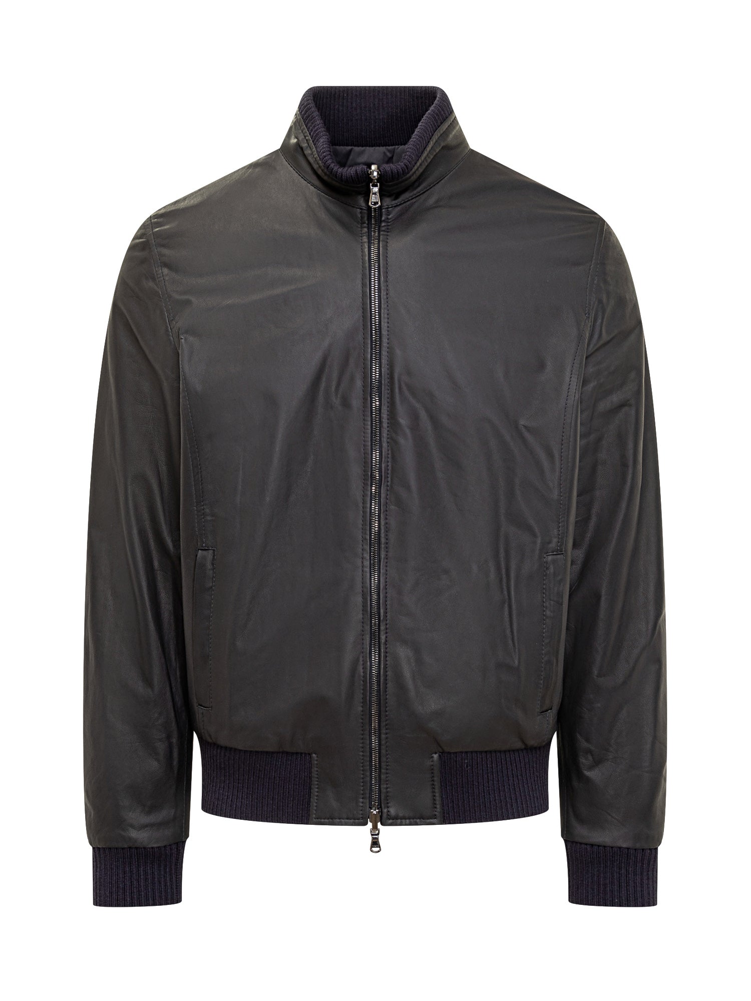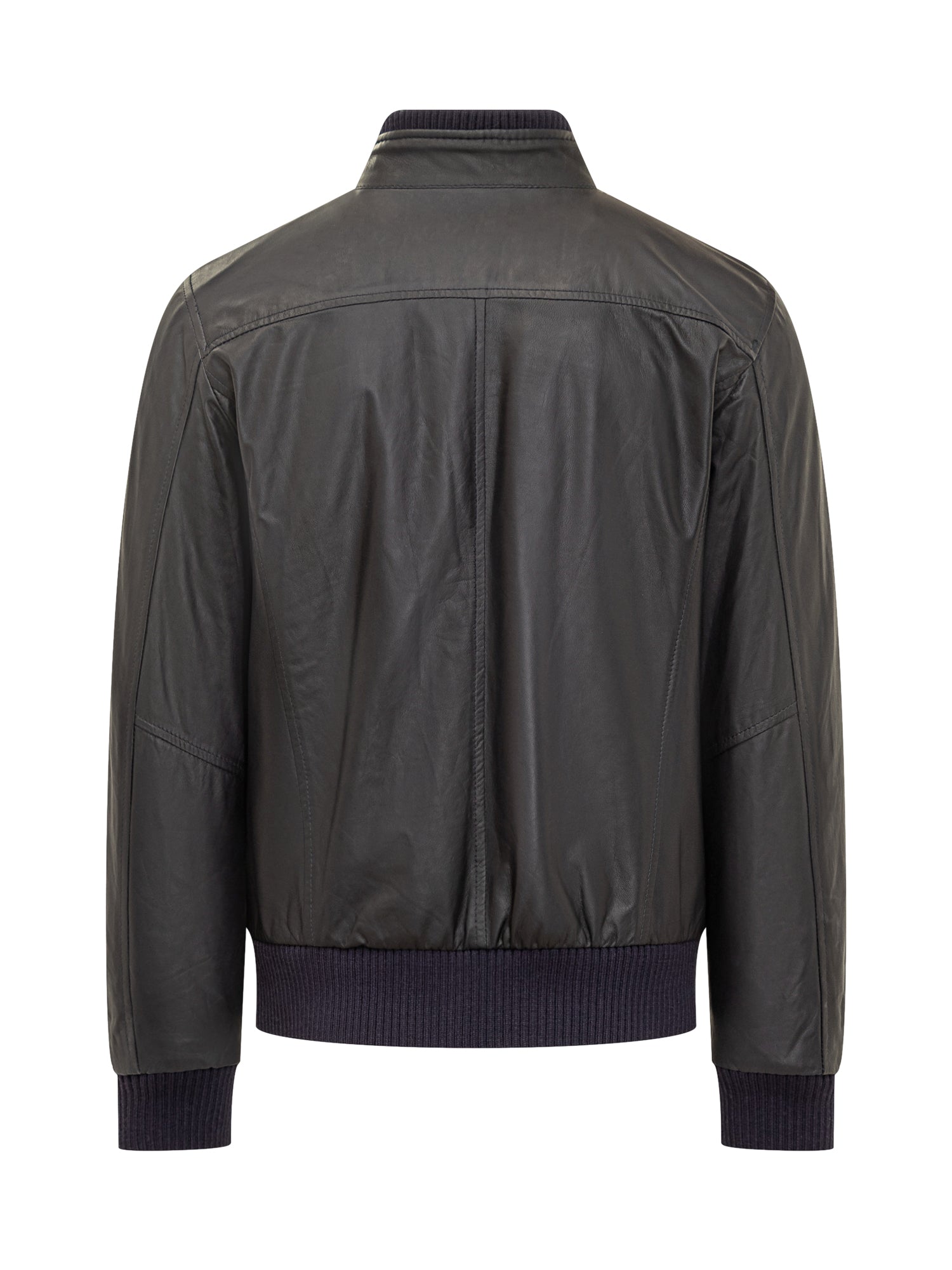 Giacca bomber Barba in pelle nera con collo, polsini e fondo in maglia a coste. Chiusura con zip a doppio cursore e tasche laterali