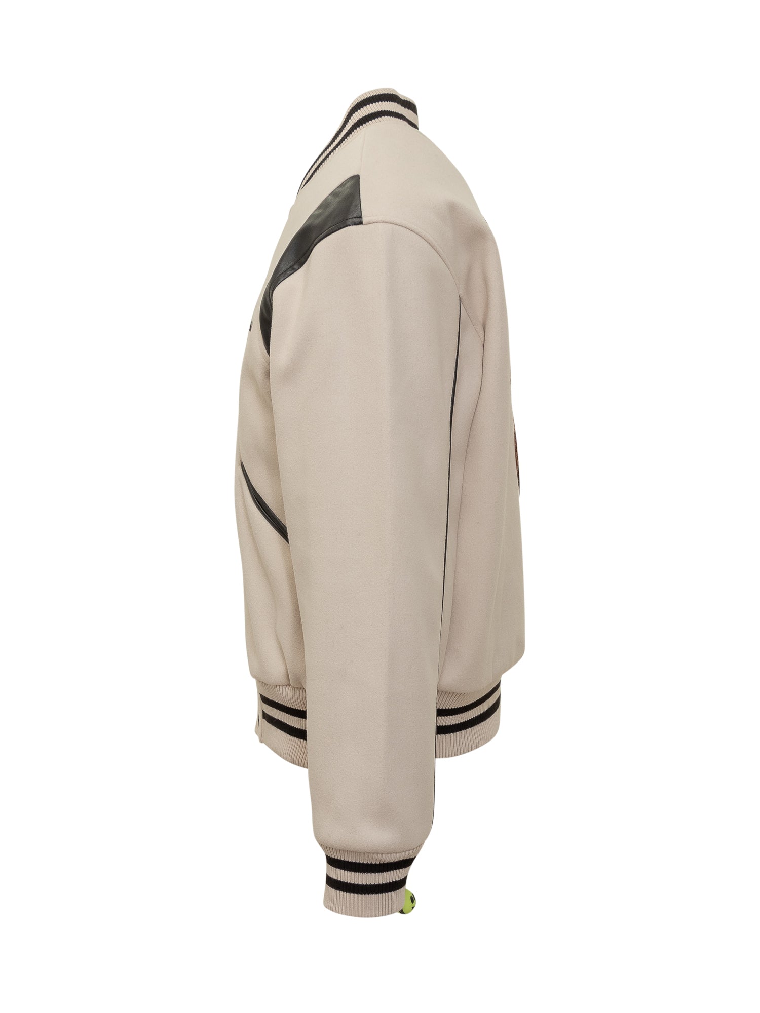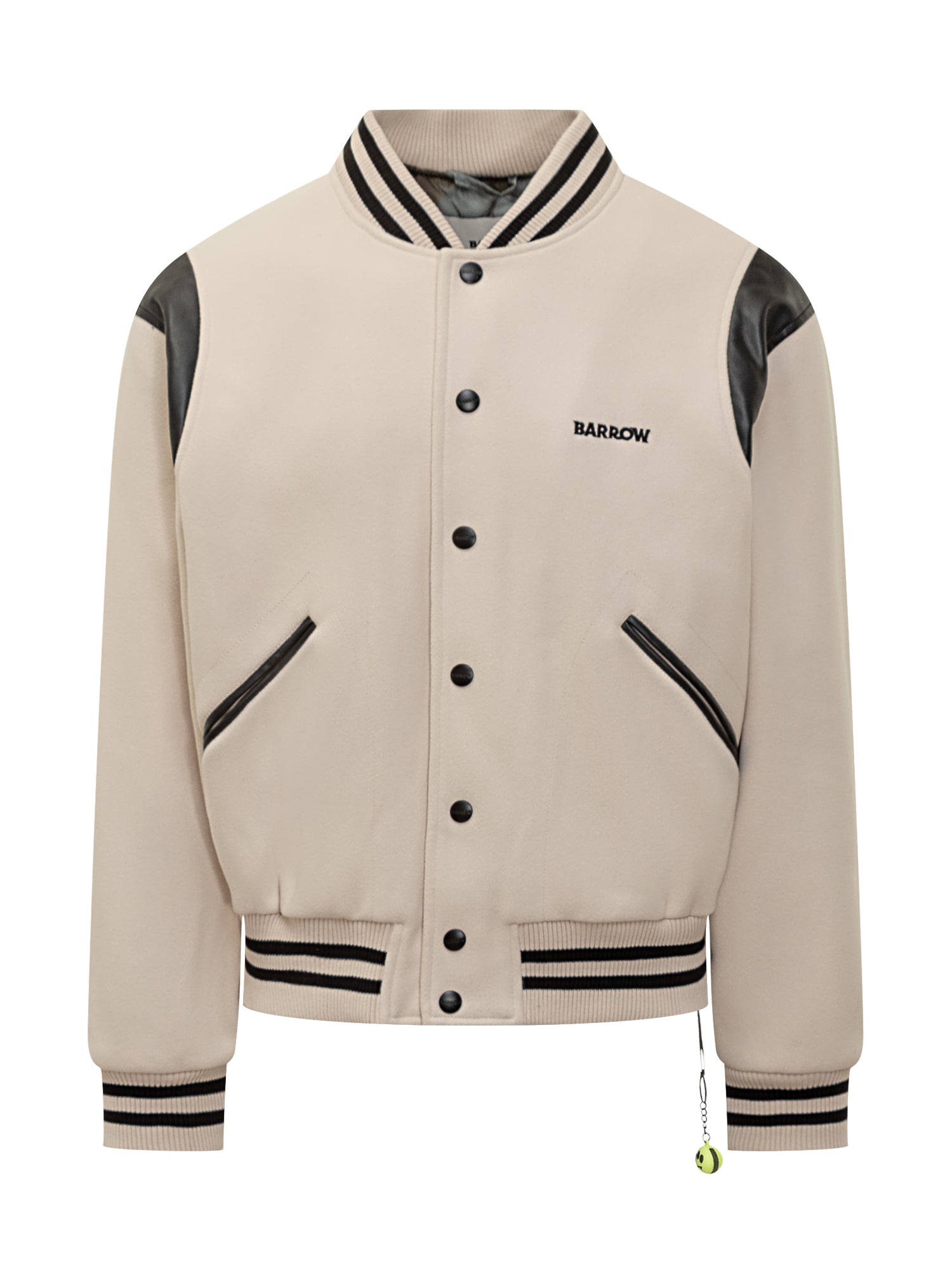 Giacca varsity Barrow in lana beige con inserti in ecopelle nera. Colletto e polsini a righe, chiusura con bottoni a pressione e logo ricamato sul petto.