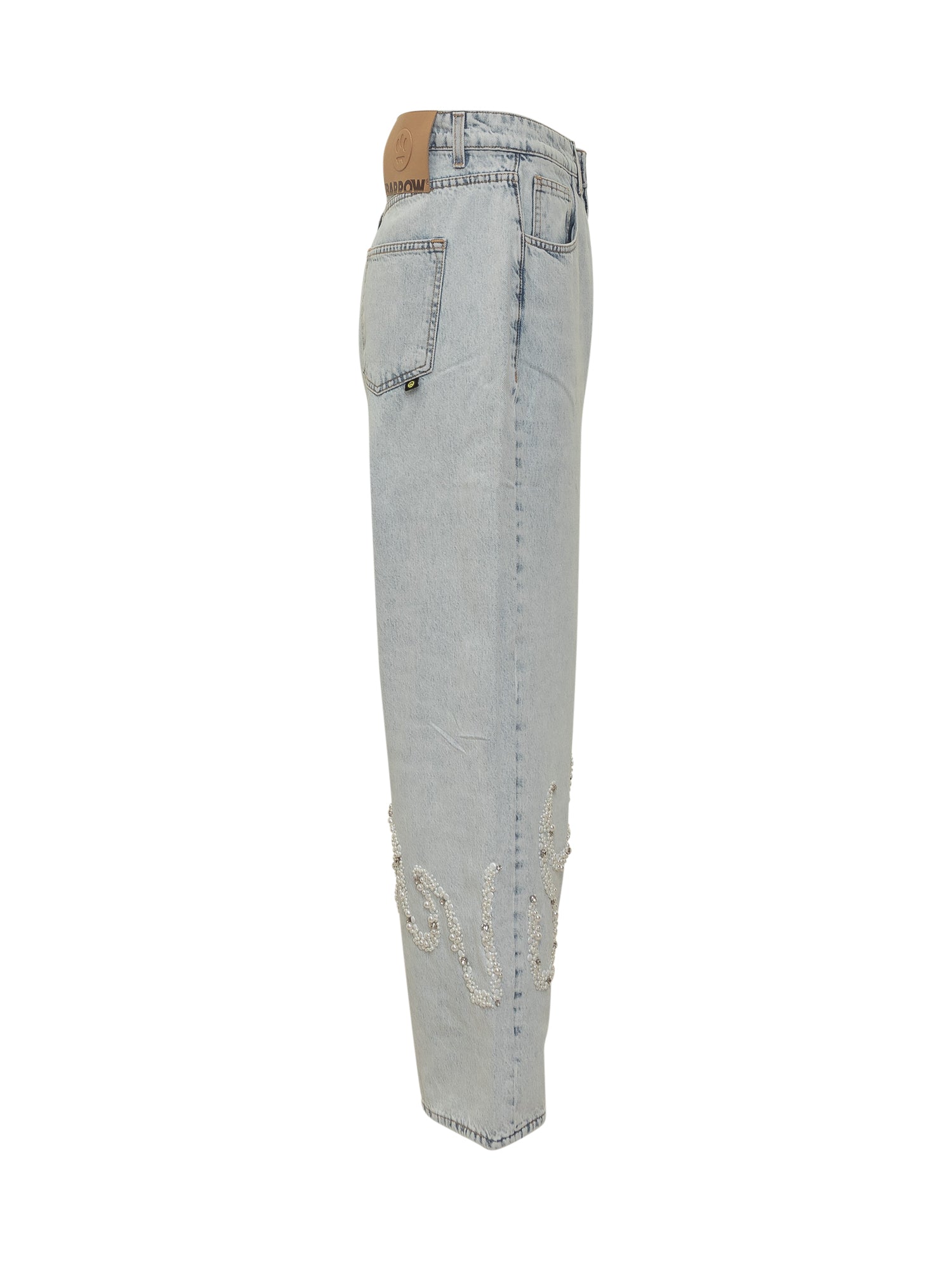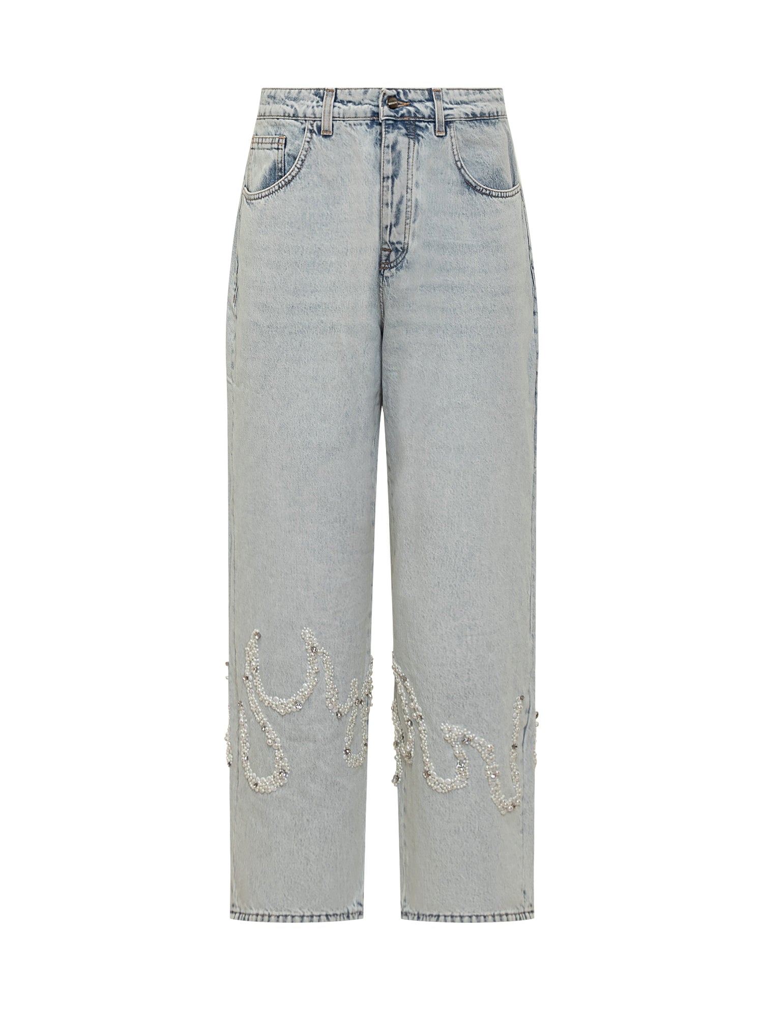 Jeans Barrow in denim chiaro con ricami a motivo fiamma realizzati con perline e strass. Taglio dritto e vita alta.