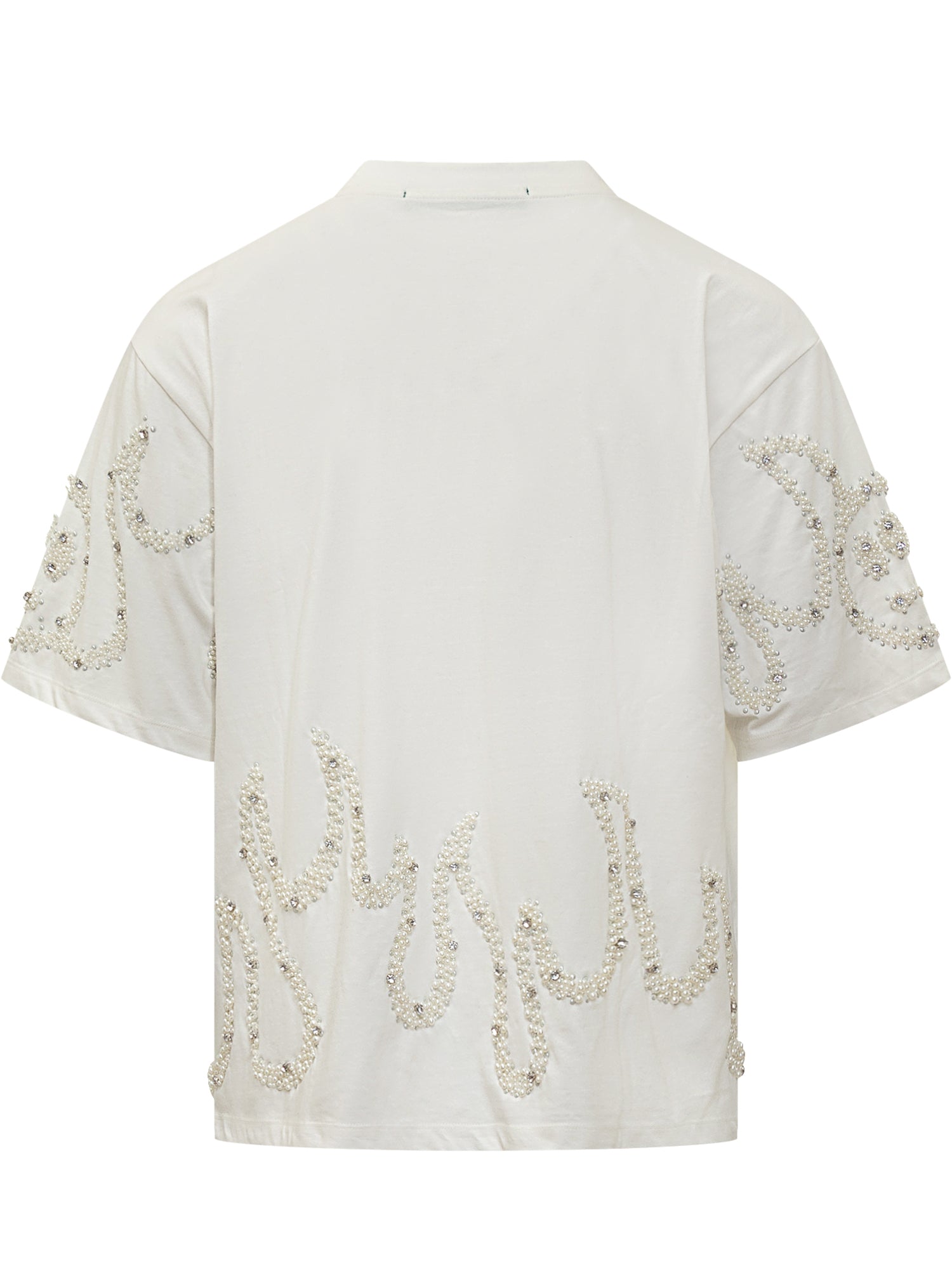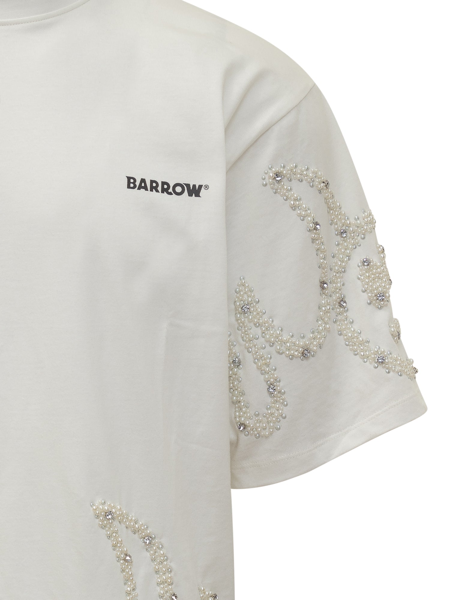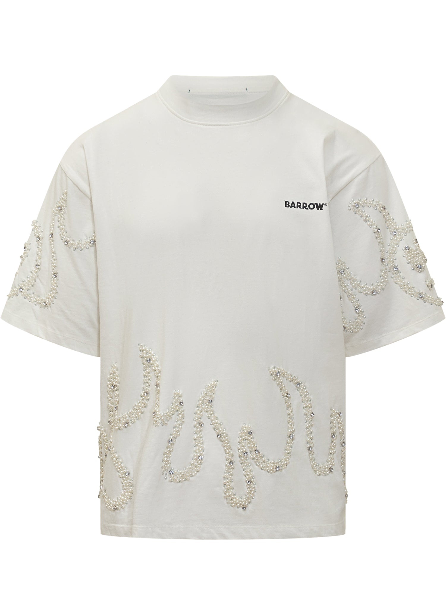 T-shirt Barrow in cotone bianco decorata con motivi a fiamma realizzati in perline e strass. Logo ricamato sul petto e taglio over.