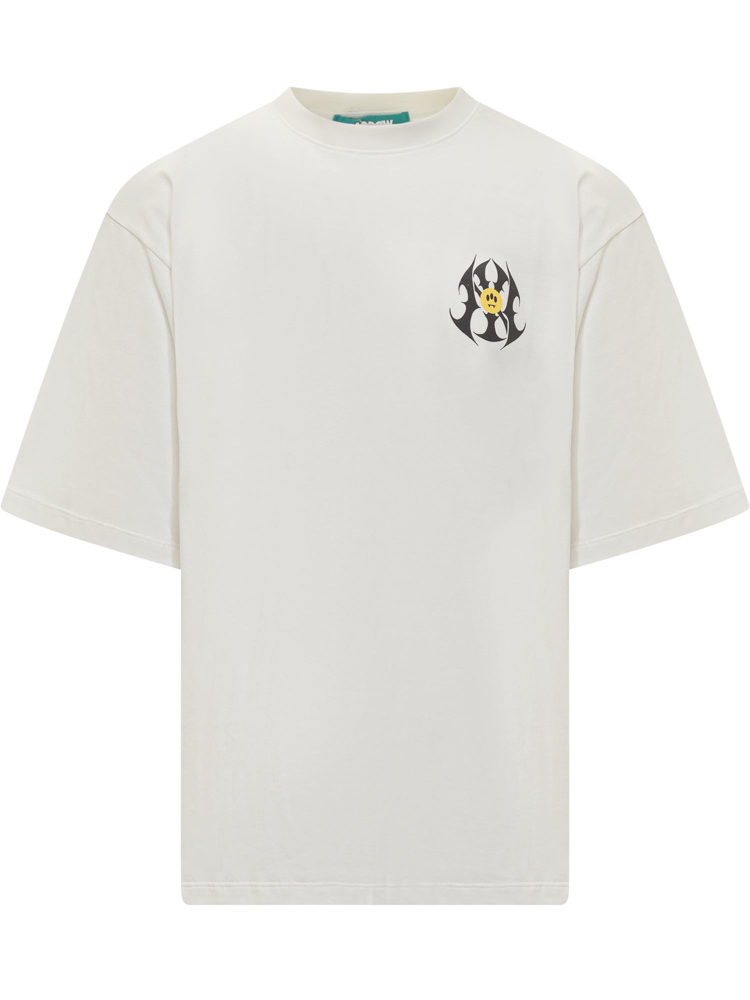 T-shirt in cotone bianco con grafica tribale e smiley fluo Barrow sul petto. Vestibilità oversize, perfetta per outfit street e originali.