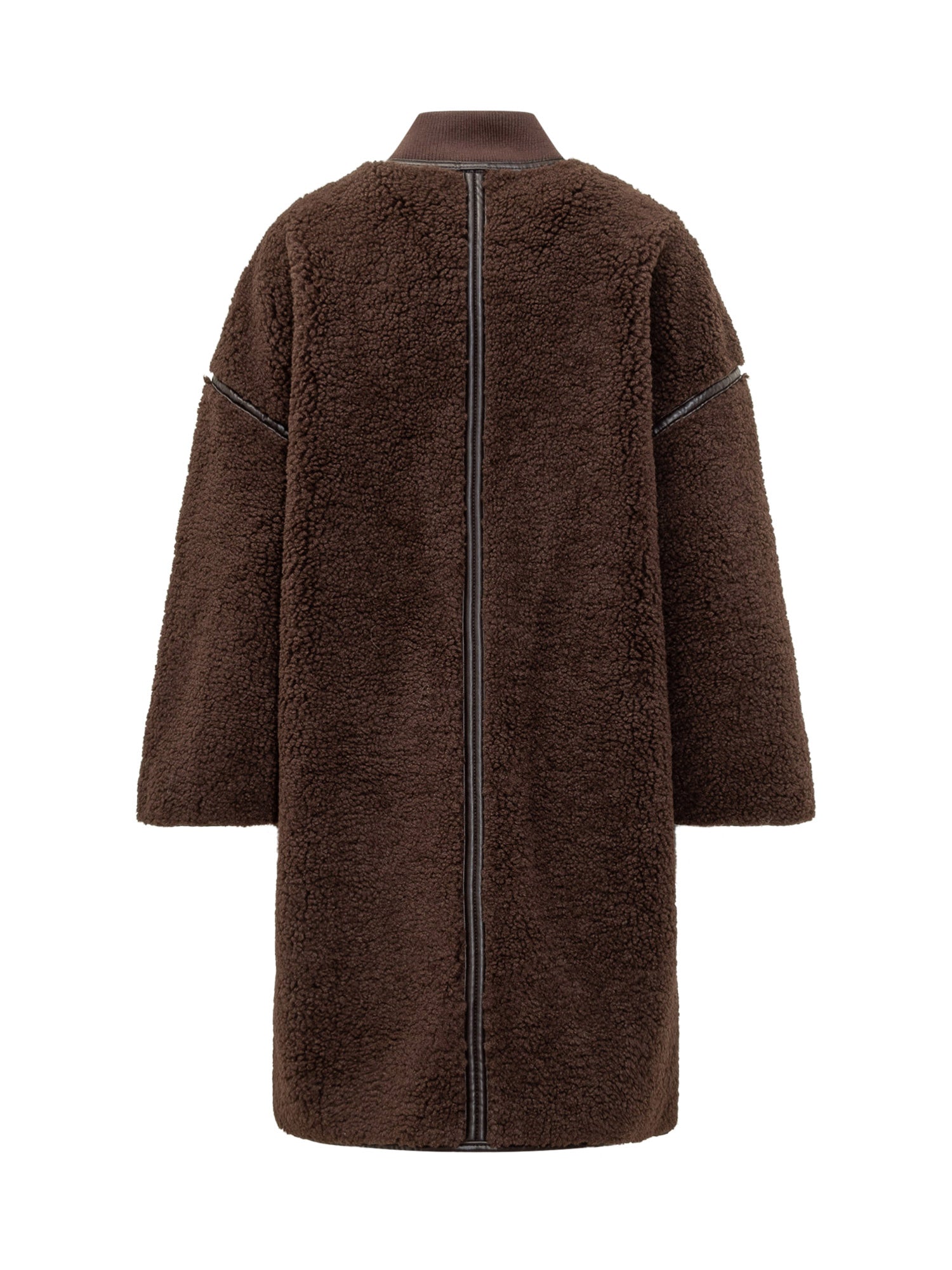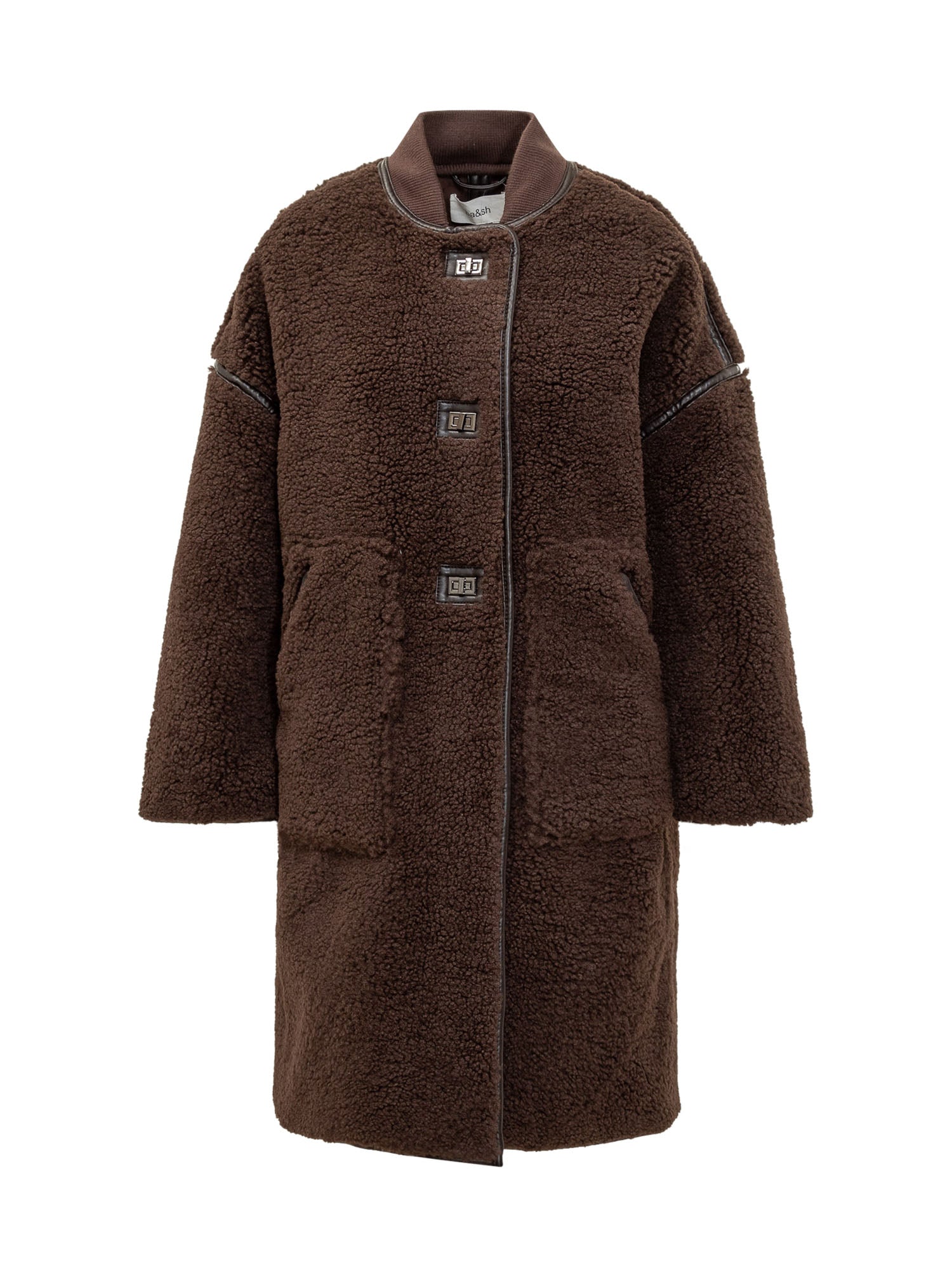 Cappotto Ba&Sh in morbido shearling marrone con dettagli in pelle e chiusura a ganci.