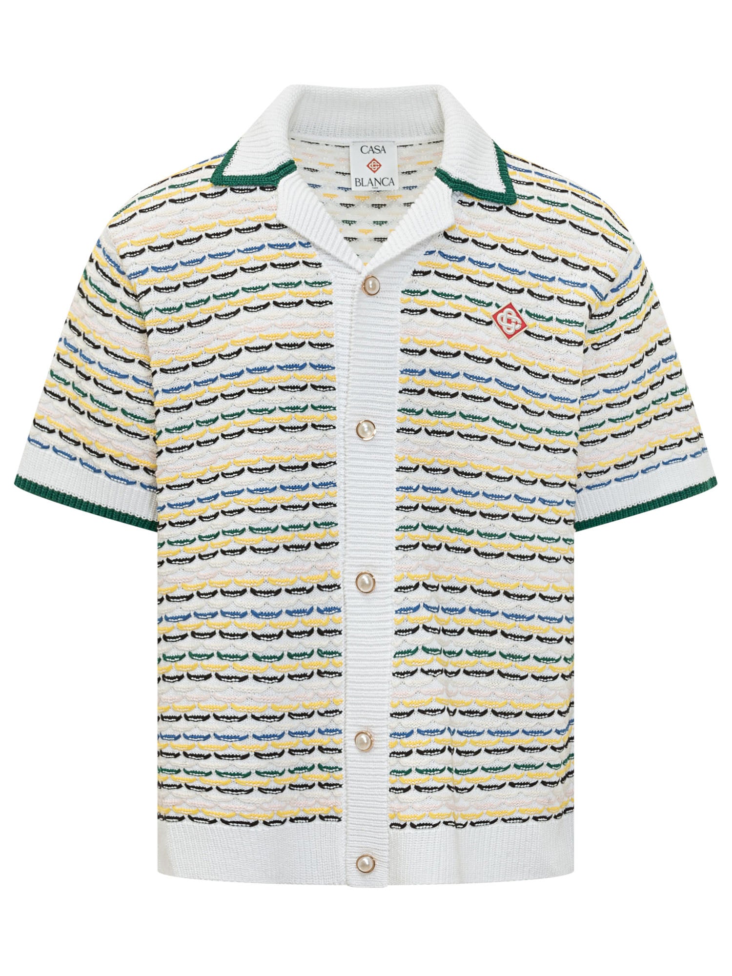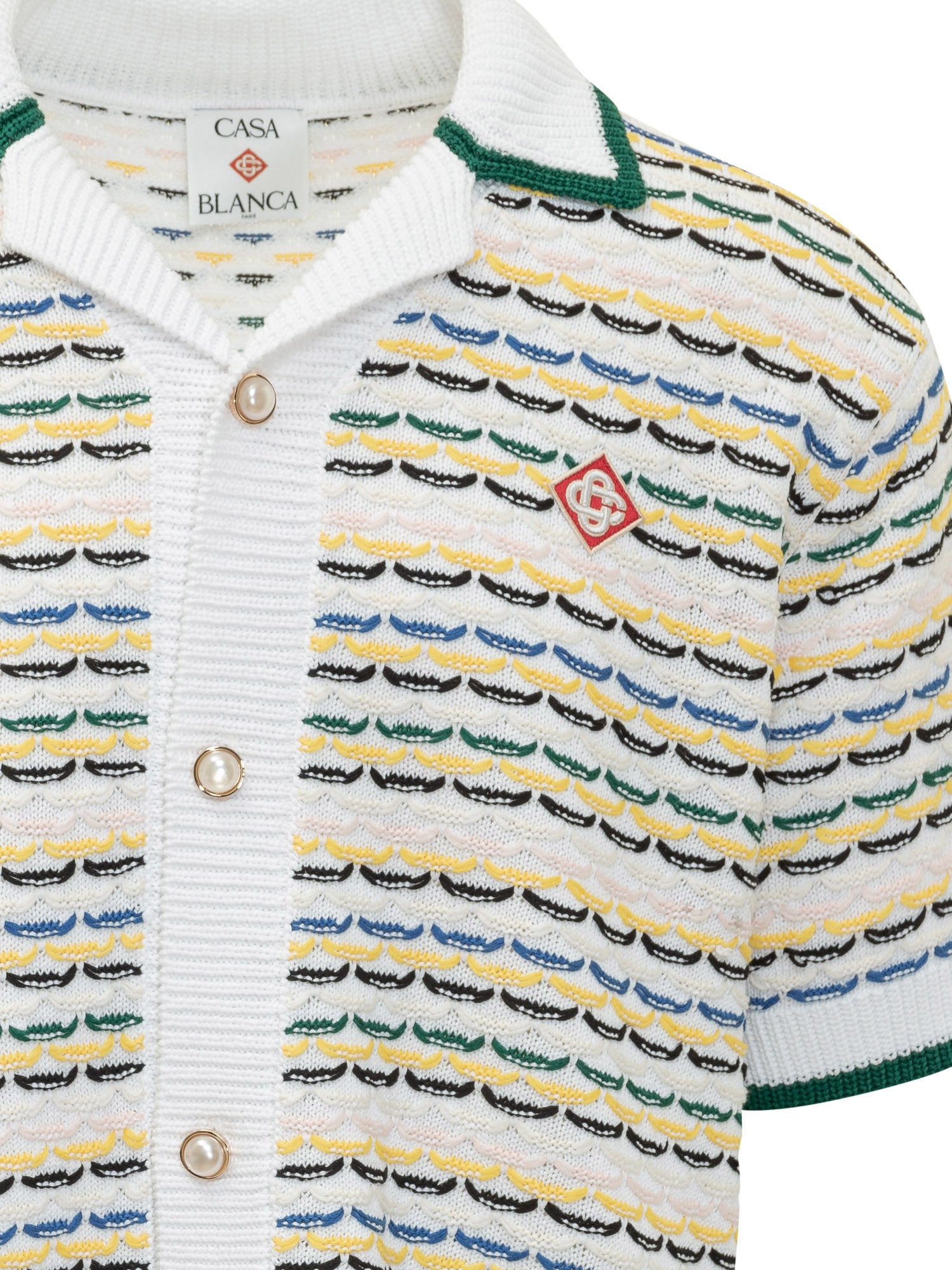 Cardigan in maglia a maniche corte con lavorazione testurizzata e motivo grafico all over. Chiusura frontale con bottoni e colletto aperto per un look raffinato ma rilassato.