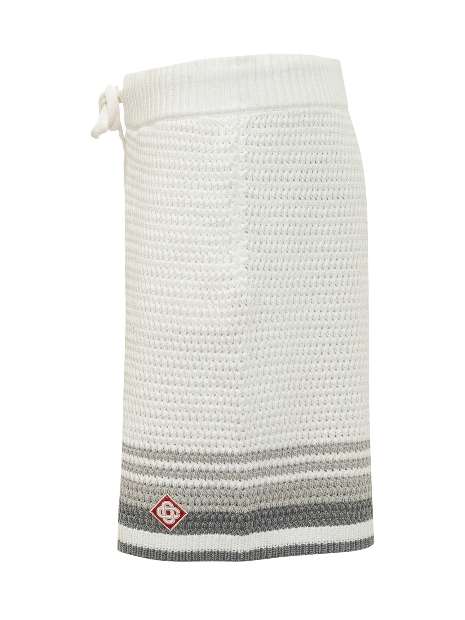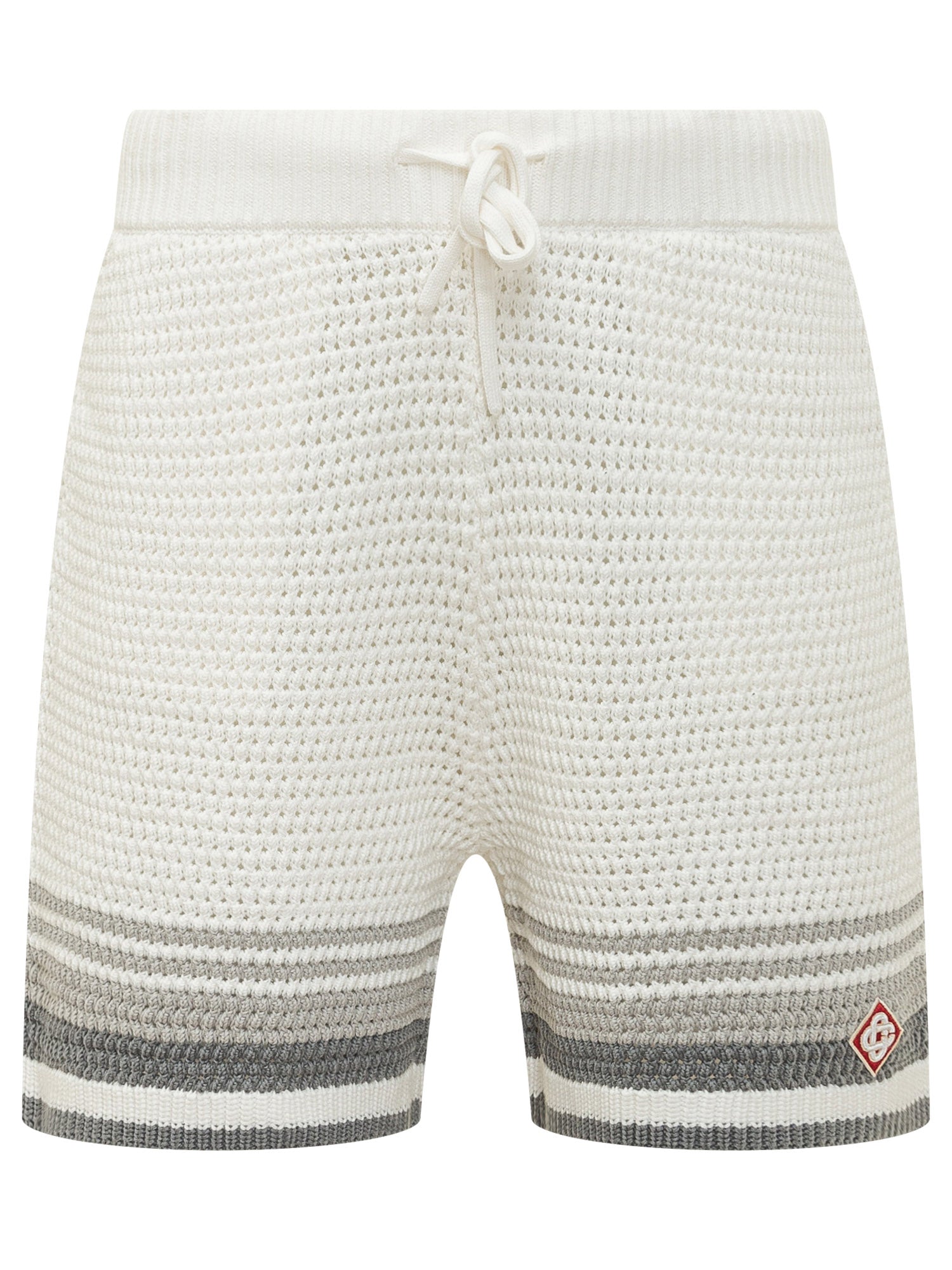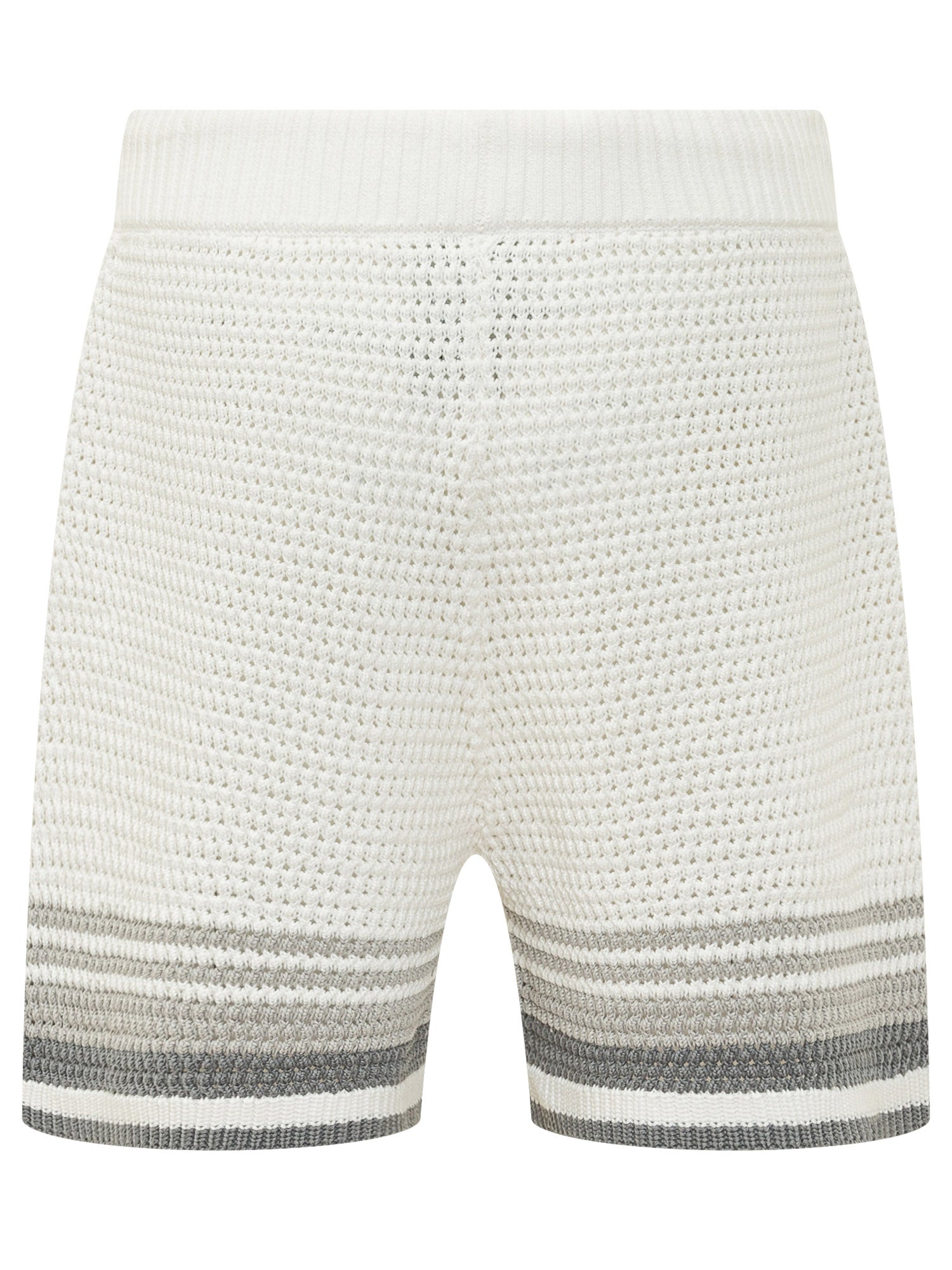 Shorts in maglia crochet con lavorazione traforata e vita elasticizzata con coulisse. Vestibilità confortevole e design raffinato.
