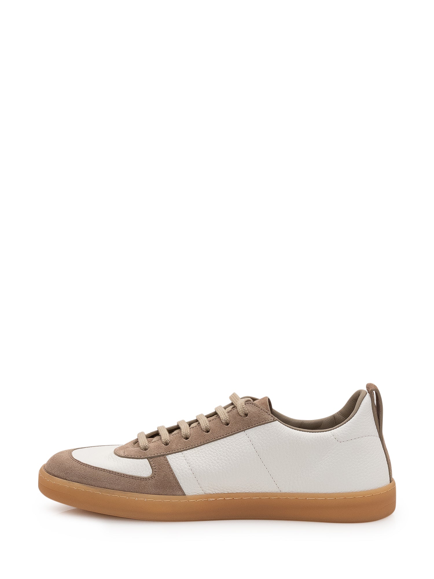 Sneakers Repton dal design essenziale in pelle bianca con inserti in suede beige e suola in gomma color miele. Modello stringato dallo stile casual e contemporaneo, perfetto per completare look quotidiani con un tocco raffinato.
