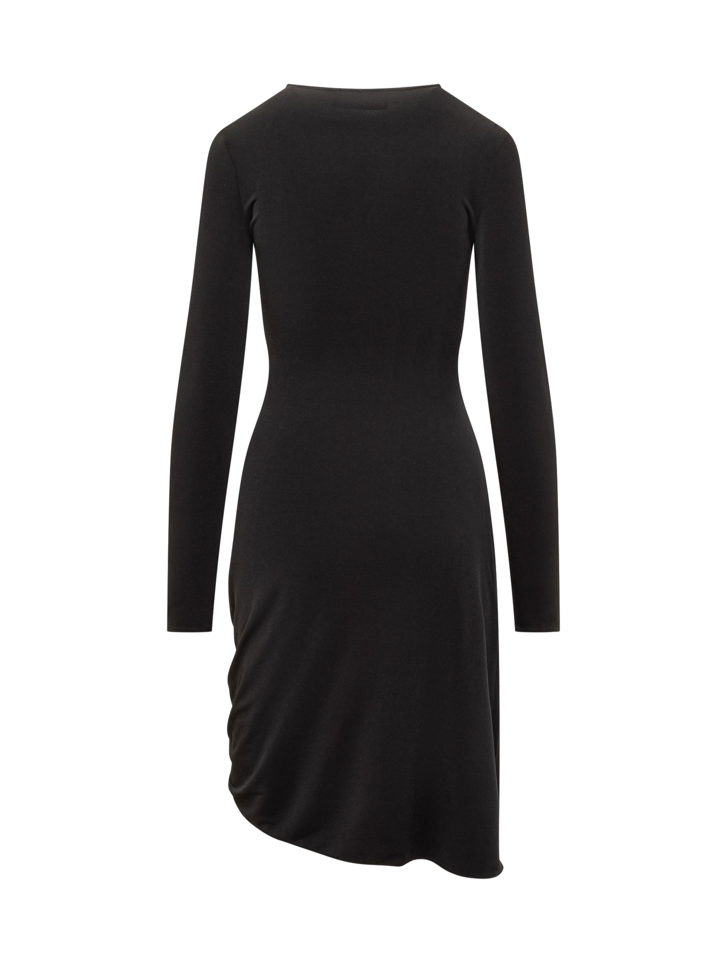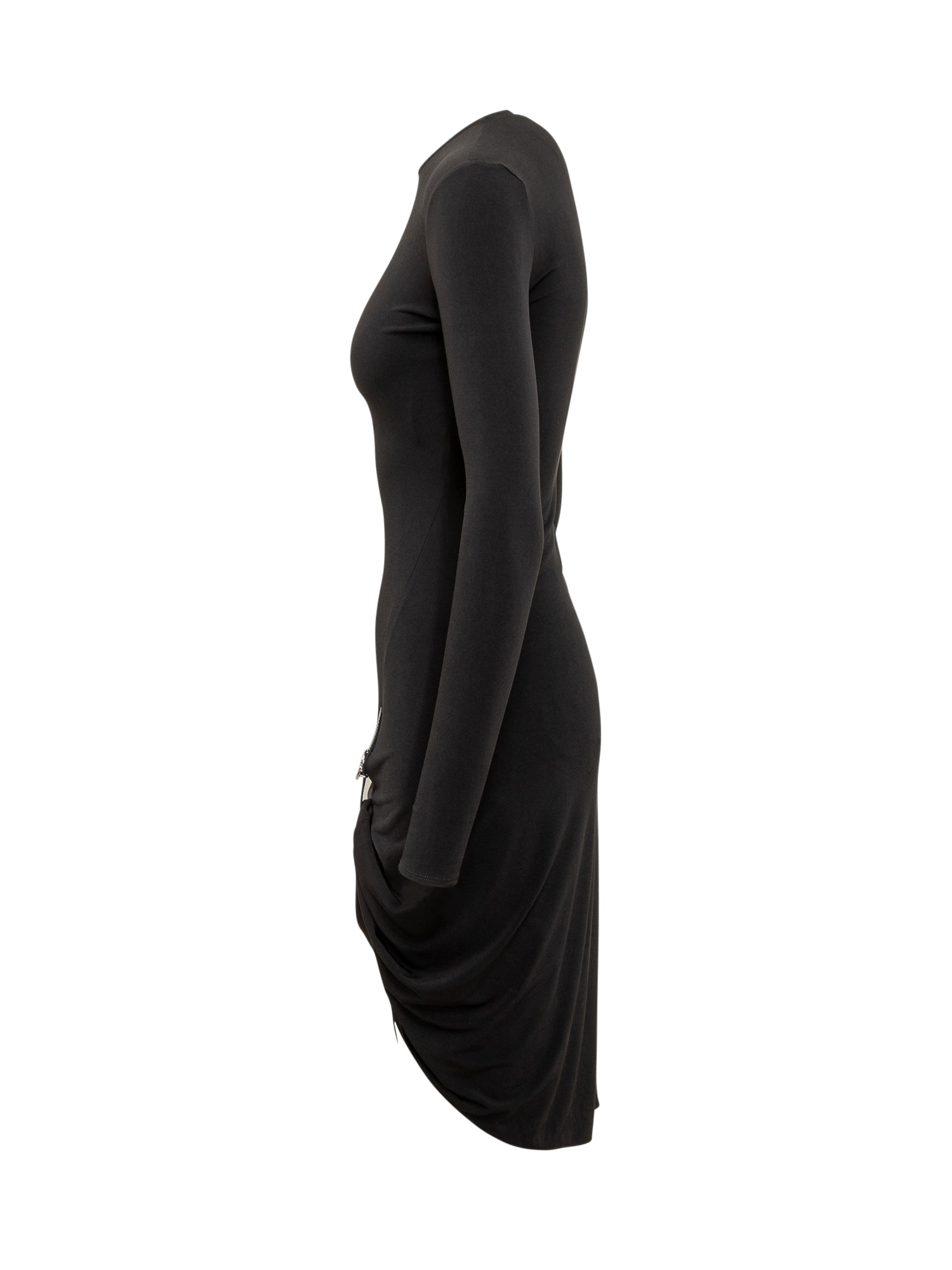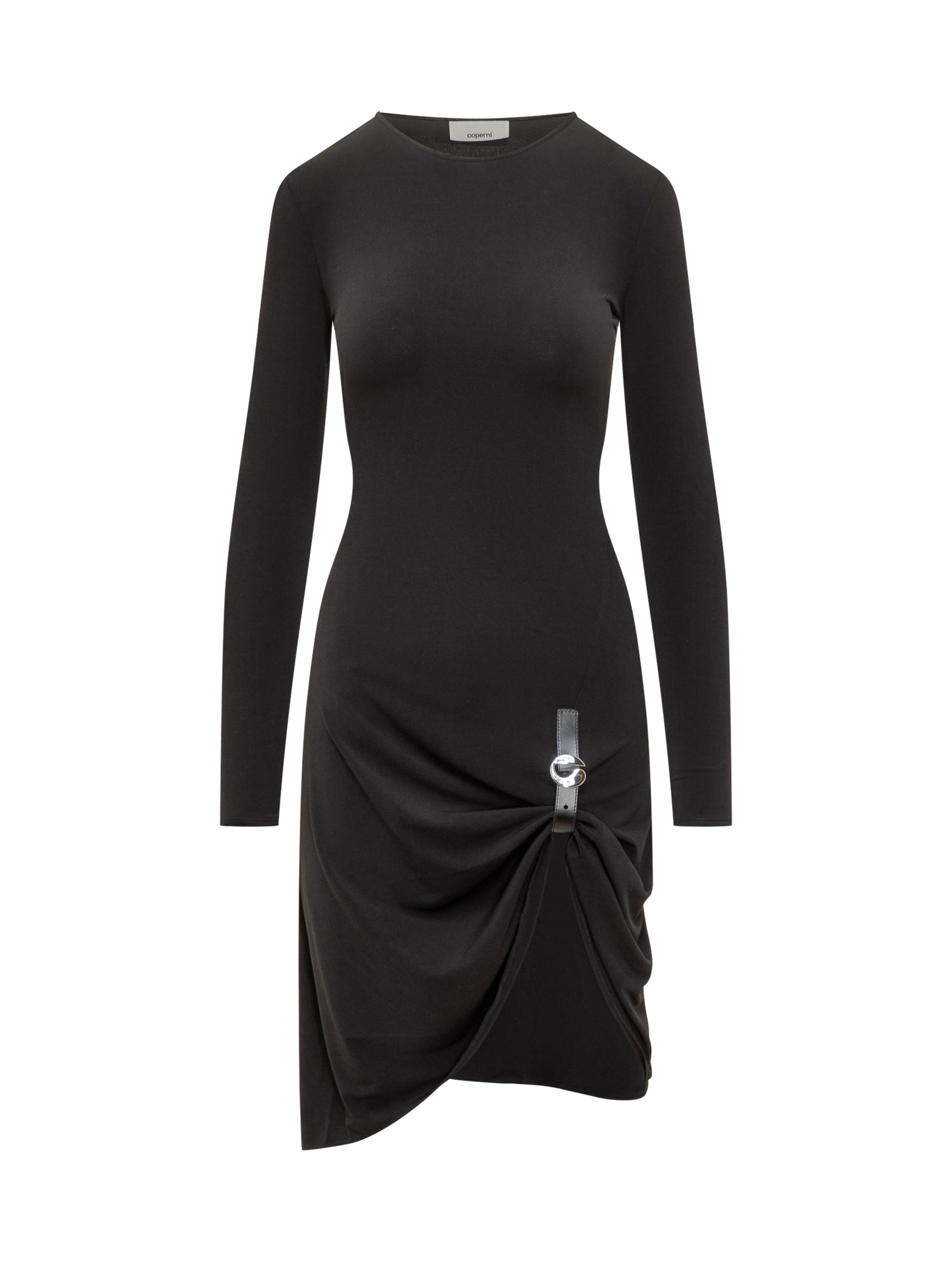 Abito Coperni in jersey nero a maniche lunghe con arricciatura laterale e dettaglio con fibbia metallica.