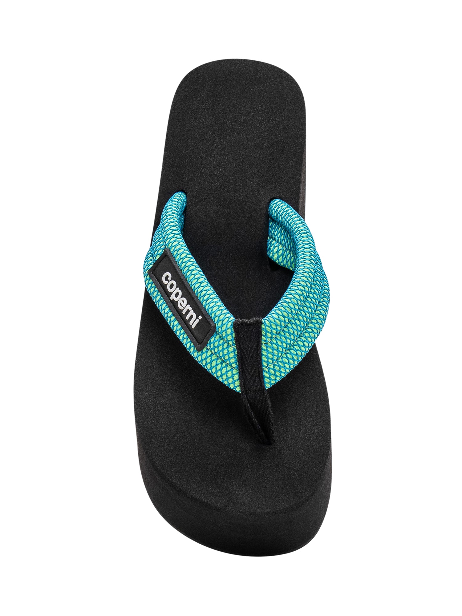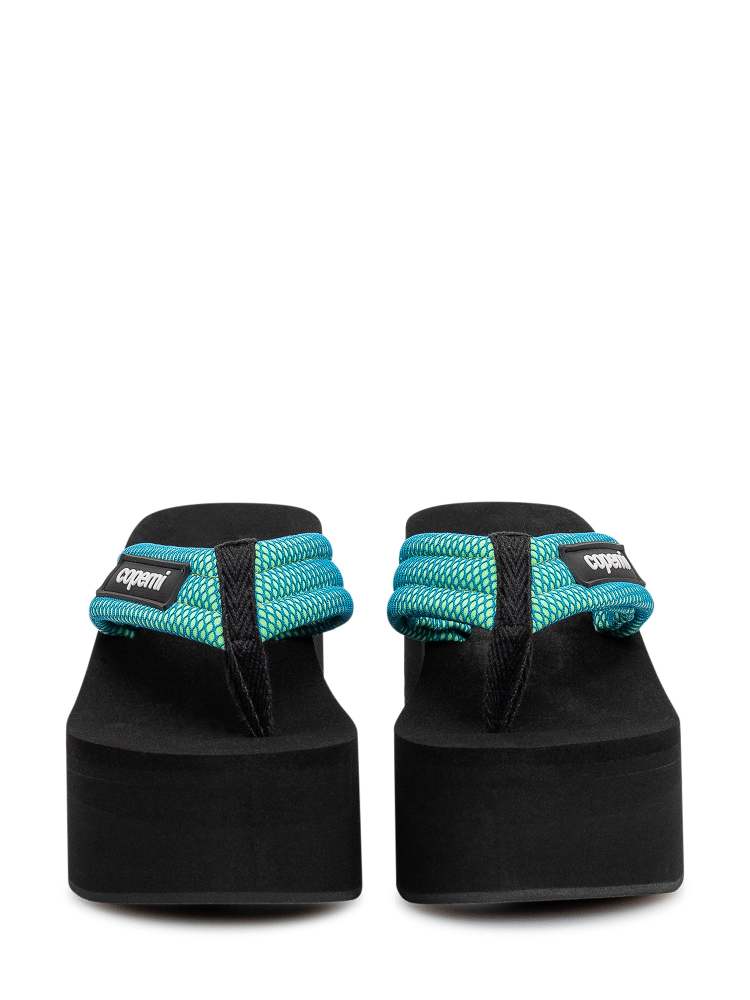 Sandalo con zeppa in gomma dalla linea moderna, con fascia a infradito in tessuto tecnico e patch logo applicato.Altezza platform: 9,5