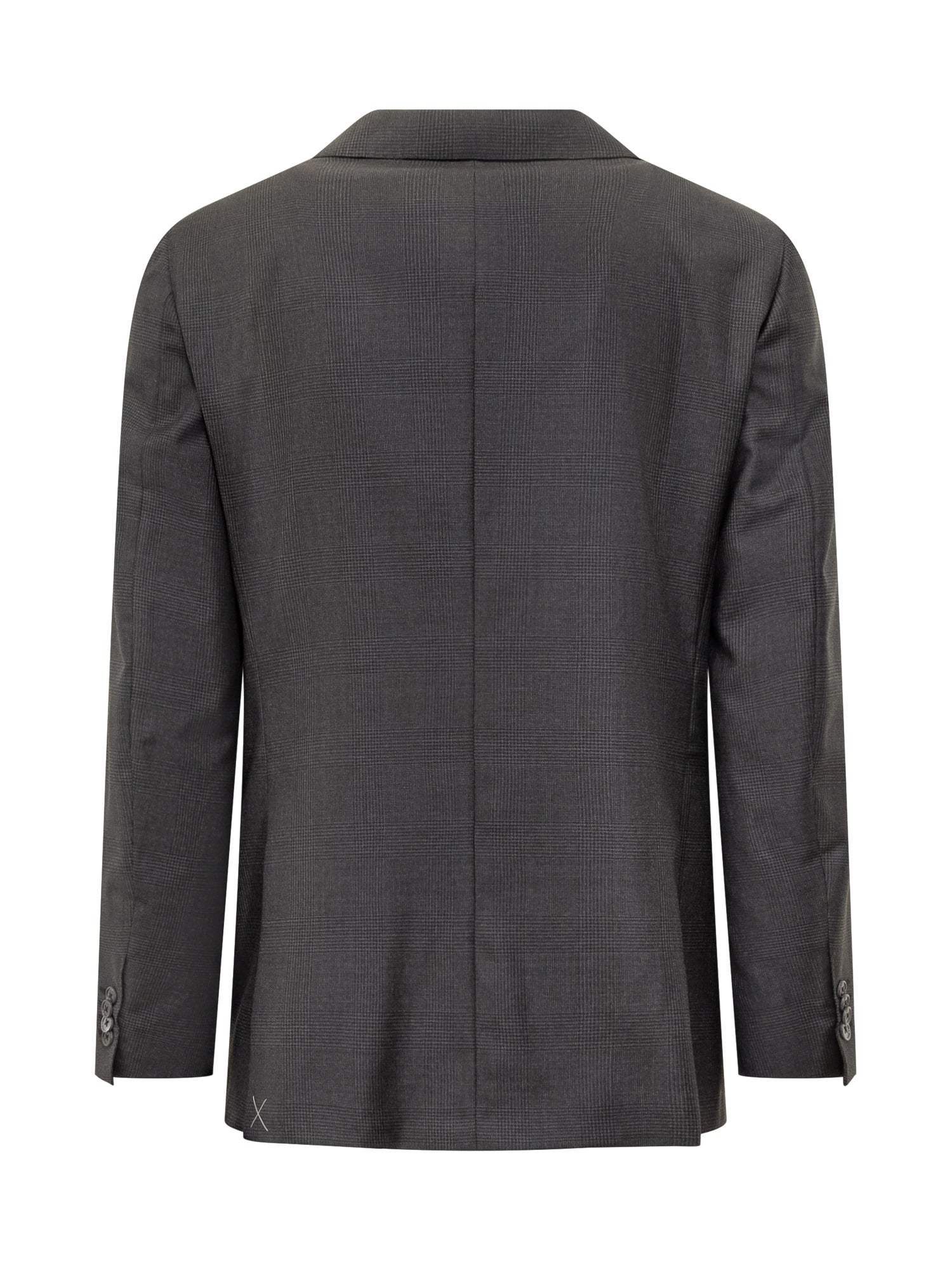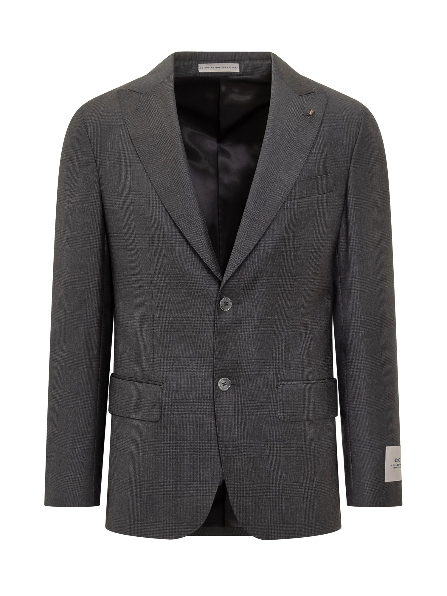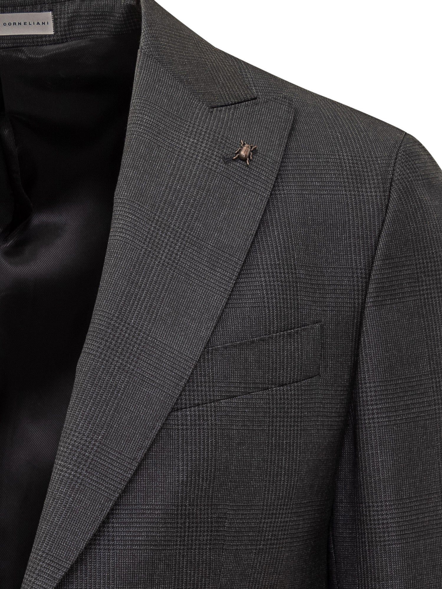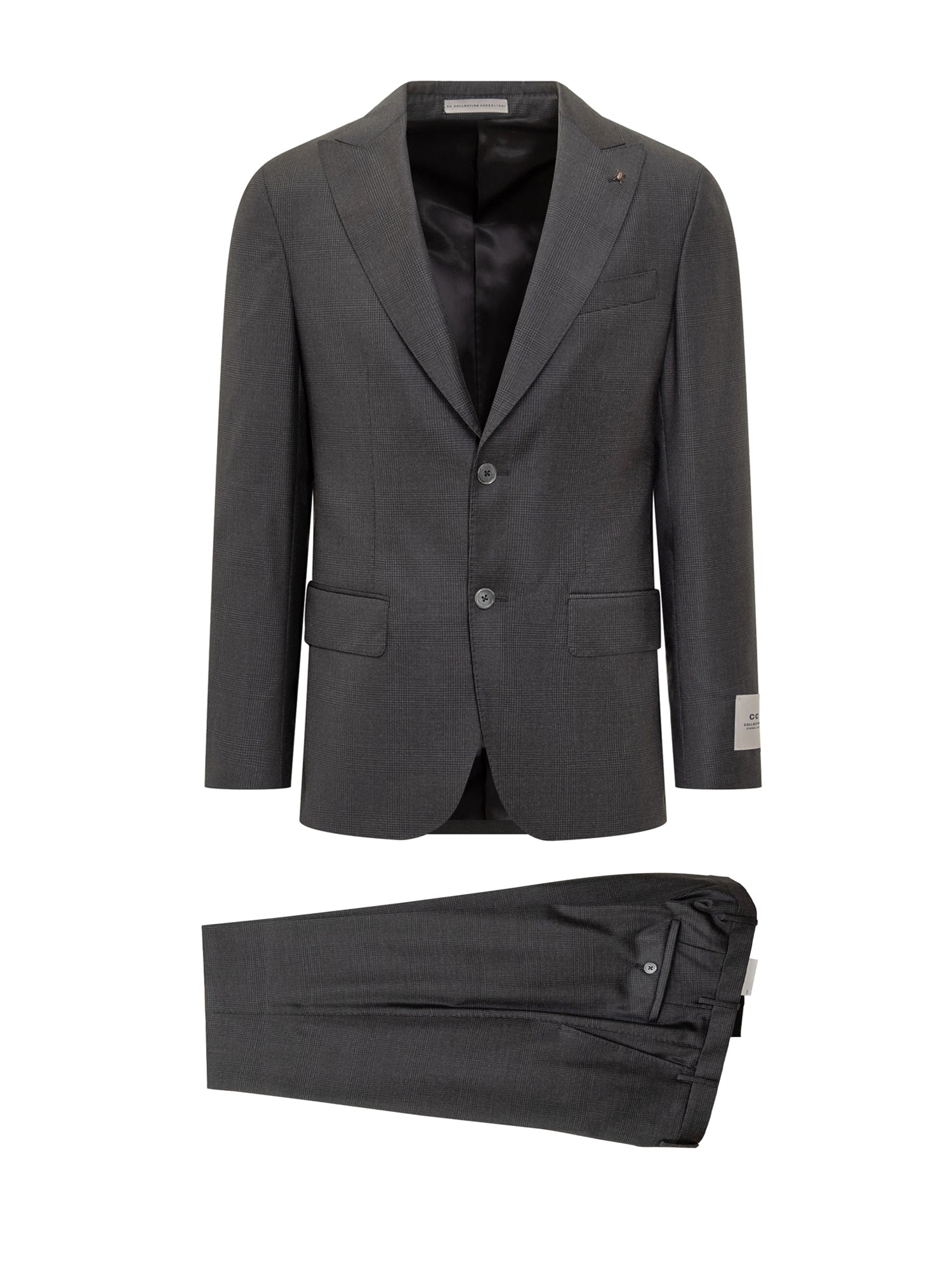 Abito Corneliani in lana grigia con giacca a due bottoni e pantaloni coordinati.