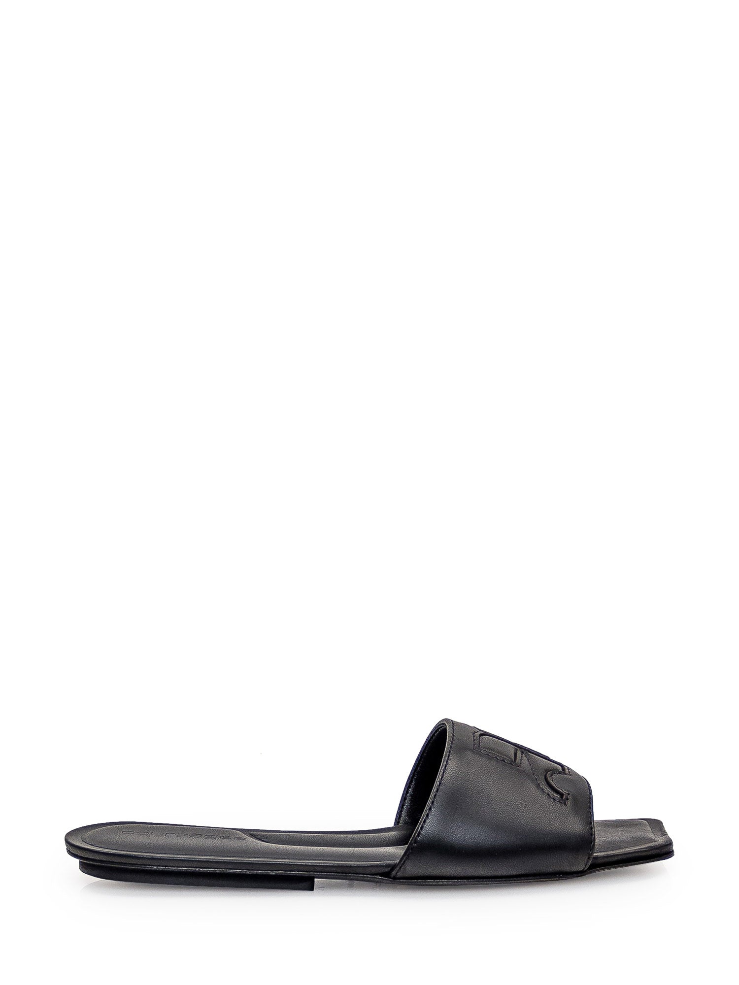 Sandalo nero in pelle. Slip-on. Punta squadrata. Maschera in pelle con logo.