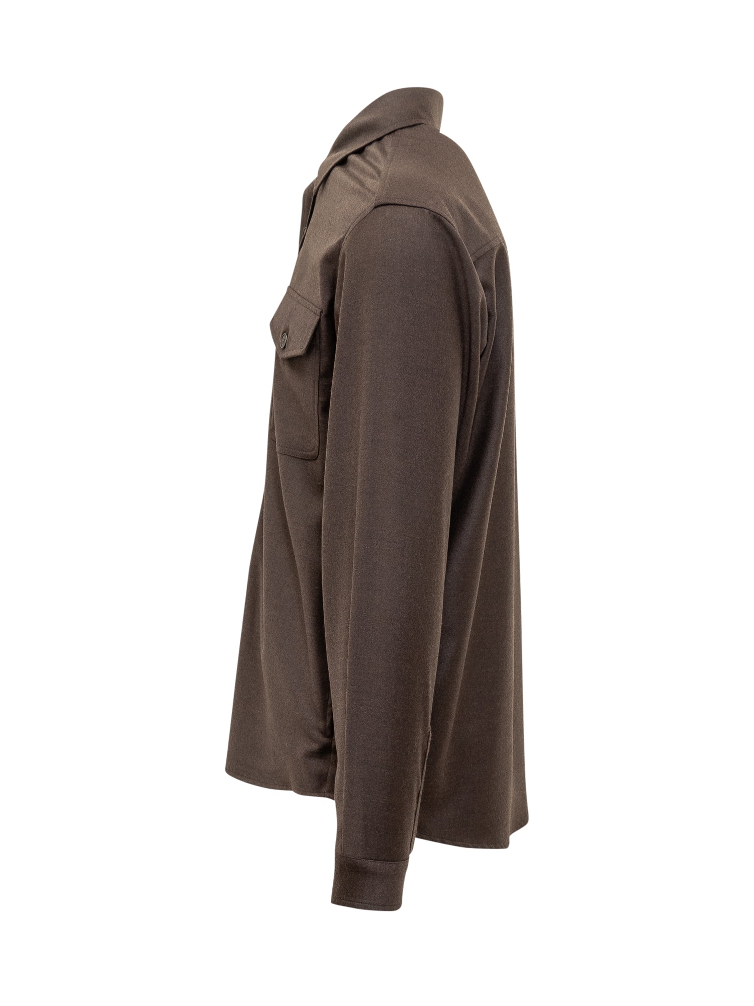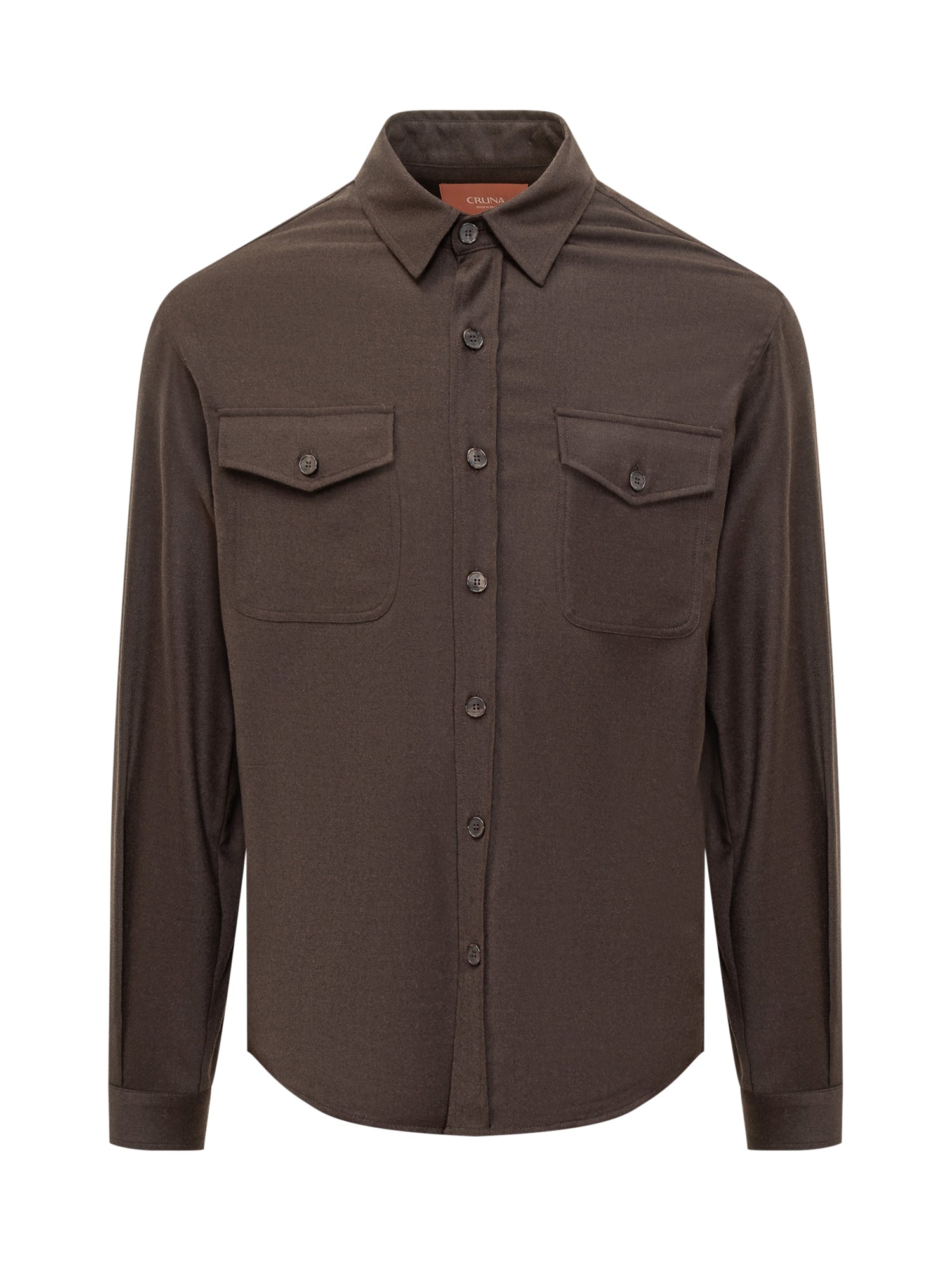 Camicia Cruna in lana marrone con taschini frontali e chiusura con bottoni. Morbida e calda.