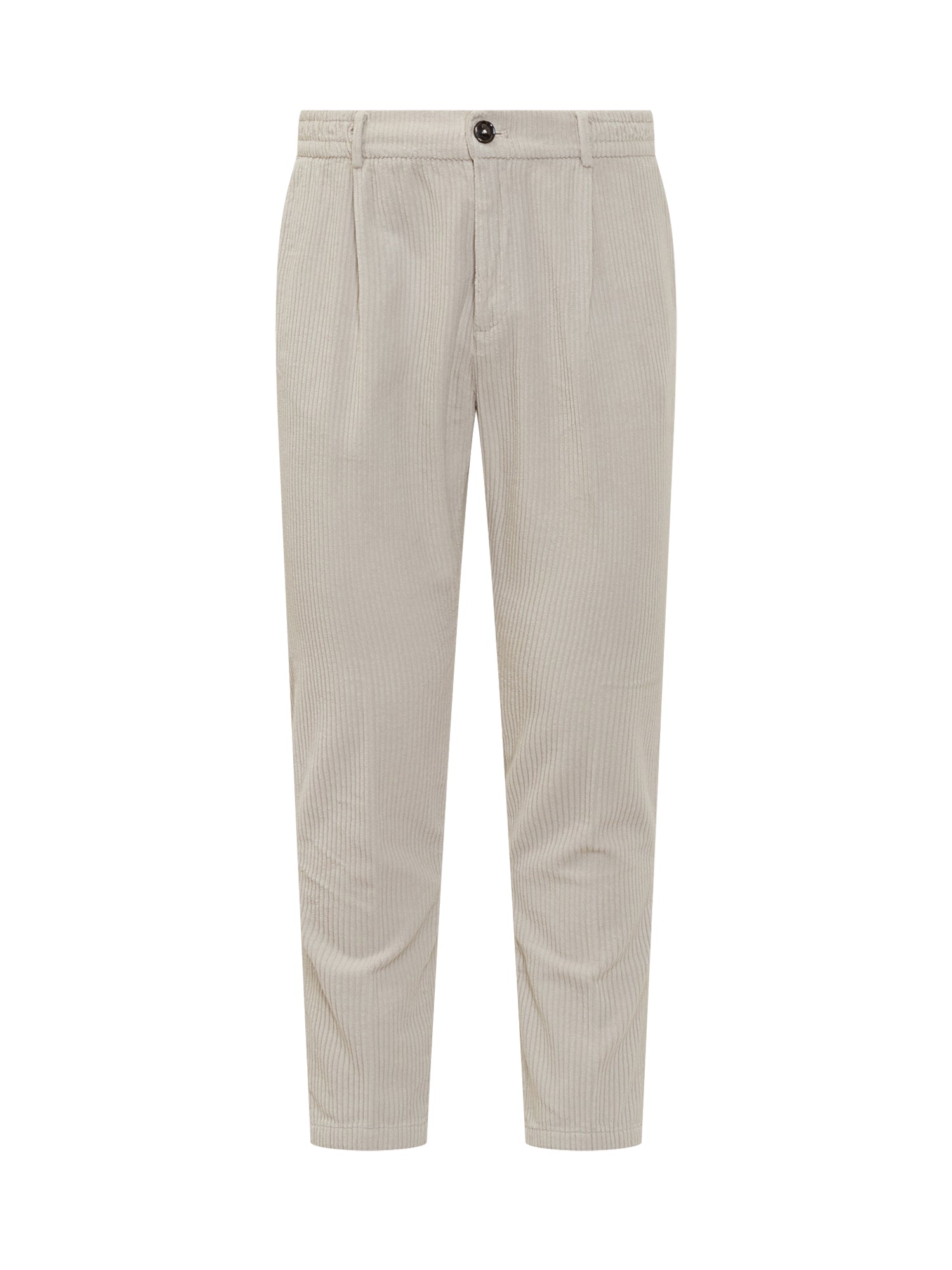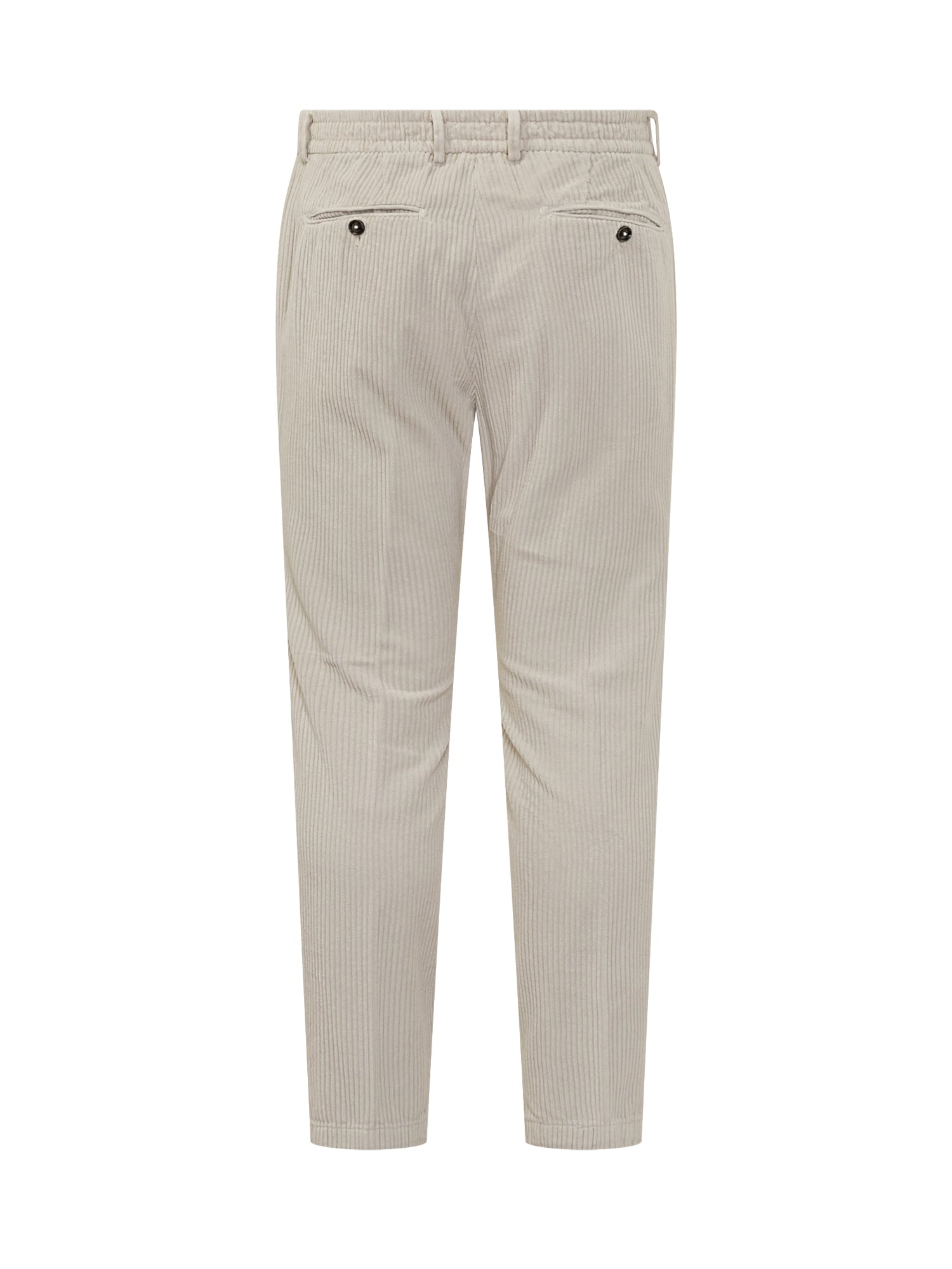 Pantaloni Cruna in velluto beige dal taglio moderno con vita elasticizzata e pinces frontali.