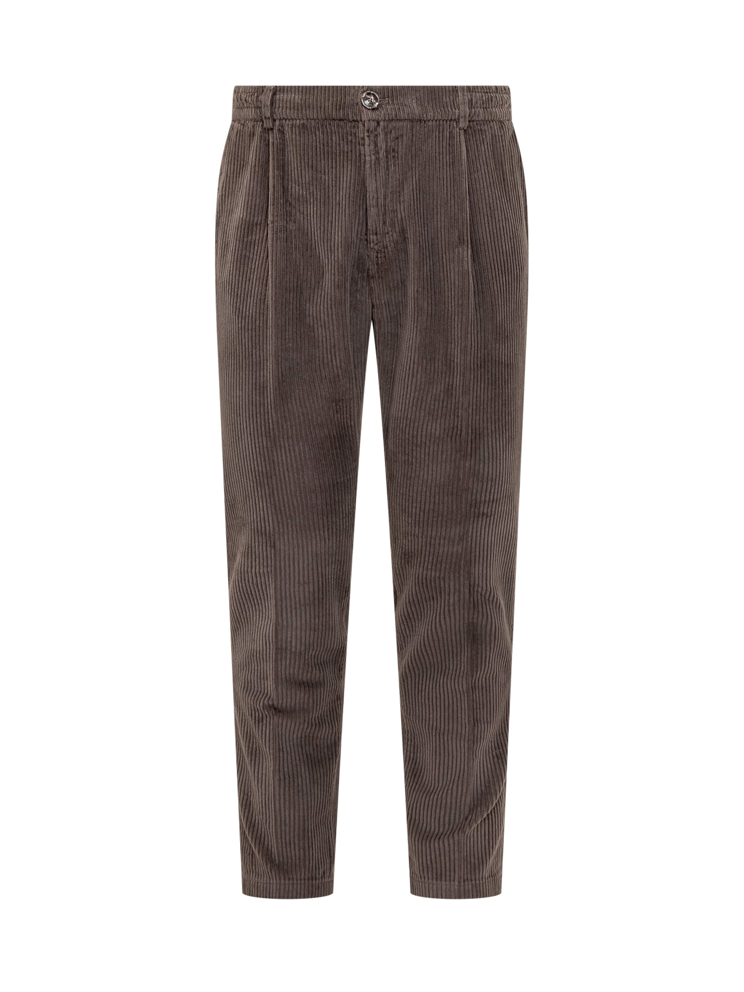 Pantaloni Cruna in velluto marrone a costine con pinces frontali e vita elasticizzata.