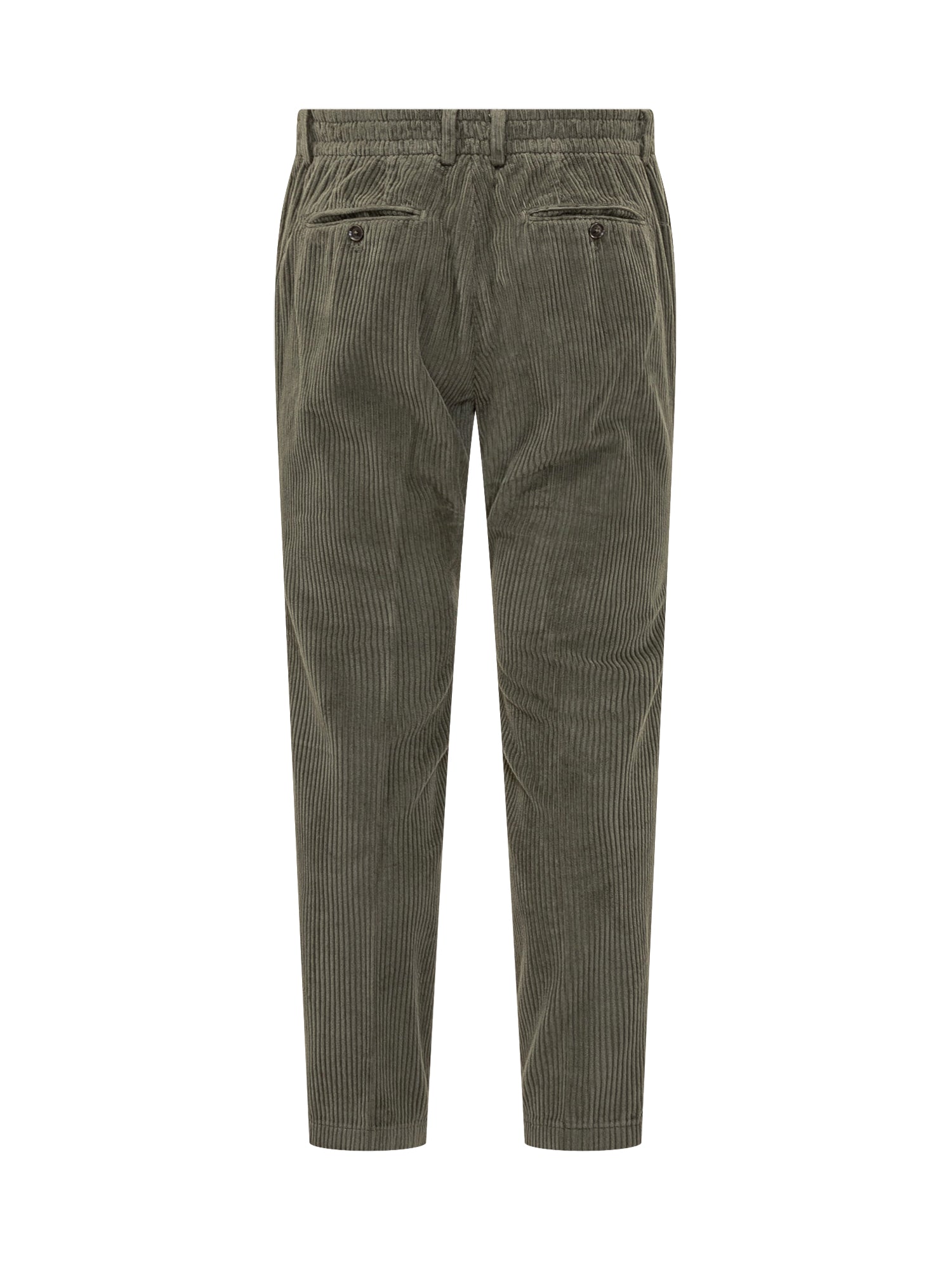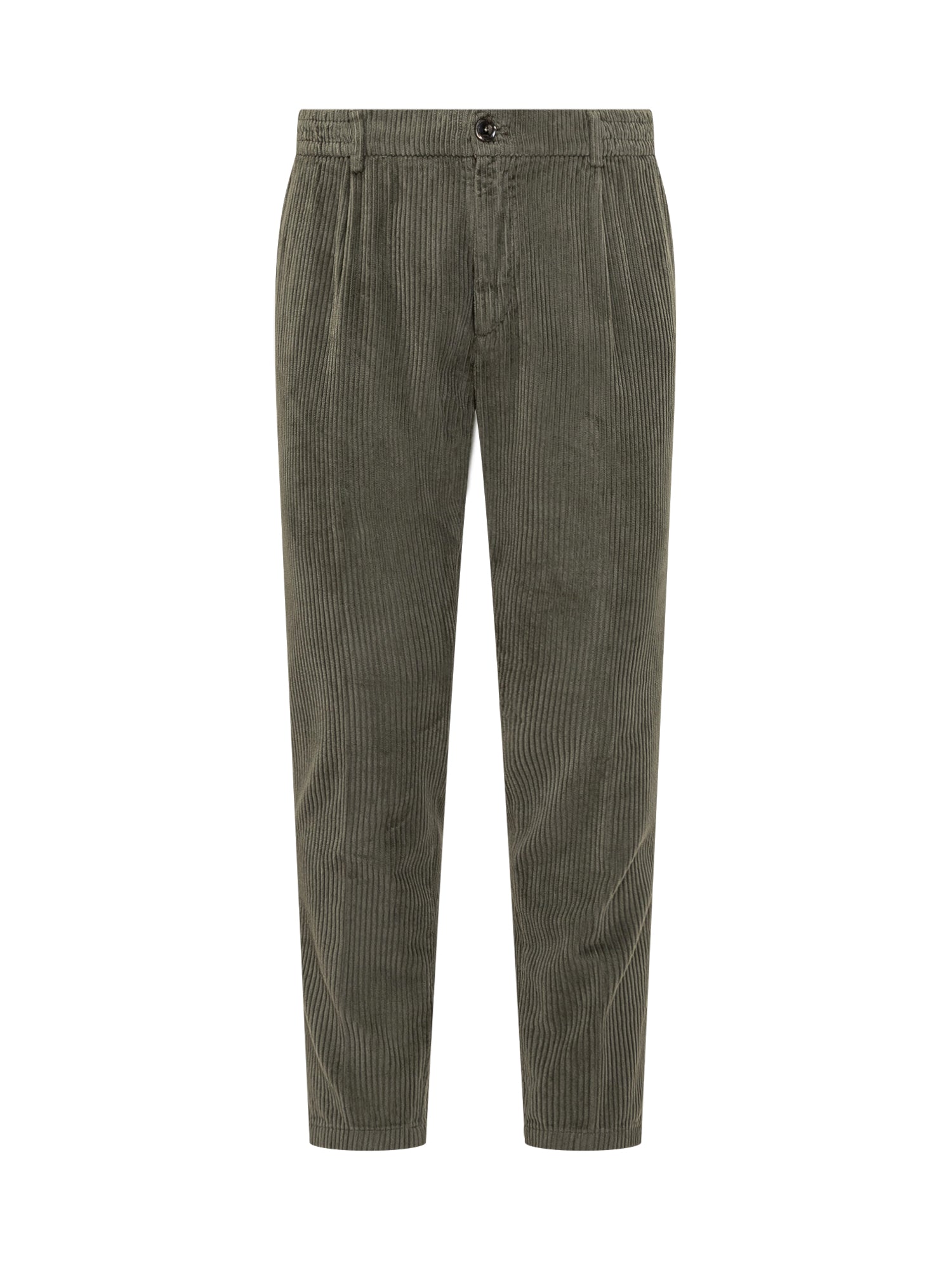 Pantaloni Cruna verde in velluto a coste con vita elasticizzata e pinces frontali.