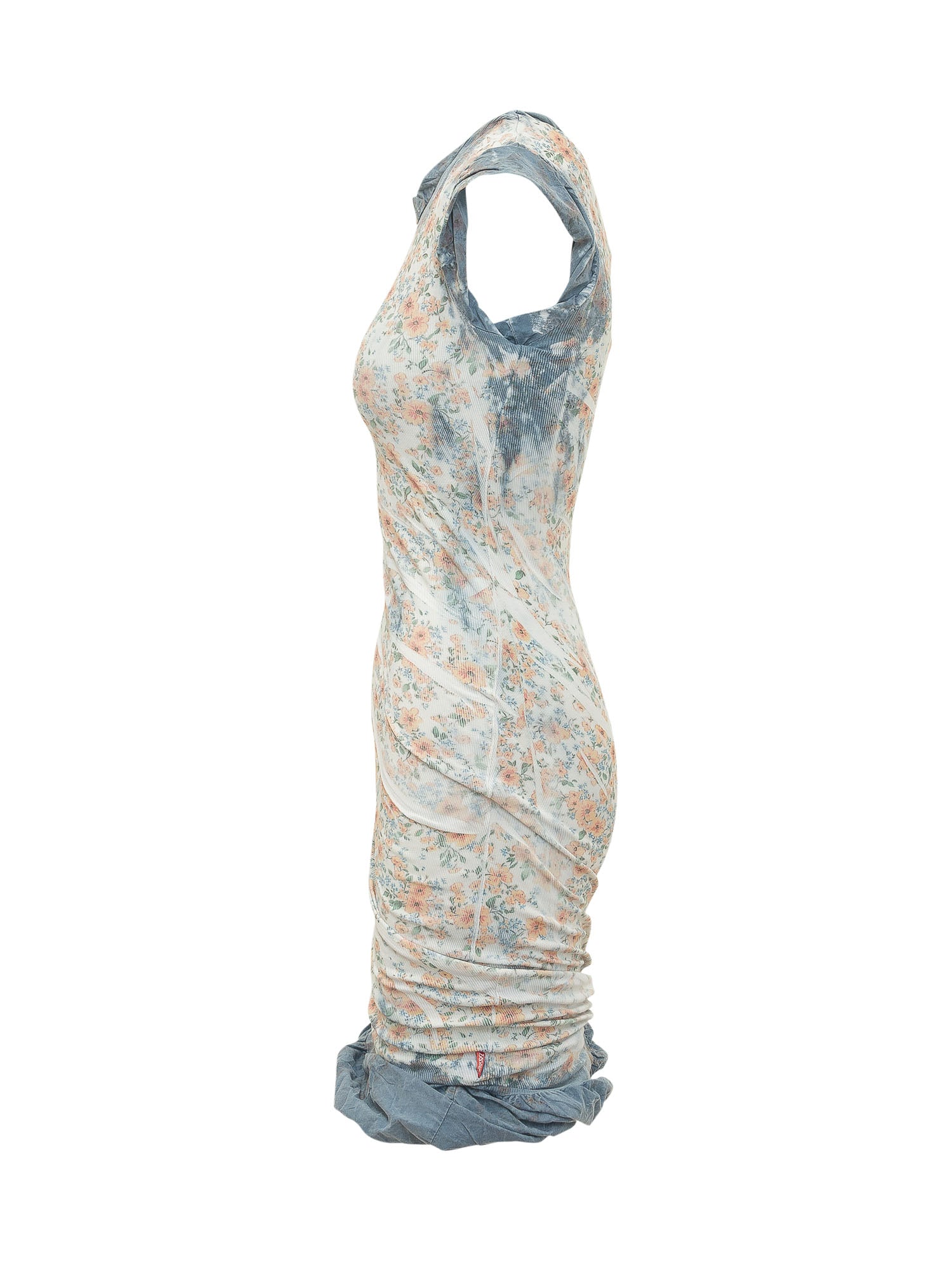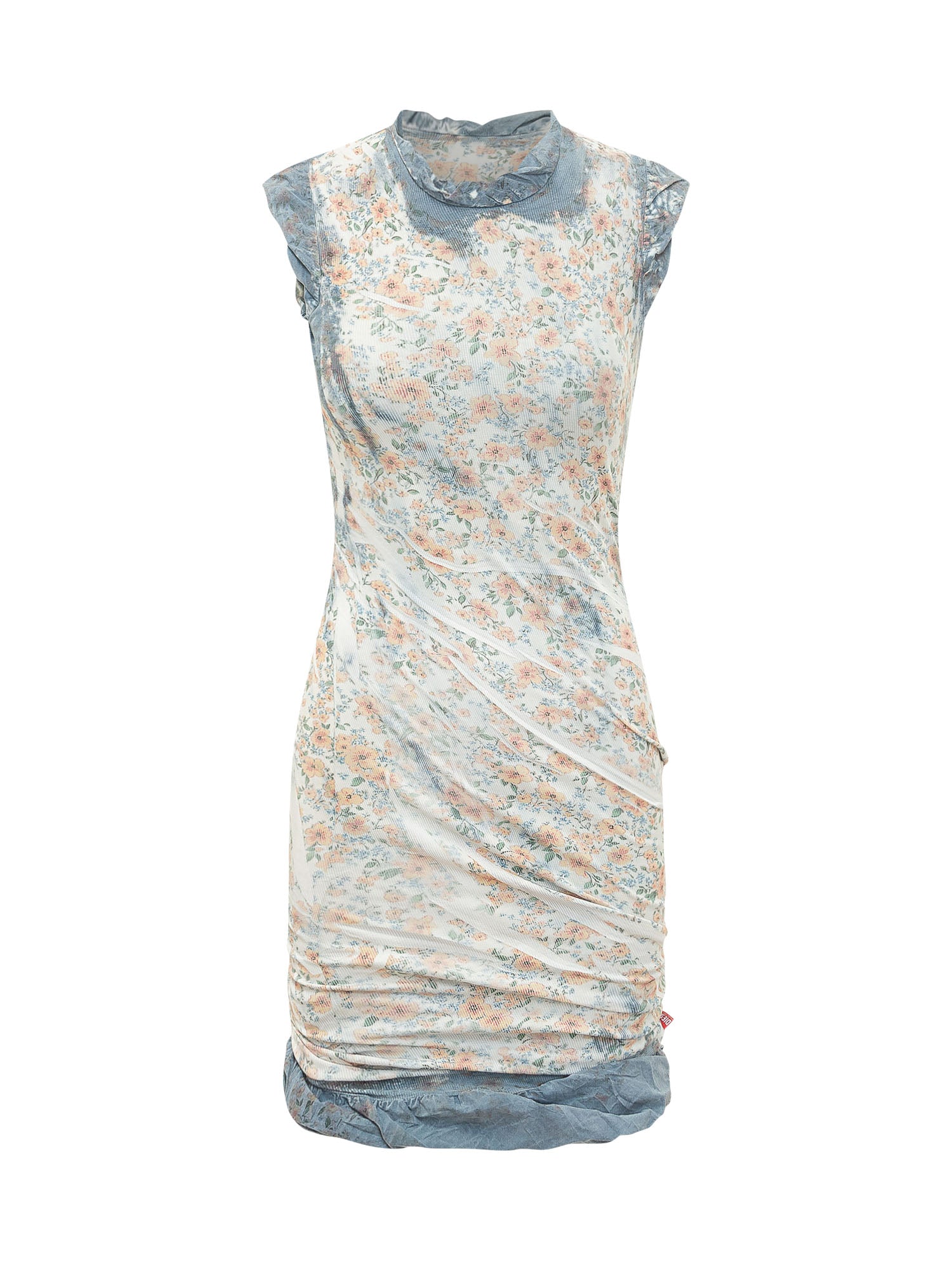 Abito corto con maniche corte e collo alto. Stampa floreale all over e drappeggi laterali che creano movimento. Fondo arricciato e linea aderente che definisce la silhouette con carattere.