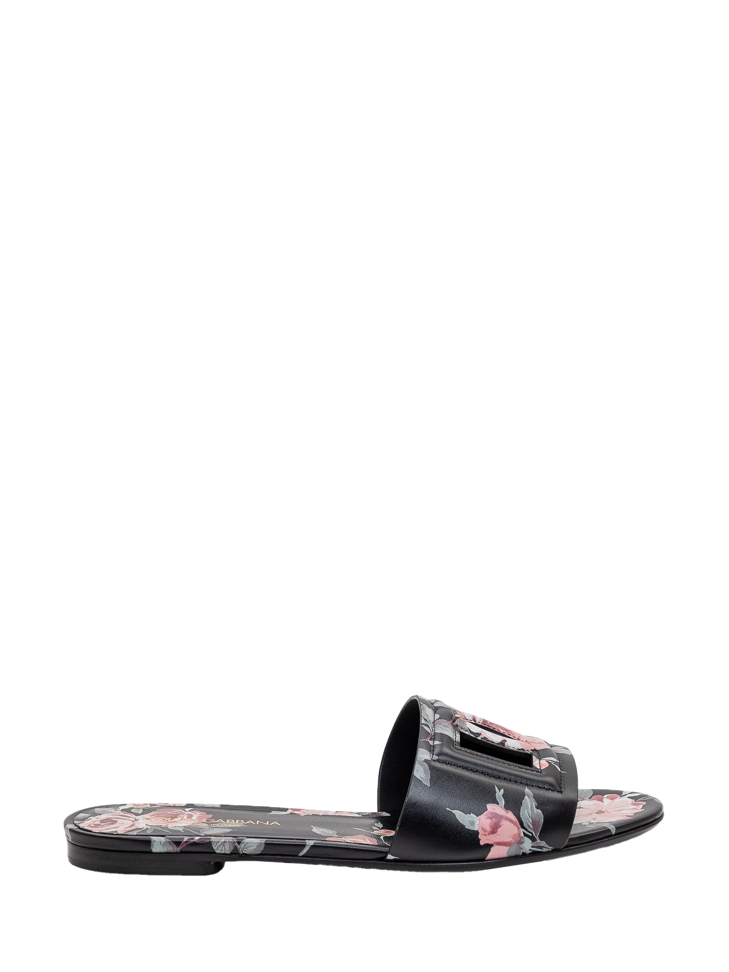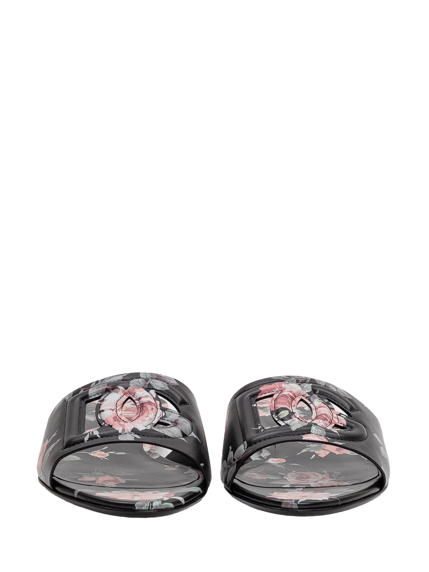 Ciabatta flat in pelle con design essenziale e fascia frontale decorata da motivo floreale.