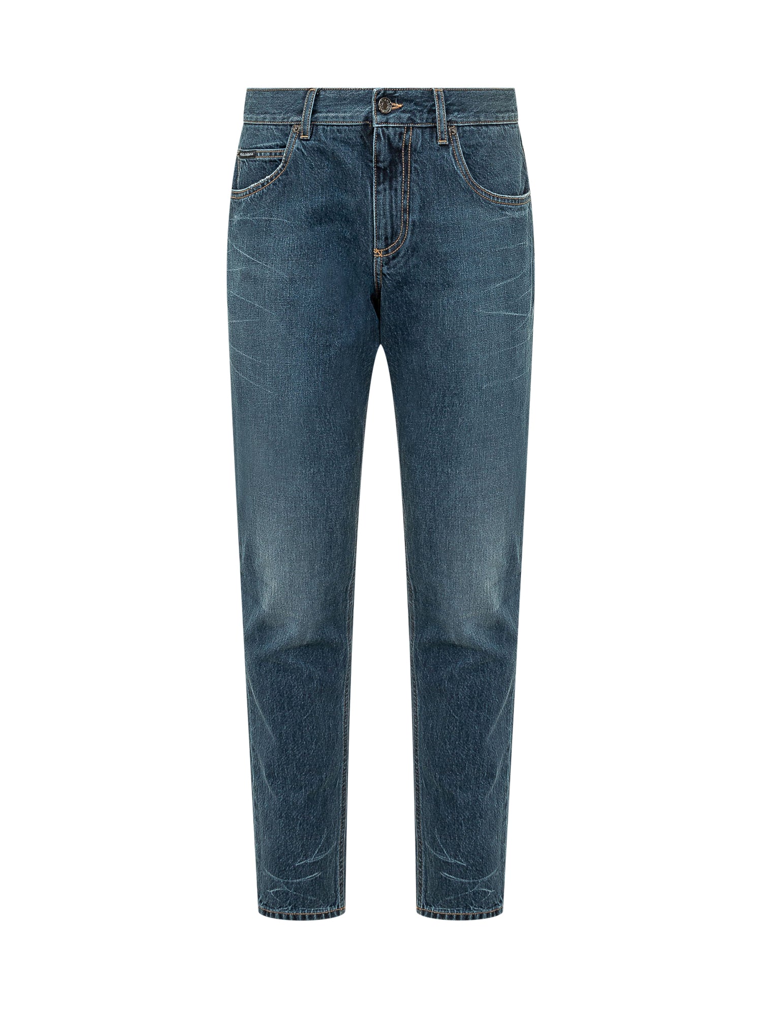 Pantalone in denim con costruzione a cinque tasche e vestibilità regolare. Modello con chiusura frontale con bottone e zip, passanti per cintura e cuciture a contrasto.