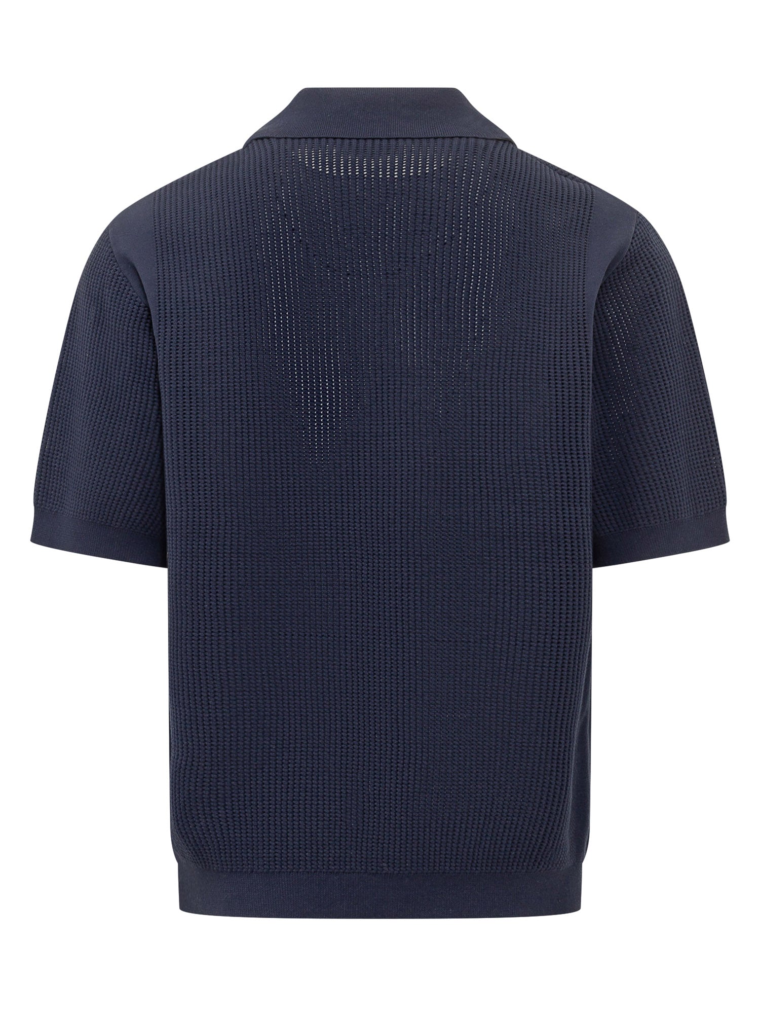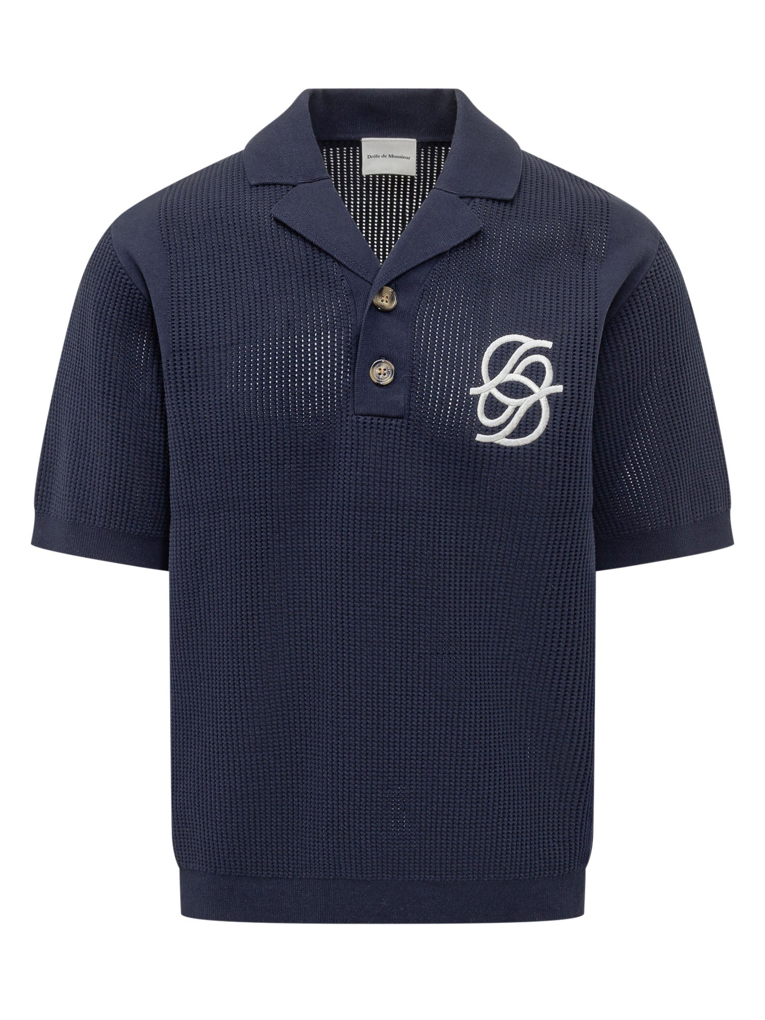 Polo in maglia con colletto aperto e chiusura a bottoni. Realizzata con lavorazione traforata per una texture leggera e traspirante, è rifinita da monogramma ricamato sul petto.