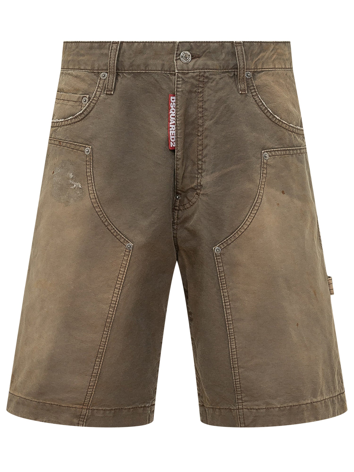 Short stile carpenter con vestibilità regolare e lunghezza al ginocchio. Modello a cinque tasche con tasche utility e dettagli effetto vissuto. Chiusura frontale con bottoni.