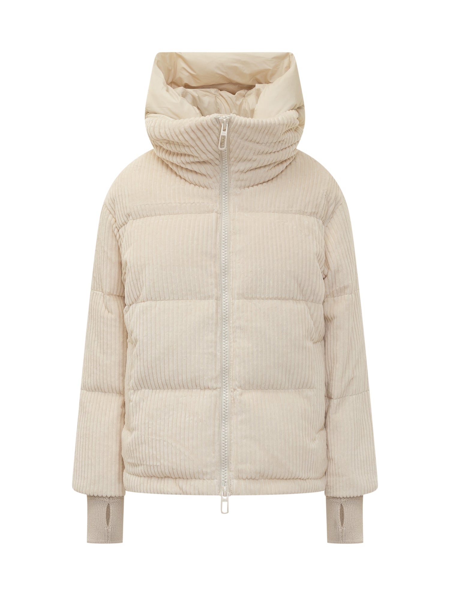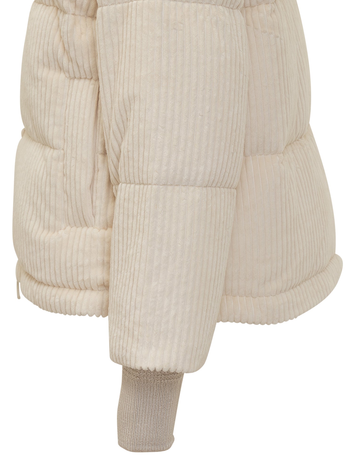 Piumino Duno beige in velluto a coste con cappuccio removibile e zip frontale.