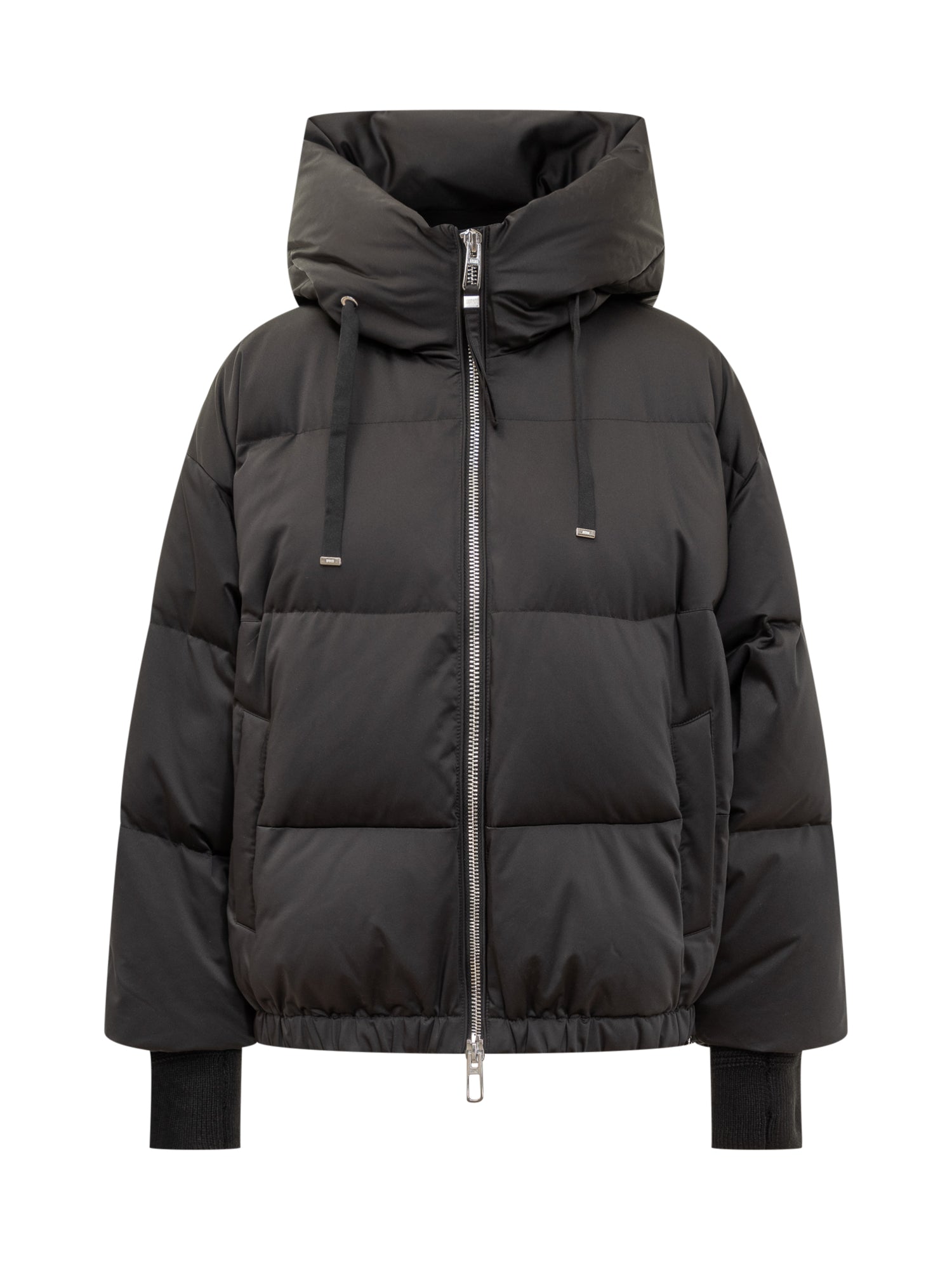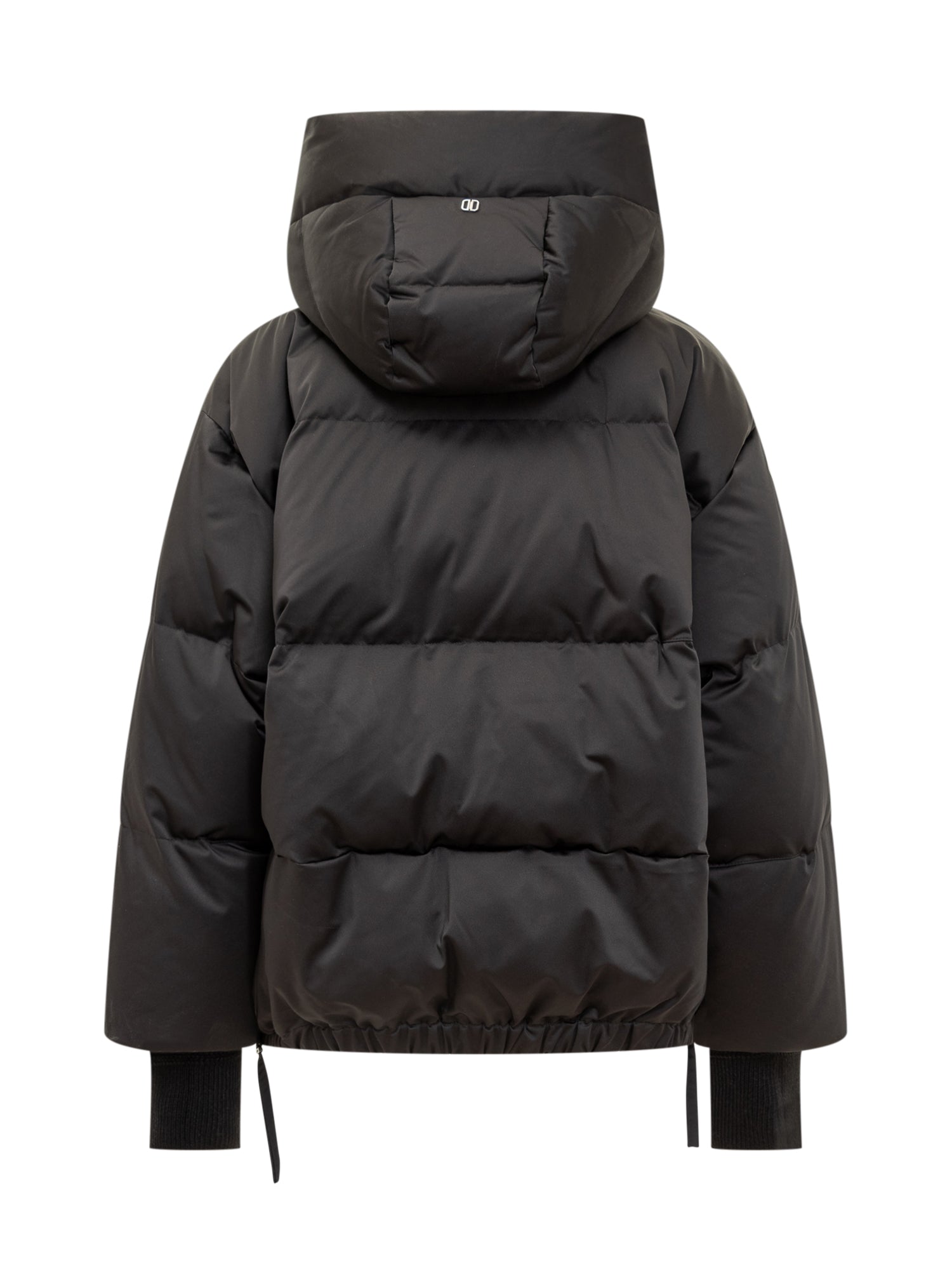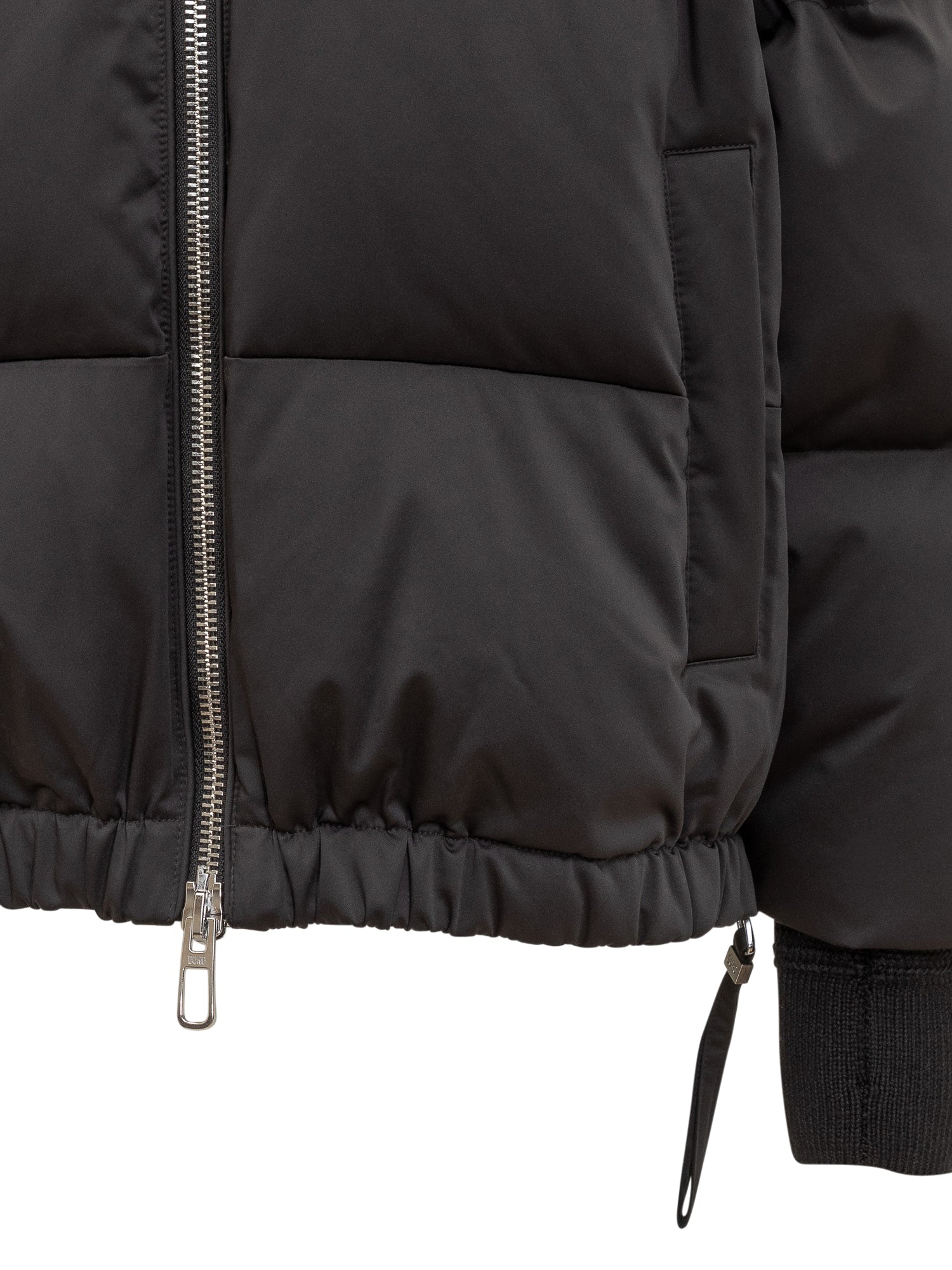 Piumino Duno nero dal design moderno con cappuccio imbottito e zip a doppio cursore.