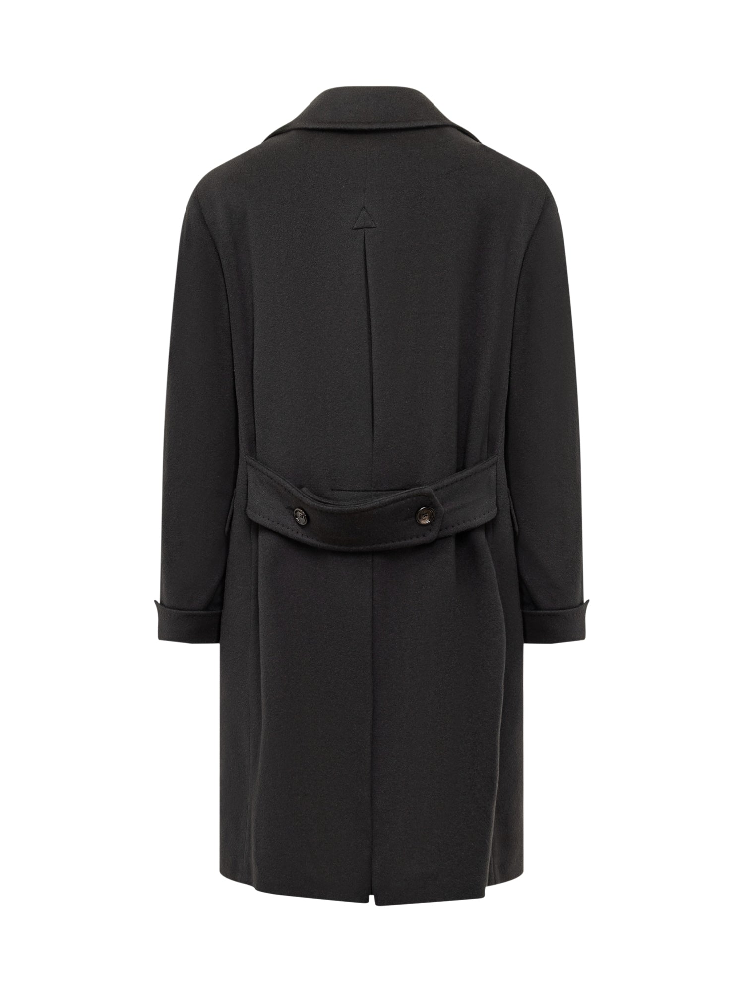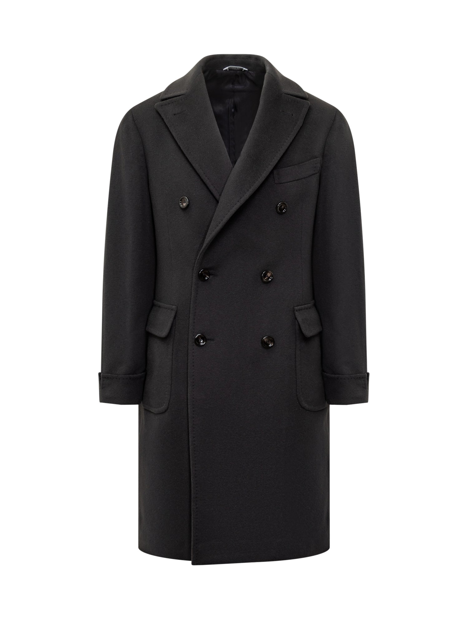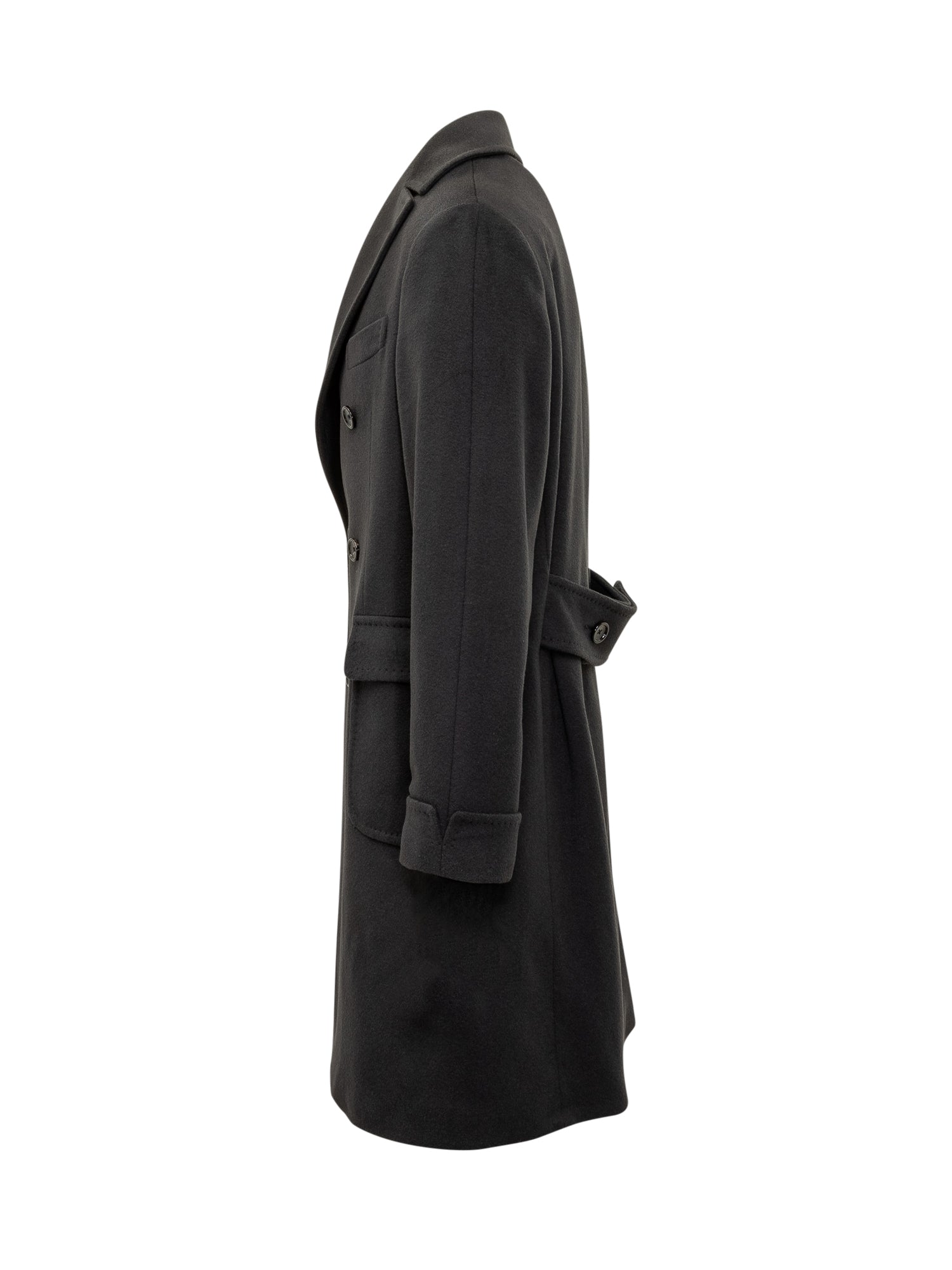 Cappotto Esterno in lana nera dal taglio doppiopetto con ampi revers e tasche con patta.