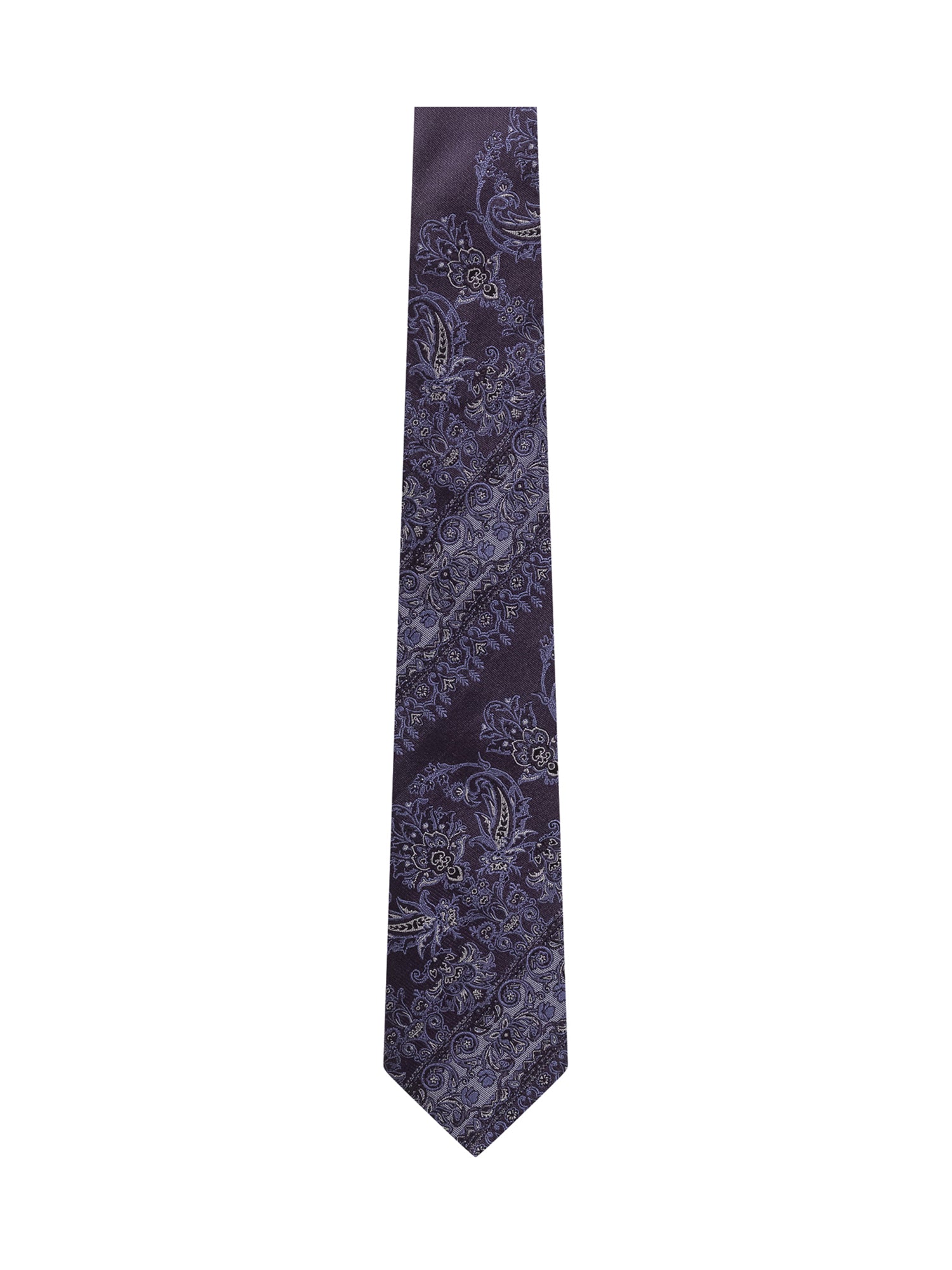 Cravatta Etro in pura seta, caratterizzata da una base viola impreziosita da un elegante motivo paisley lilla.