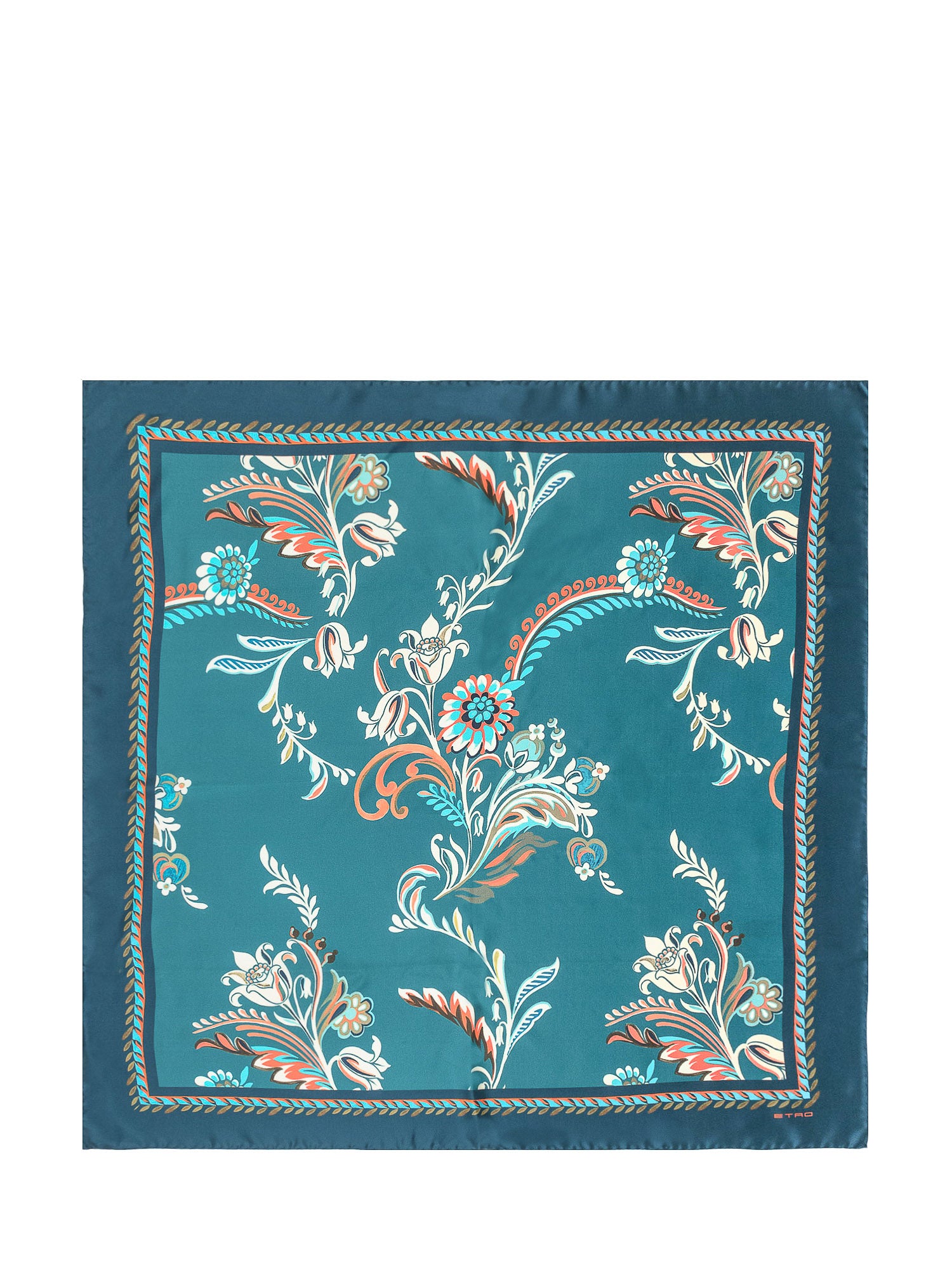 Foulard in pura seta con motivo floreale decorativo e bordo rifinito.