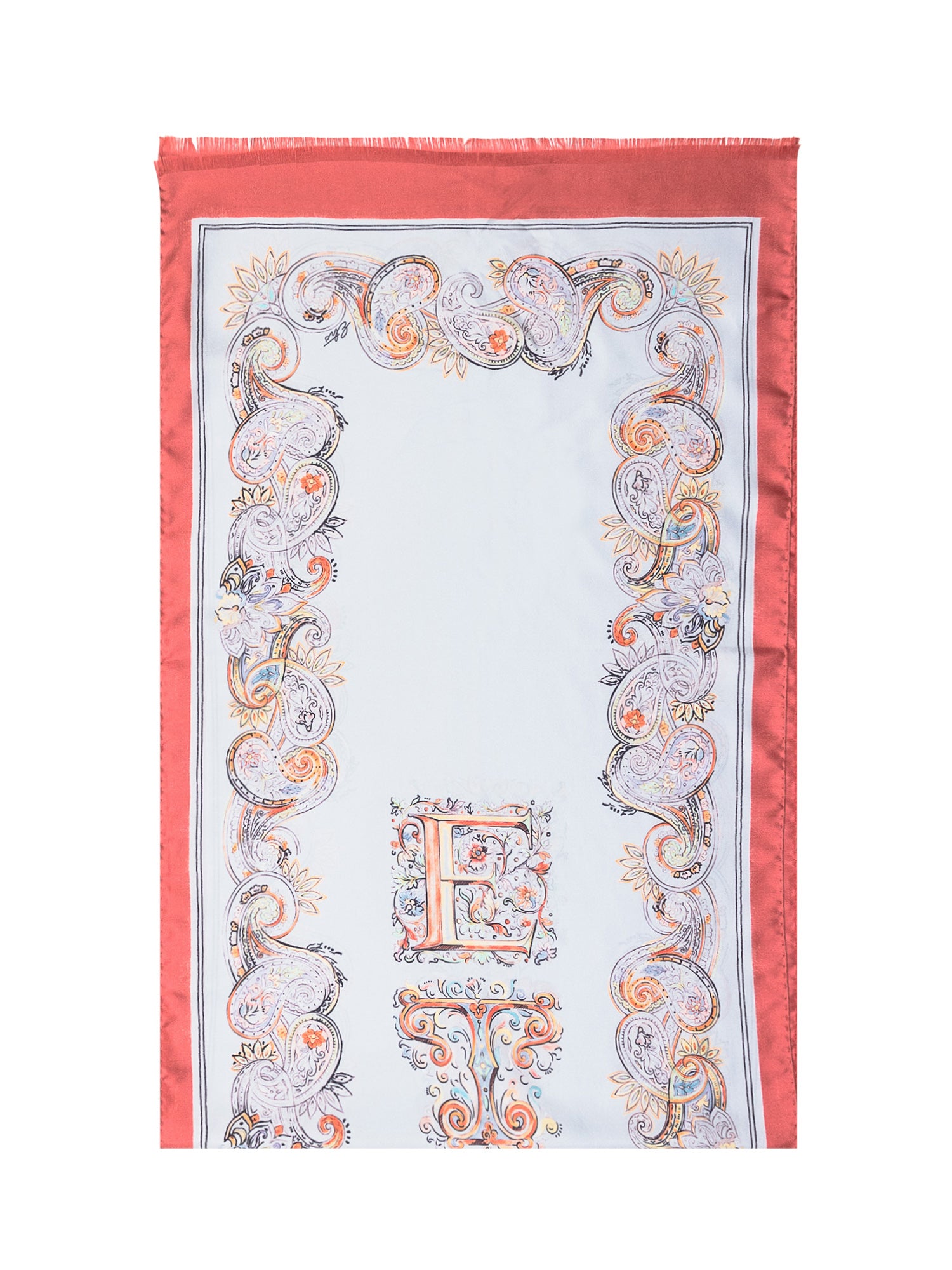 Sciarpa leggera con ampio bordo decorato e centro a tinta unita, arricchita da dettagli paisley e finiture eleganti.