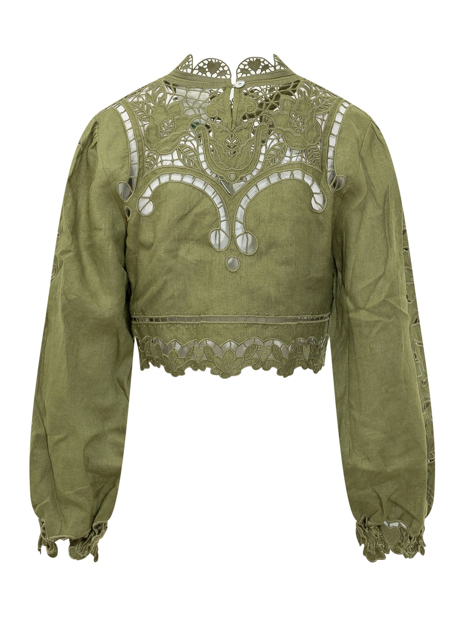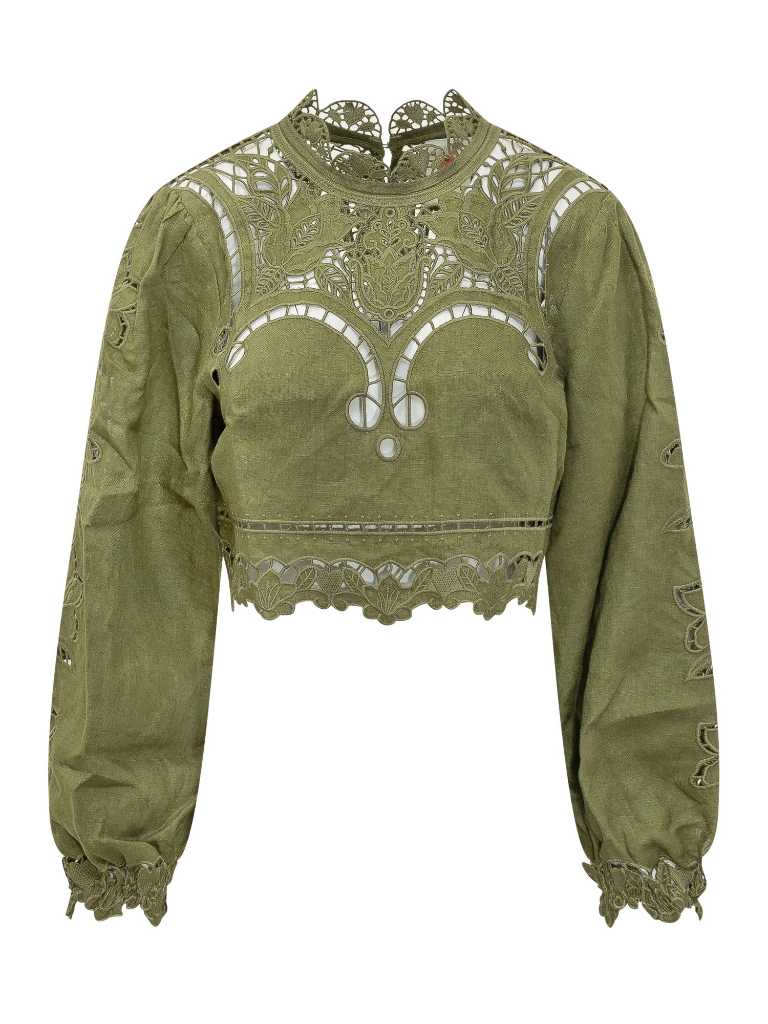 Blusa cropped con ricami Richelieu e inserti traforati. Maniche lunghe con dettagli decorativi e silhouette femminile.