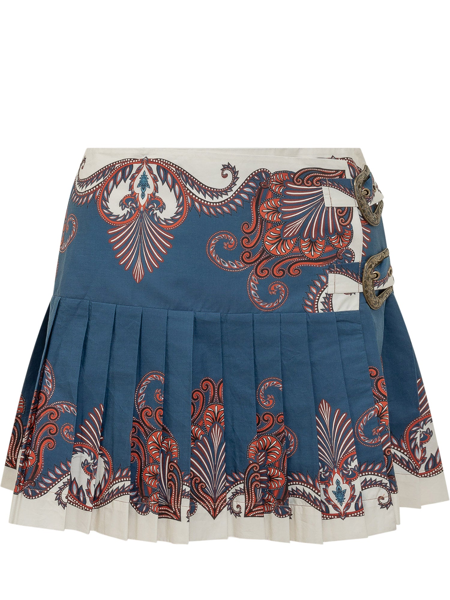 Gonna corta con pieghe e stampa arabesque. Chiusura laterale con fibbie decorative e struttura definita che aggiunge carattere e movimento al look.