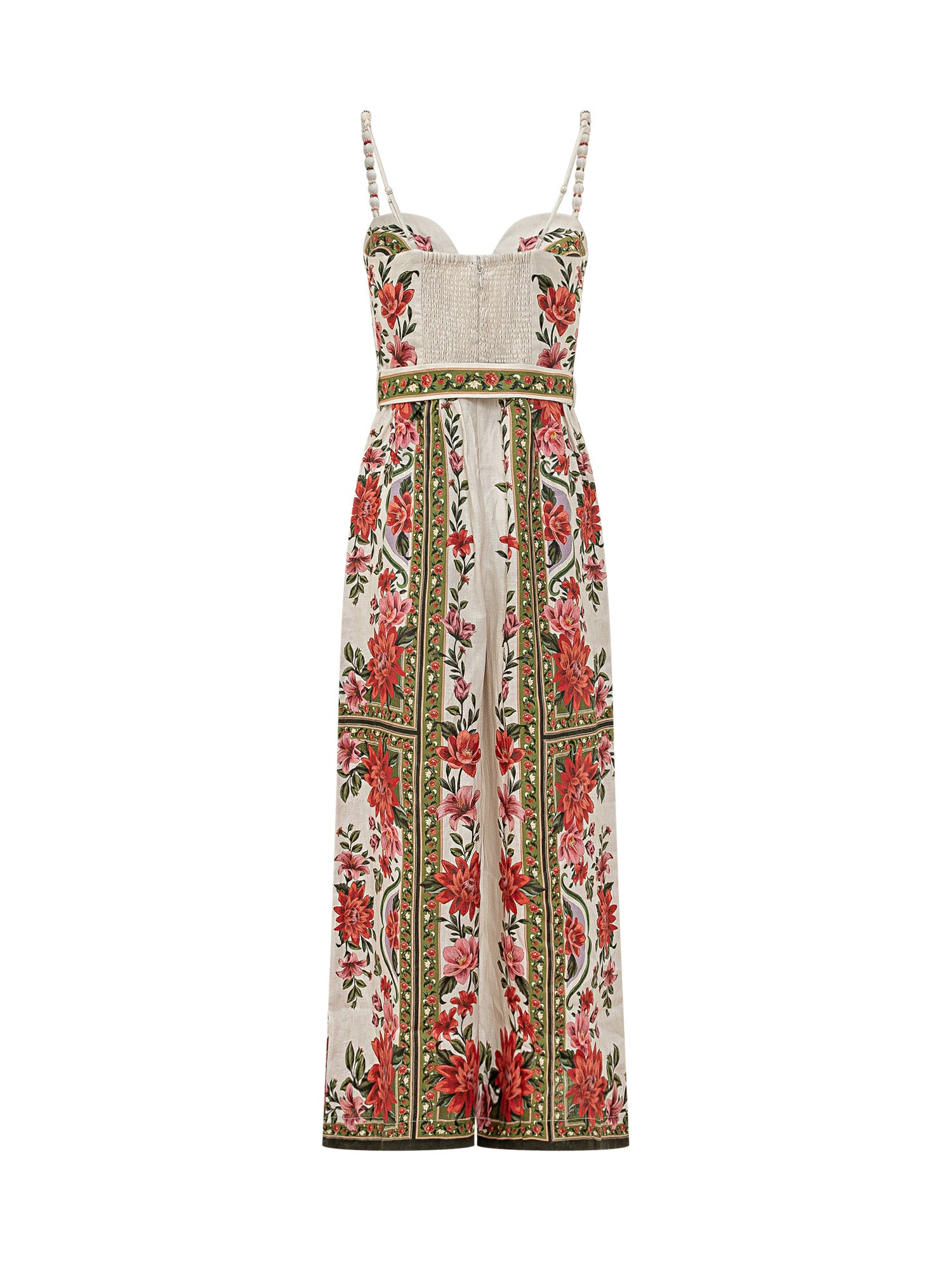 Tuta lunga con spalline sottili e stampa floreale all-over. Silhouette a bustier con cintura decorativa e gamba ampia per un effetto elegante e femminile.