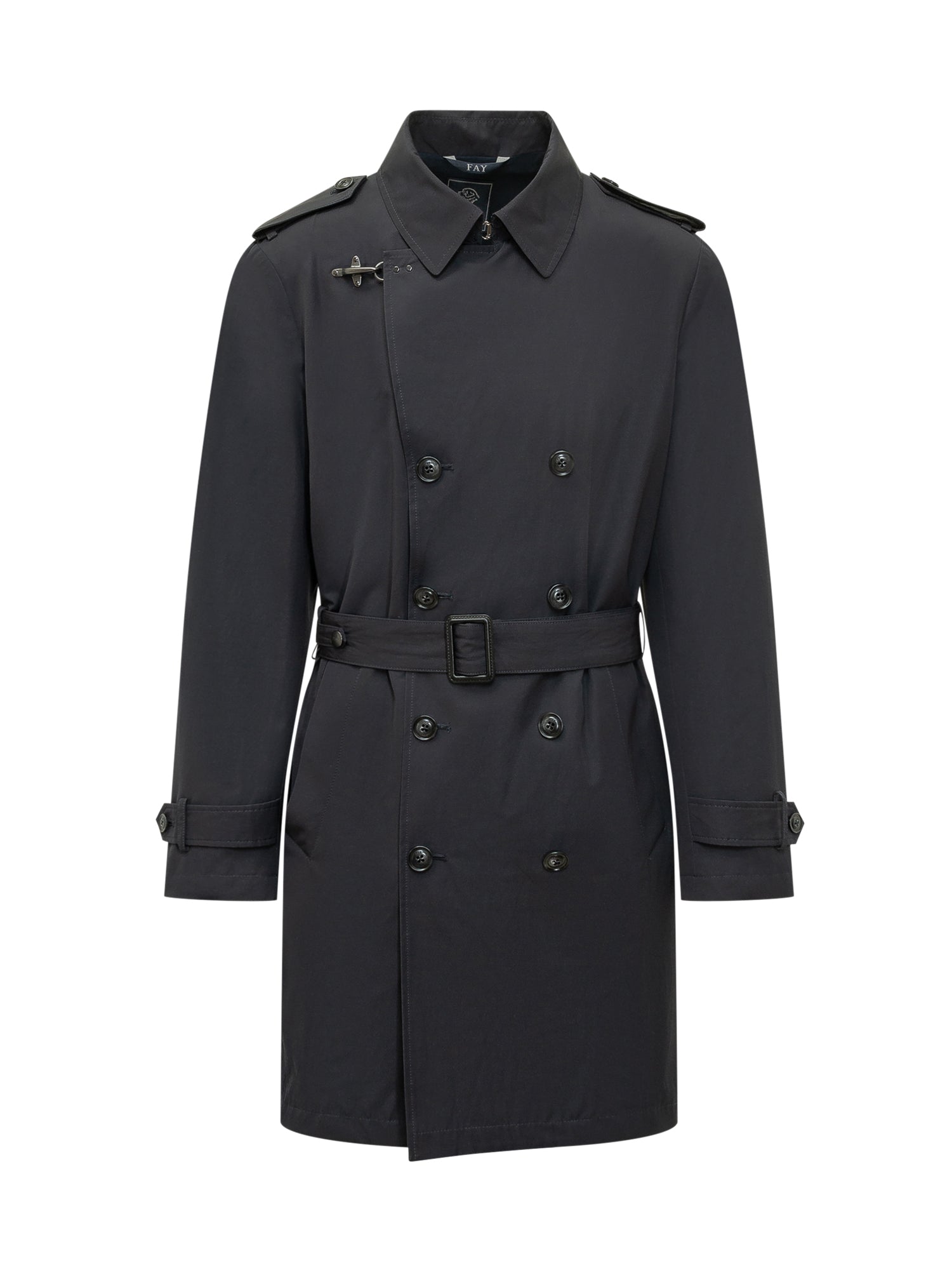 Trench regular fit con chiusura doppiopetto e cintura in vita. Colletto classico, spalline sulle spalle e cinturini ai polsi. Design strutturato con tasche laterali e dettaglio iconico sul petto.