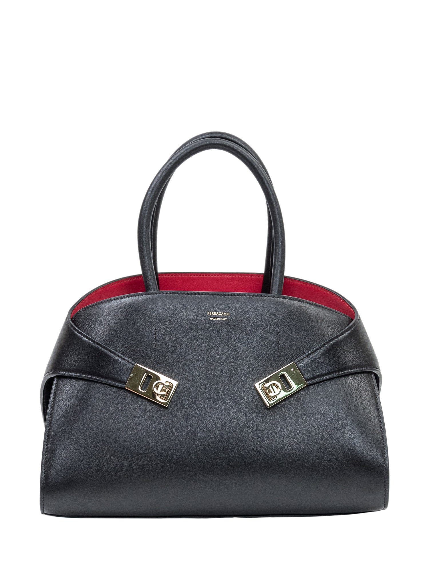 Borsa a mano dal design strutturato con doppi manici, interno a contrasto e chiusure metalliche frontali. Un modello elegante e funzionale.