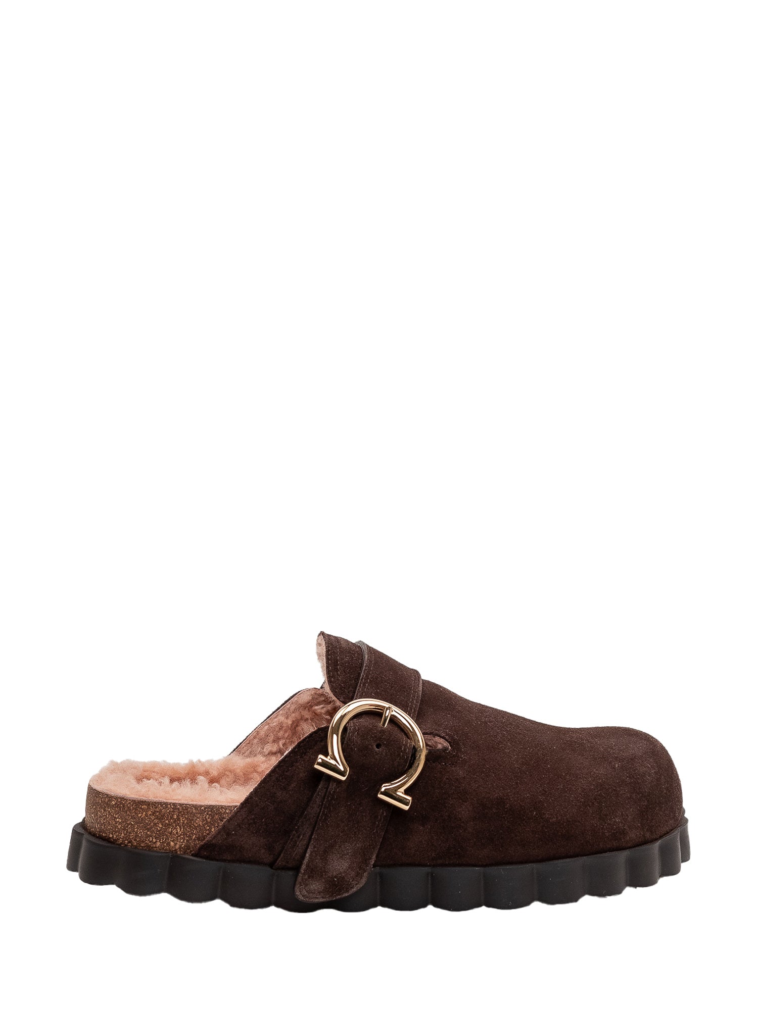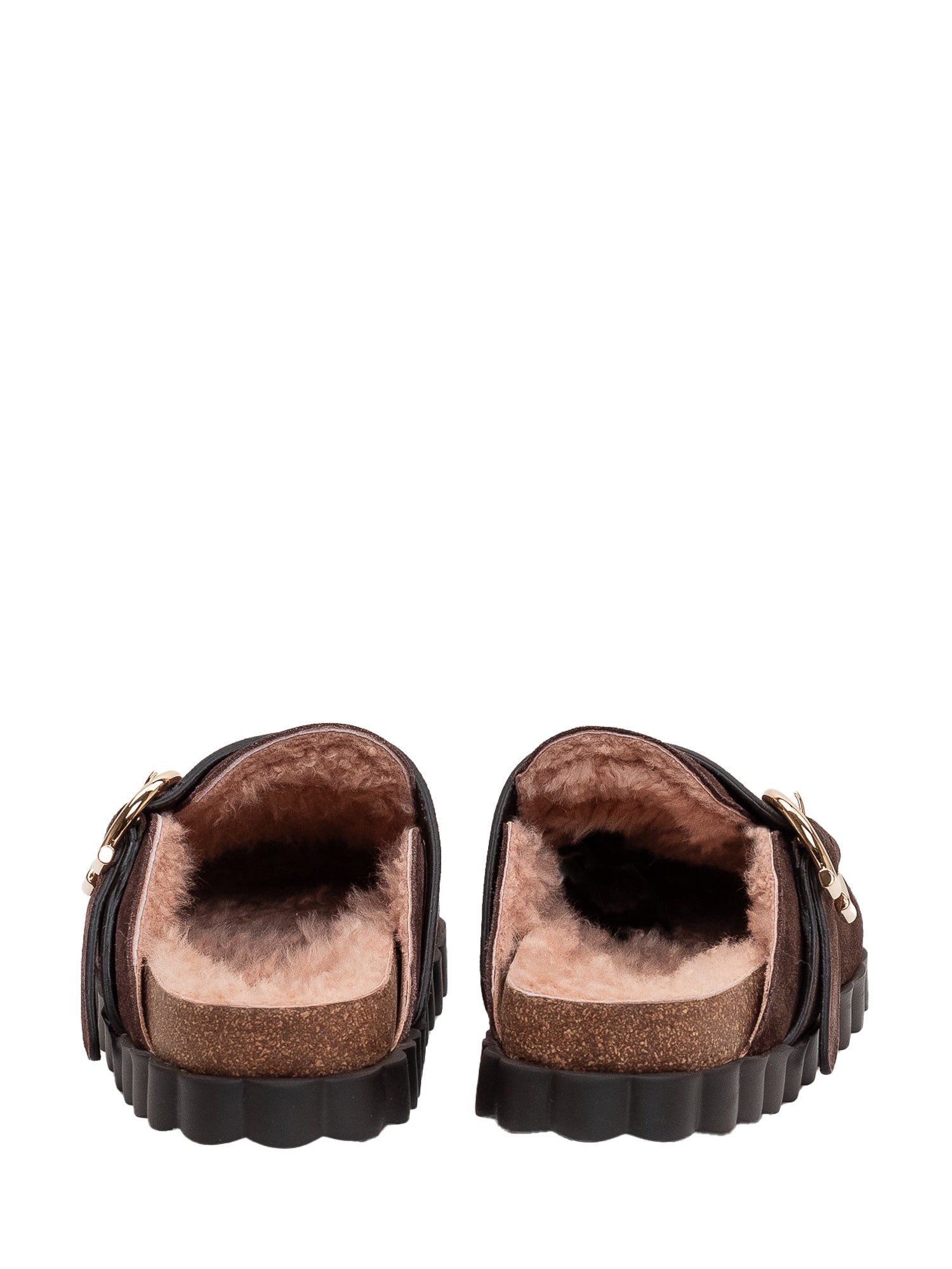 Sabot in pelle scamosciata con interno morbido effetto shearling e dettaglio fibbia iconica. Suola robusta e silhouette avvolgente.Taglia di riferimento: US