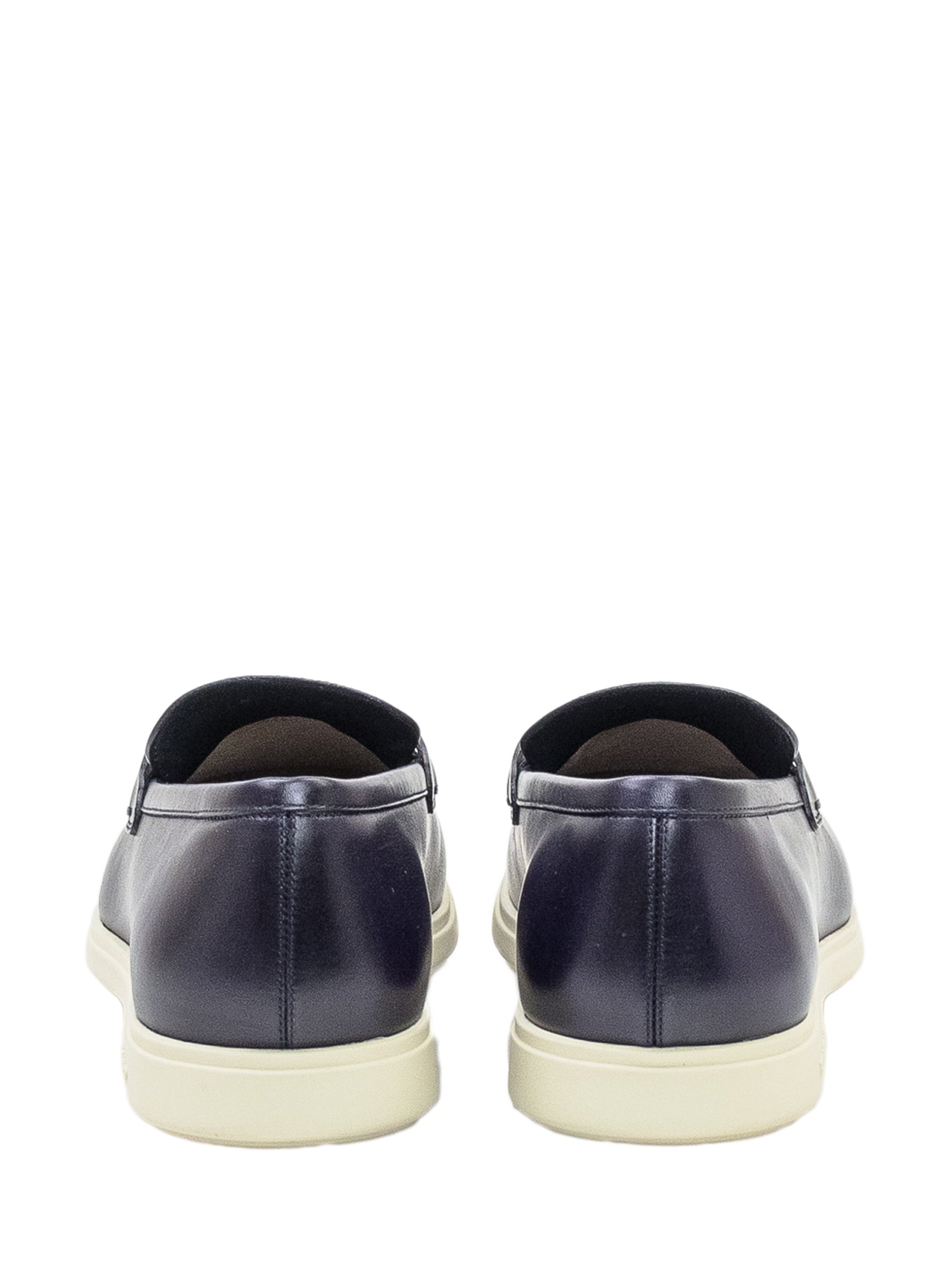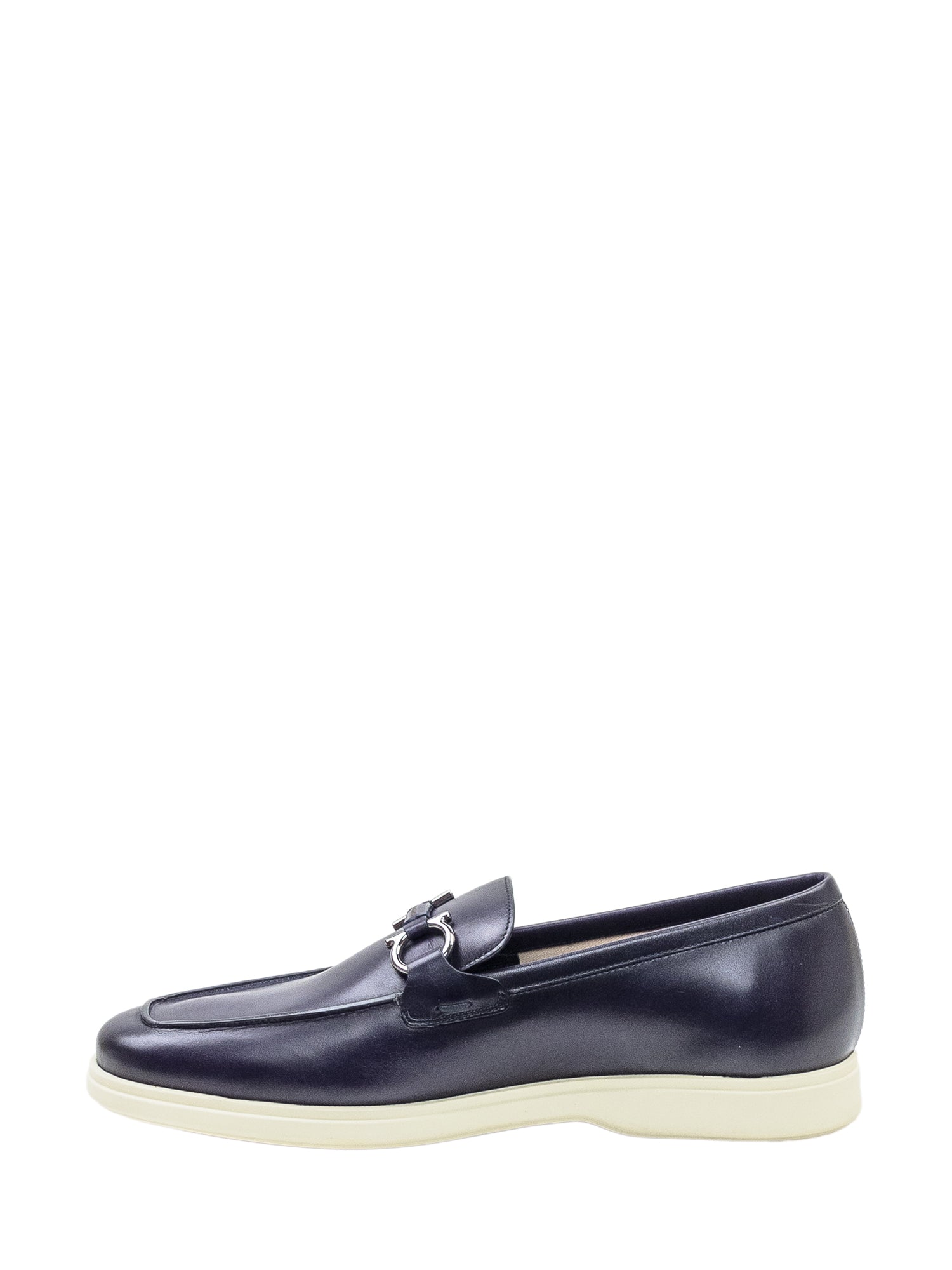 Mocassini in pelle con dettaglio metallico frontale e suola leggera a contrasto.