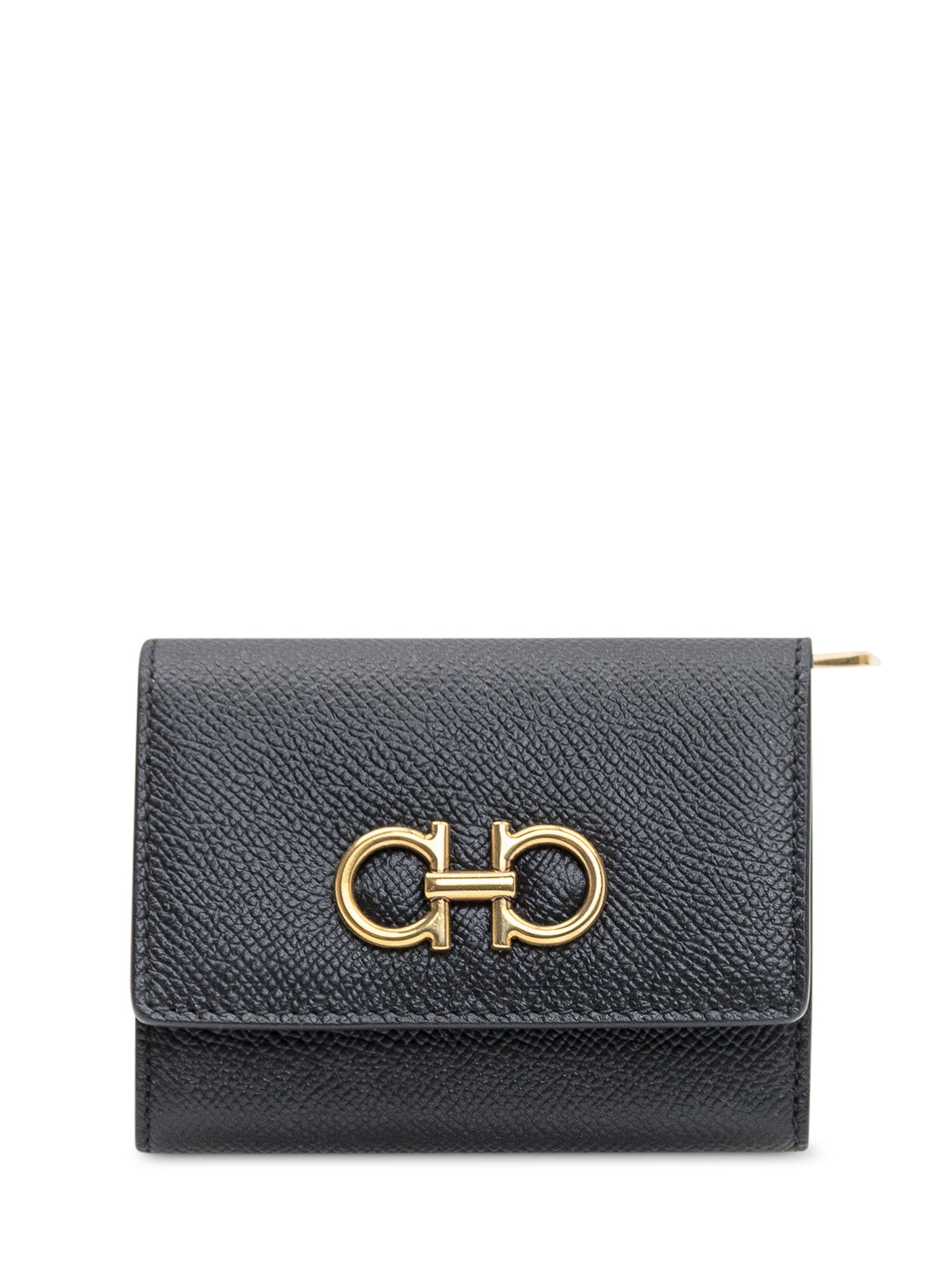 Portafoglio trifold compatto in pelle martellata con iconica chiusura metallica. Design elegante e funzionale con scomparti interni per carte e banconote.Dimensioni: 10x8x3