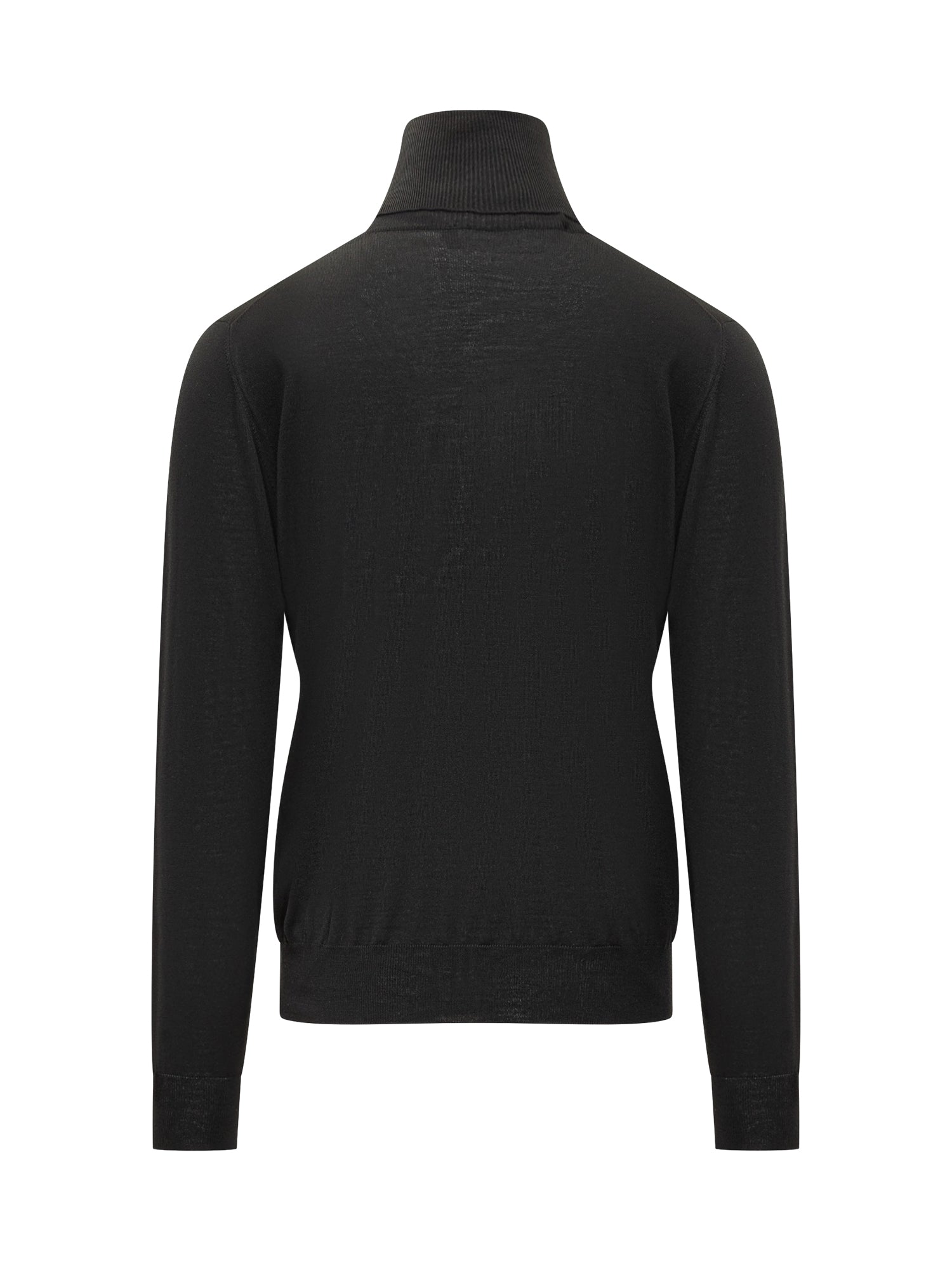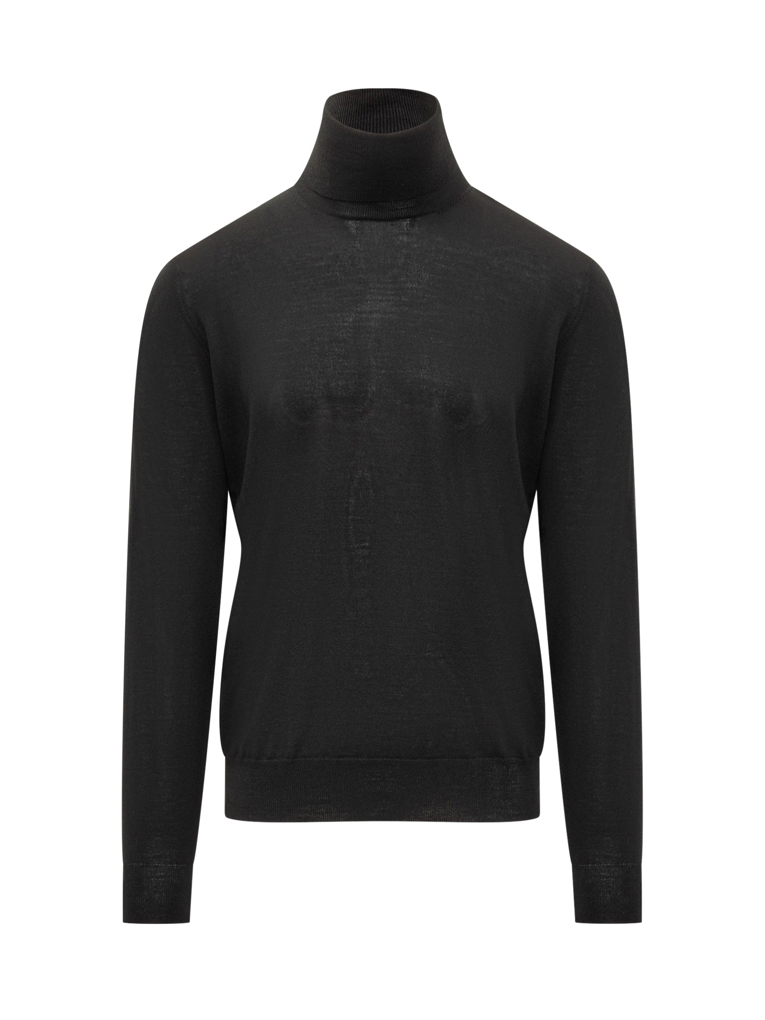 Dolcevita Filippo De Laurentiis in filato fine nero con linea pulita e vestibilità morbida.
