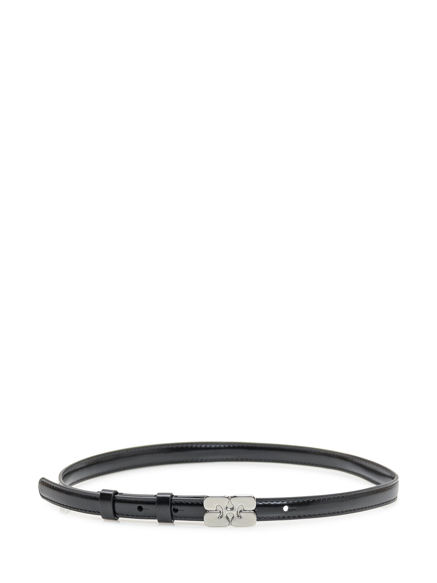 Cintura sottile in pelle con fibbia metallica iconica, rifinita con profilo lucido e chiusura regolabile.
