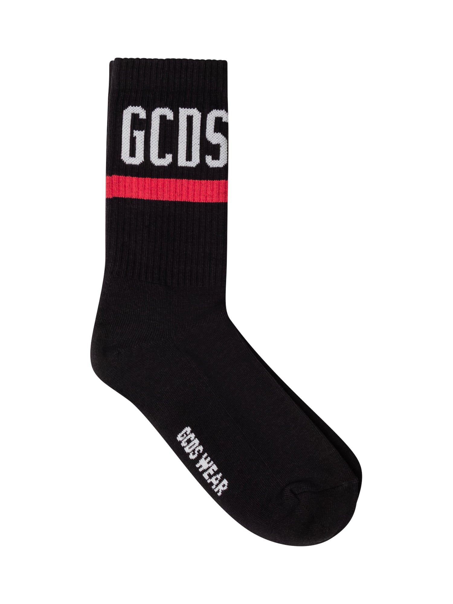 Calzini neri a coste con logo GCDS a contrasto bianco e banda orizzontale rossa. Realizzati in morbido cotone elasticizzato, garantiscono comfort e vestibilità aderente. Il dettaglio 2023 WEAR sotto la pianta aggiunge un tocco distintivo e contemporaneo al design.