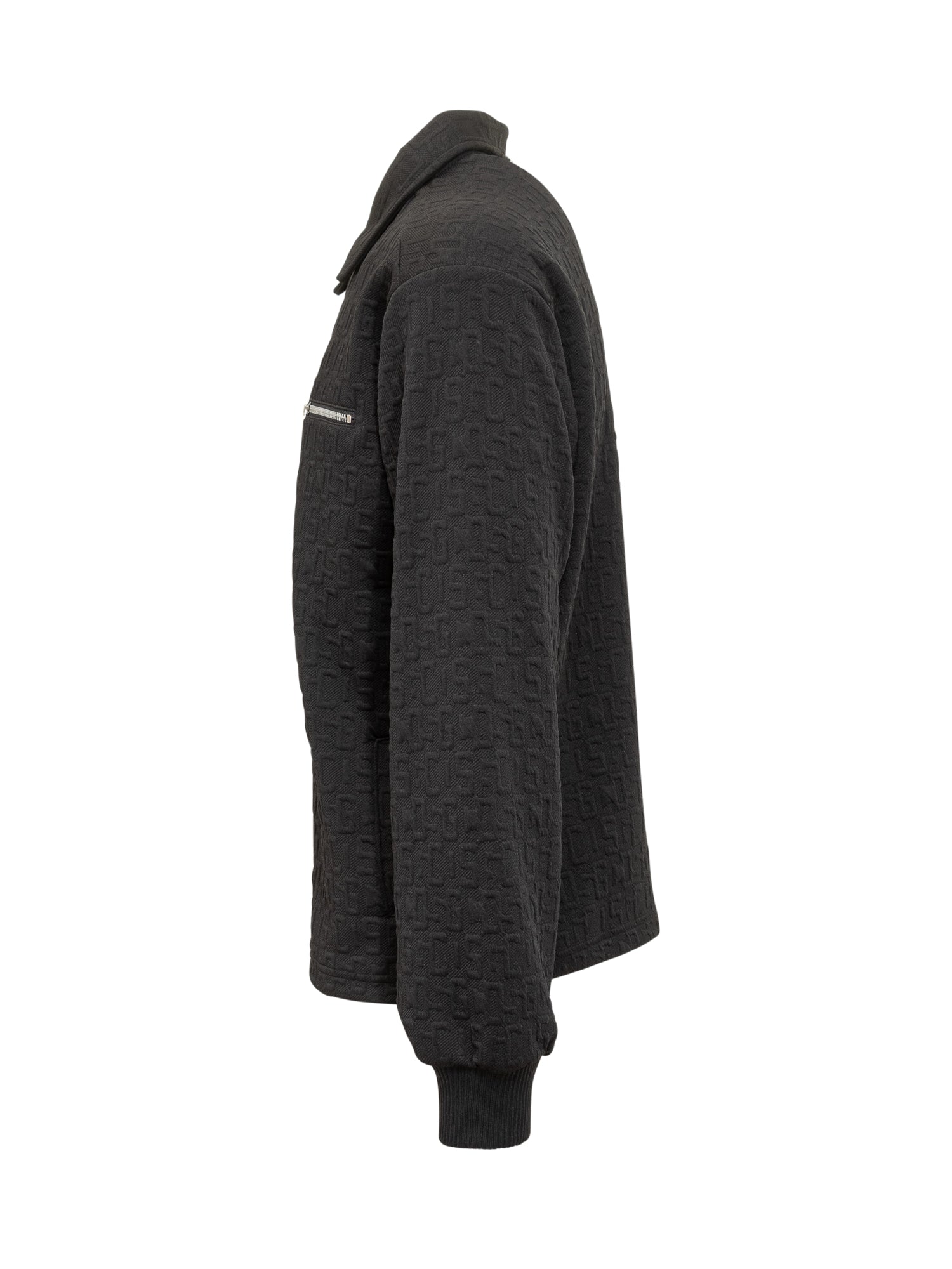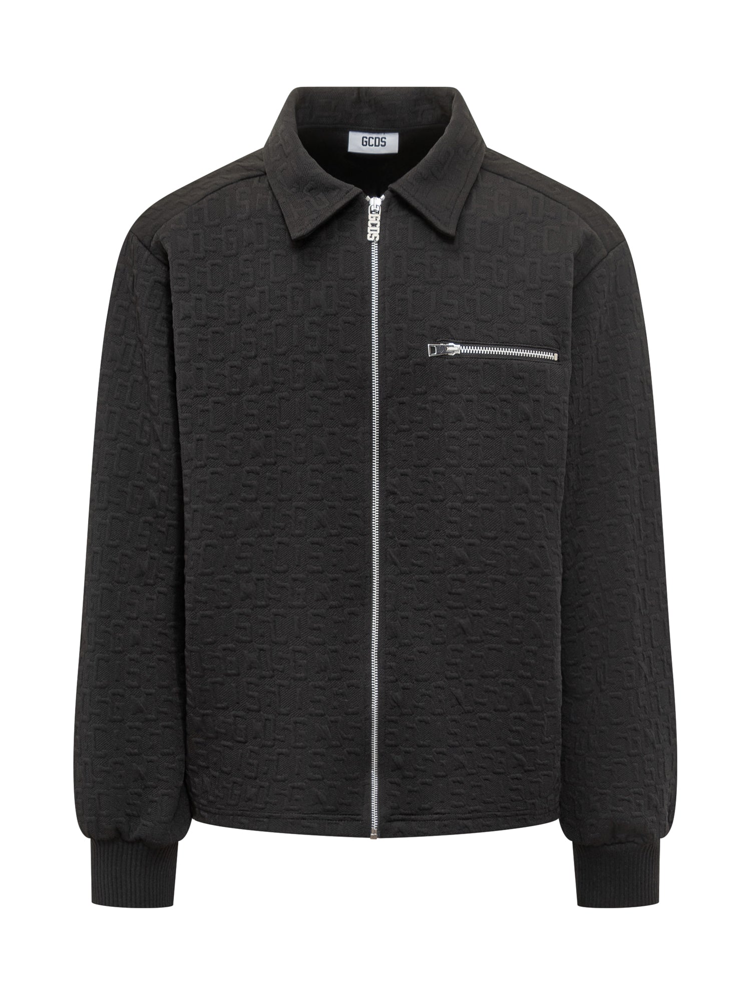 Giacca nera GCDS con chiusura a zip e taschino frontale. Il tessuto presenta logo monogram in rilievo tono su tono.