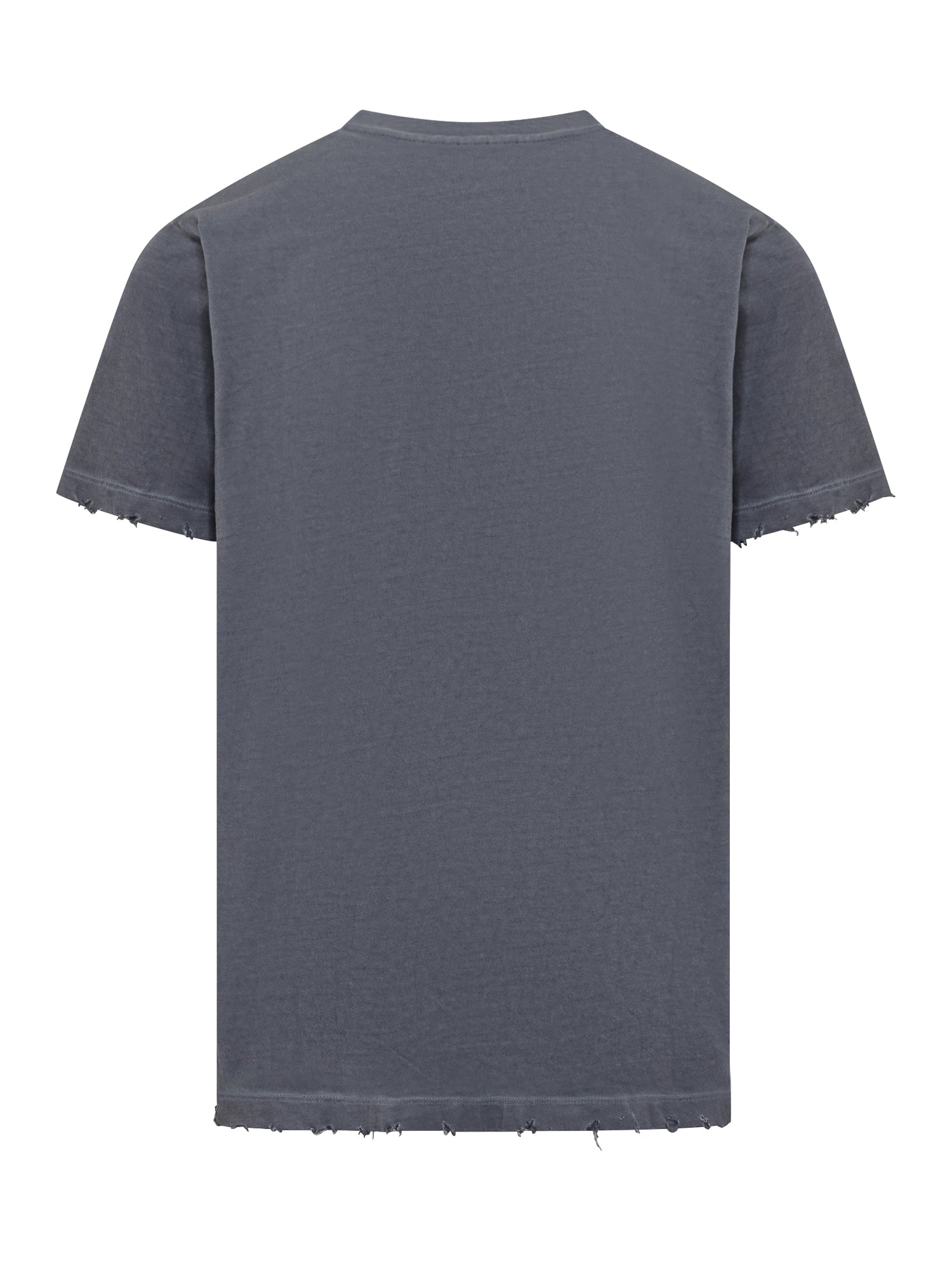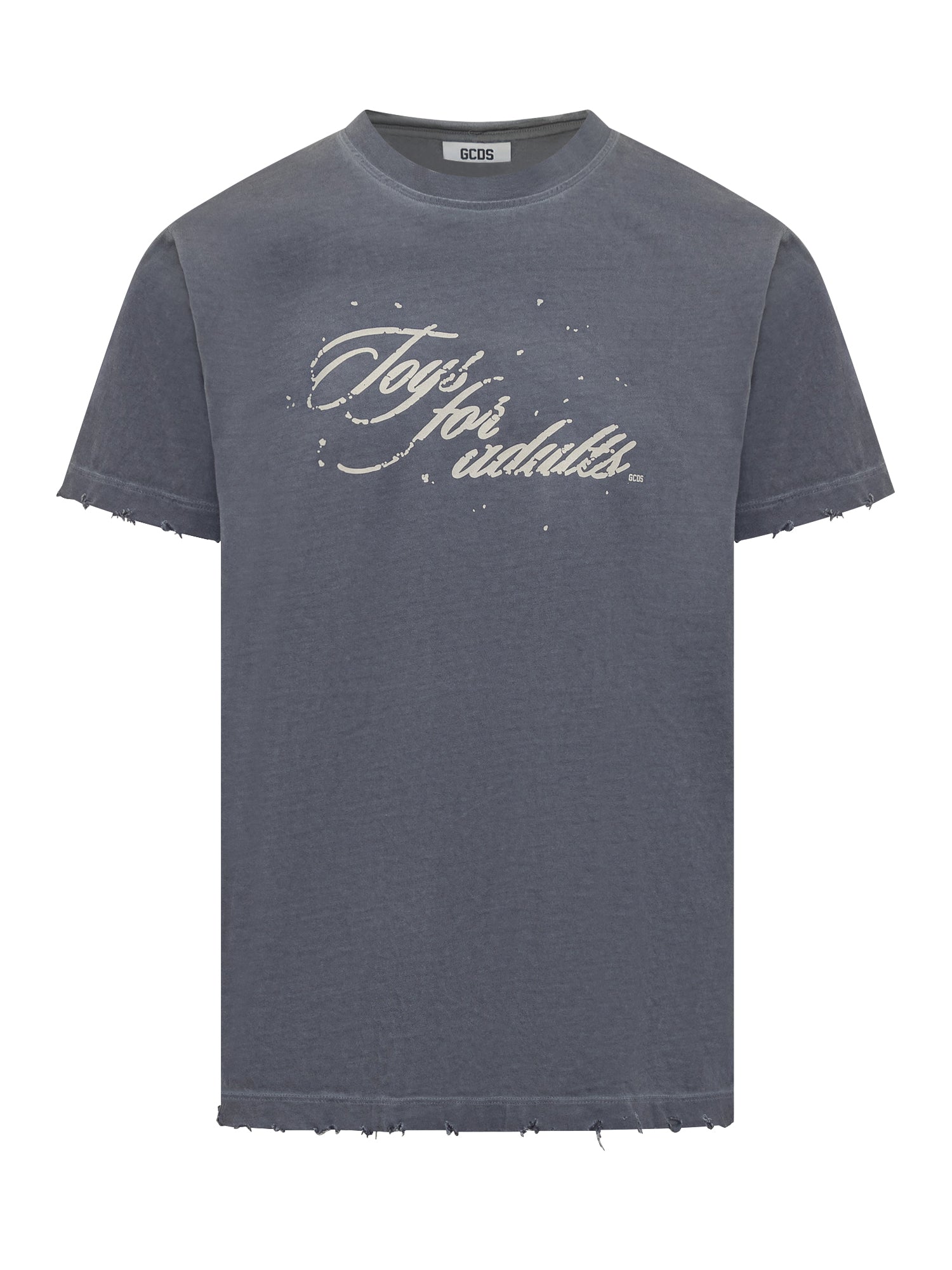 T-shirt GCDS in cotone grigio effetto washed con stampa frontale Toys for Adults e bordi sfrangiati.
