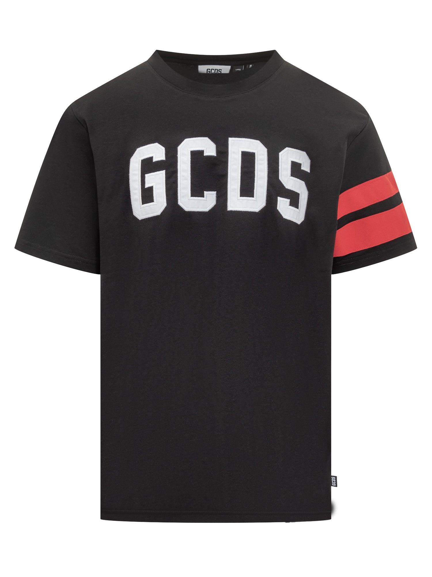 T-shirt GCDS in cotone nero con maxi logo bianco sul petto e bande rosse a contrasto sulla manica.