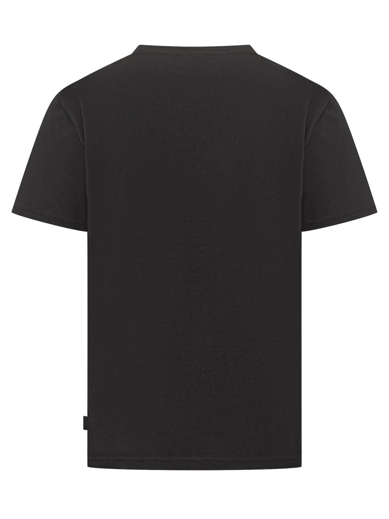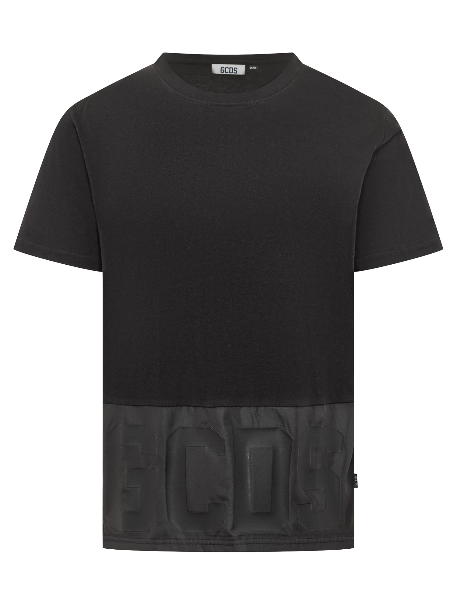 T-shirt GCDS in cotone nero con dettaglio in tessuto tecnico a contrasto e maxi logo in rilievo sul fondo.
