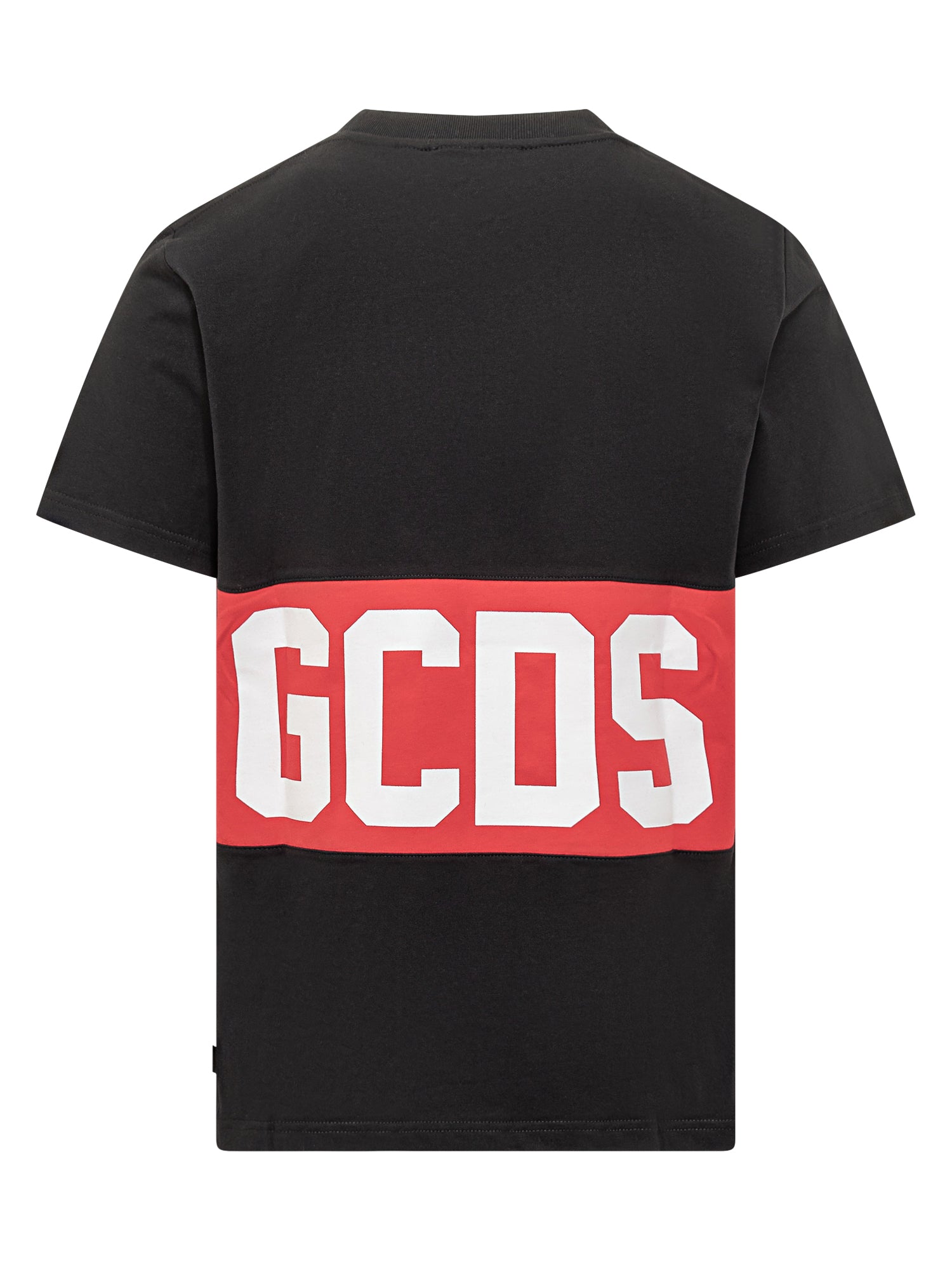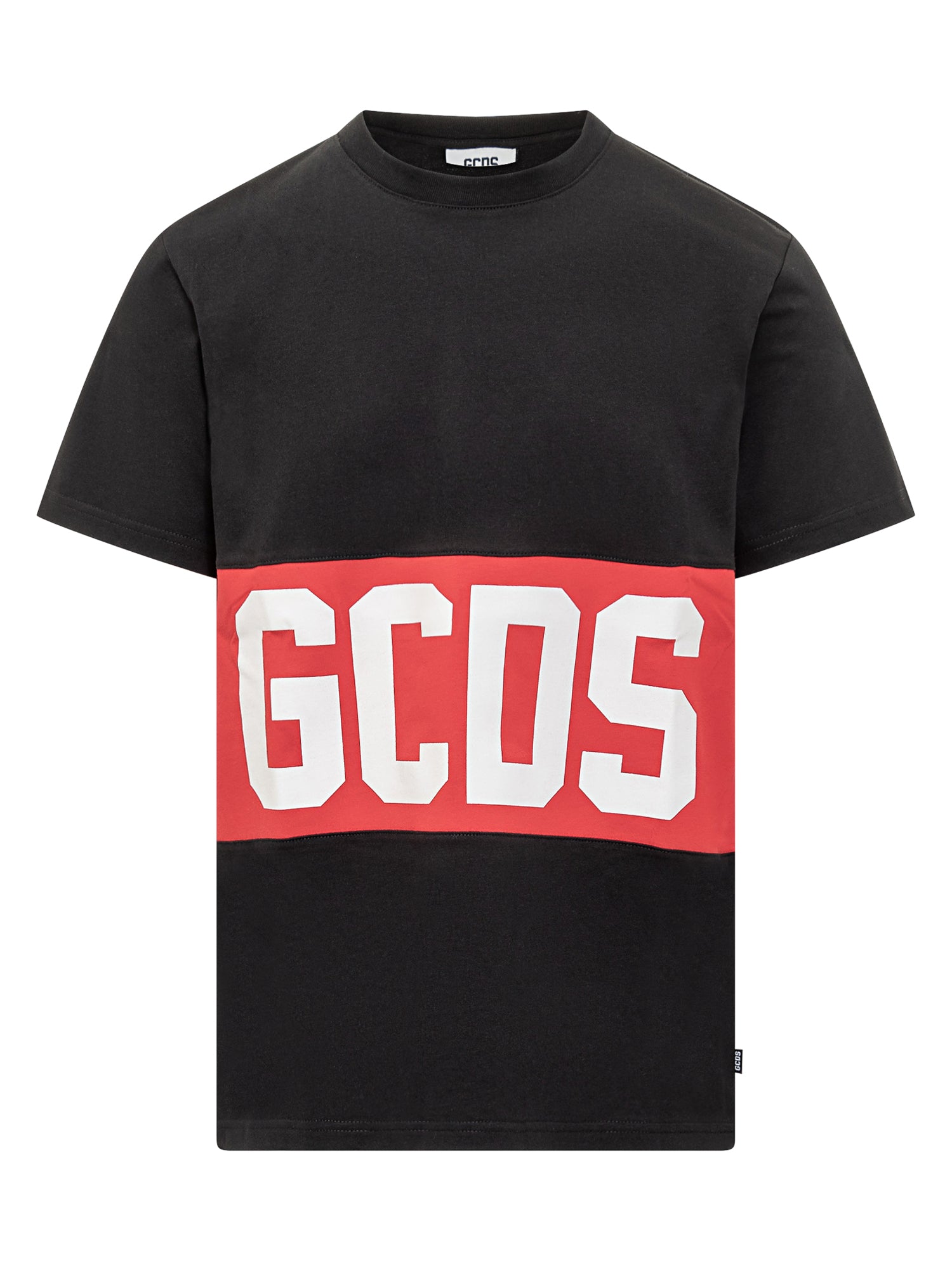 T-shirt GCDS in cotone nero con fascia rossa a contrasto e maxi logo frontale.