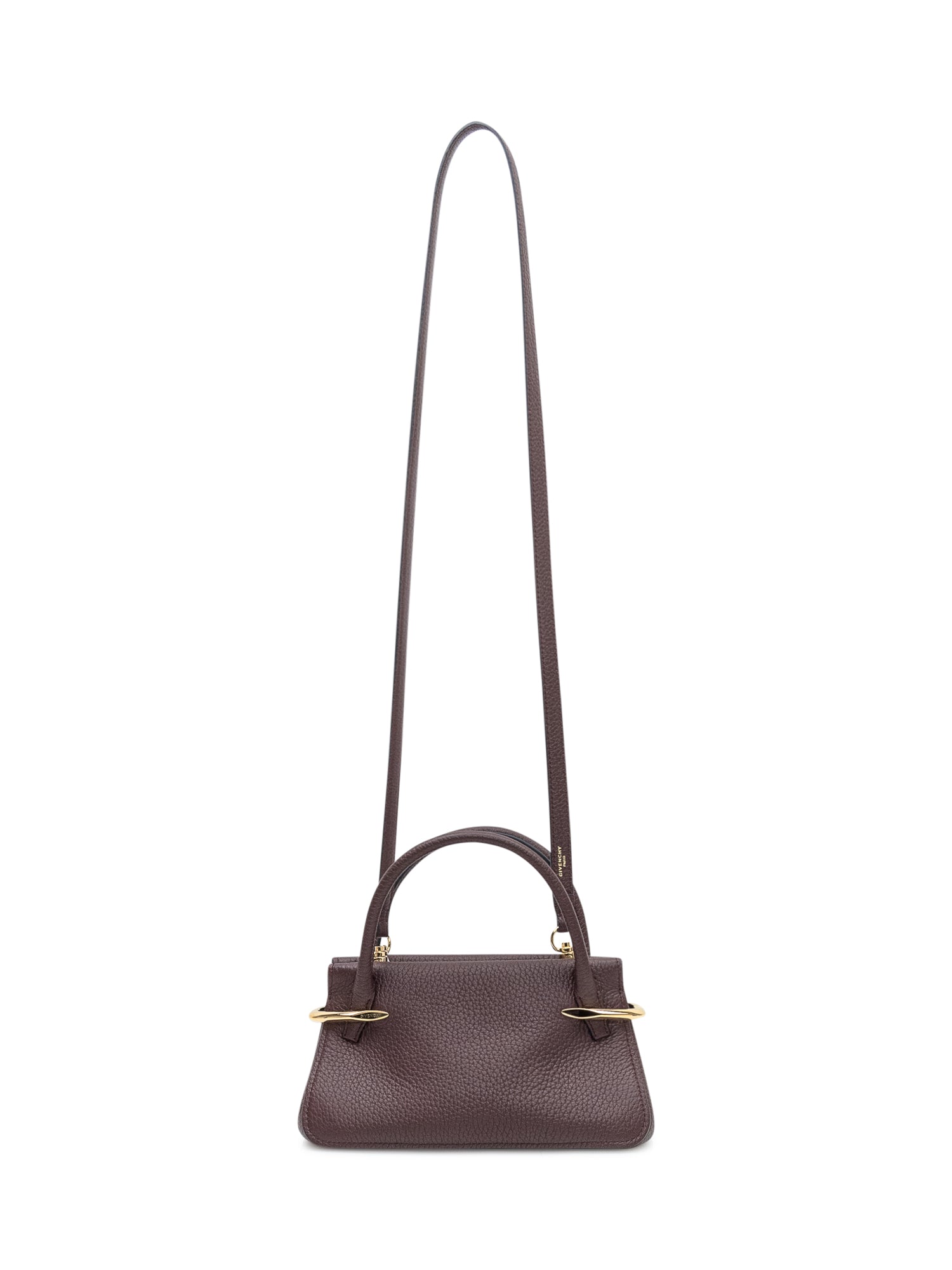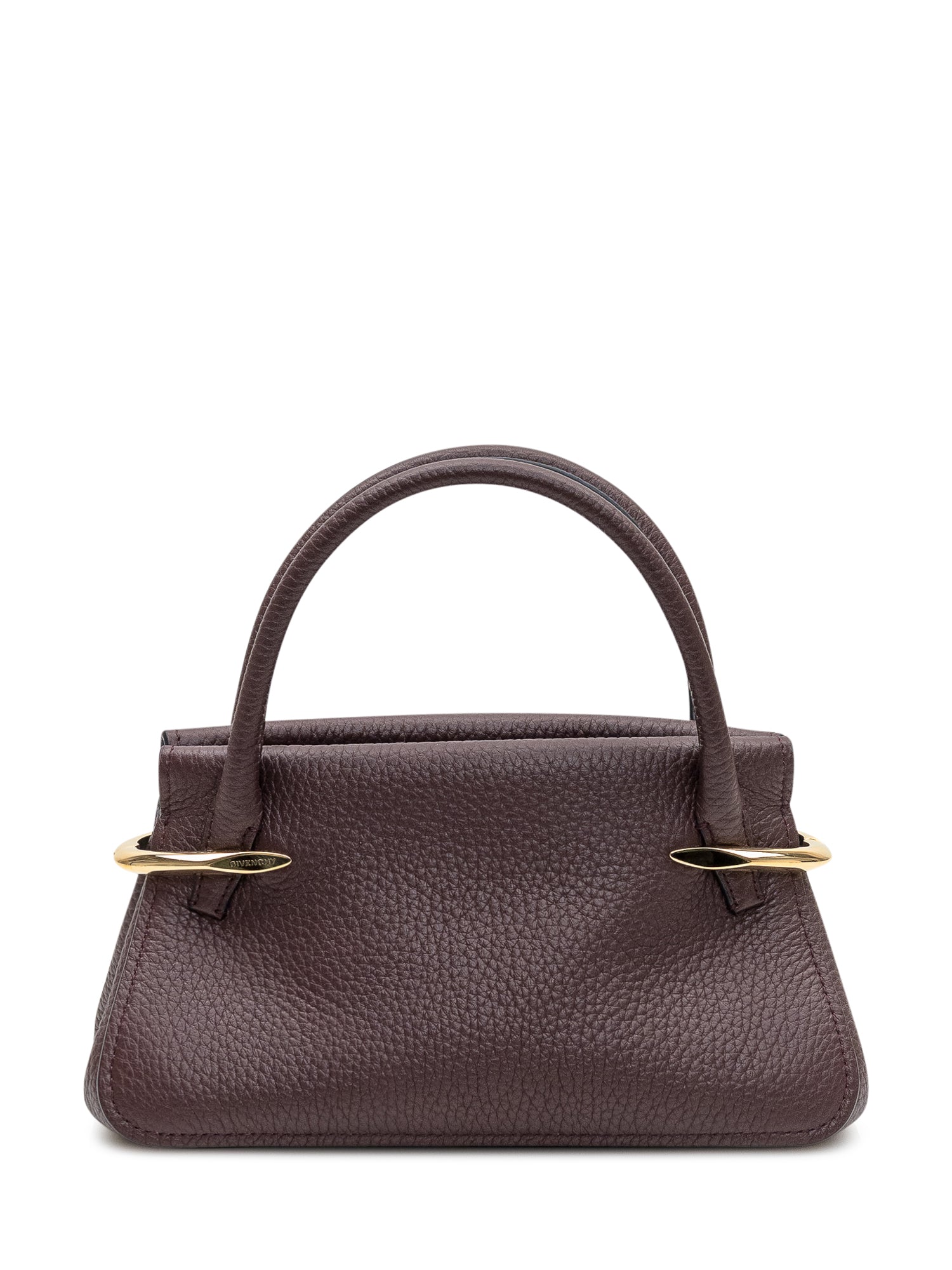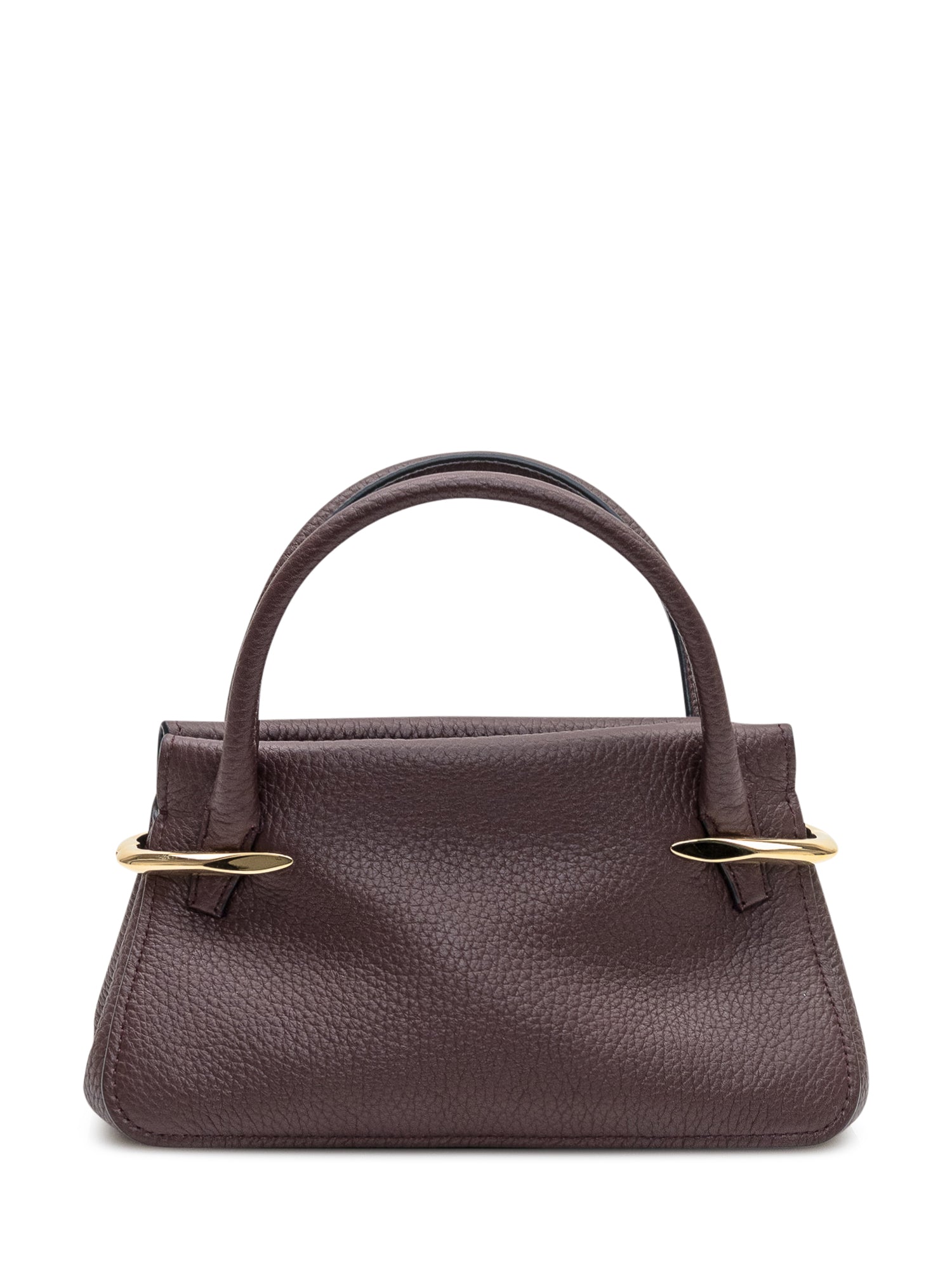 Borsa compatta in pelle martellata con silhouette strutturata e manici rigidi. Dettagli metallici eleganti e design essenziale la rendono ideale per un uso quotidiano raffinato.